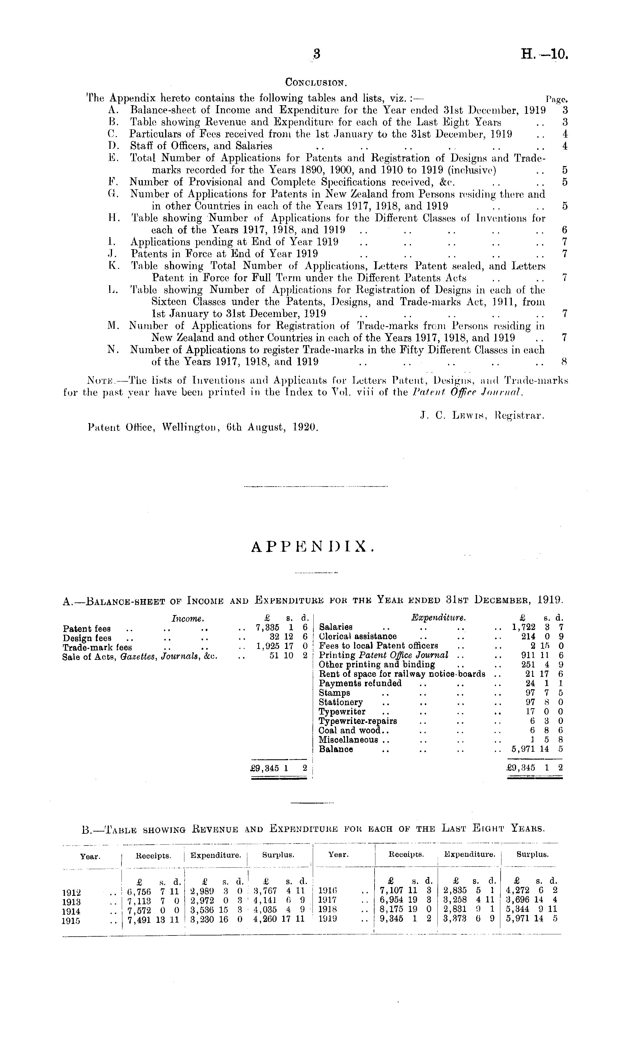 Conclusion. The Appendix hereto contains the following tables and lists, viz. : — Page. A. Balance-sheet of Income and Expenditwe for the Year ended 31st December, 1919 3 B. Tabic showing Revenue and Expenditure! for each of the Last Fight Years .. 3 C. Particulars of Fees received from the Ist January to the 31st December, 1919 . . 4 D. Staff of Officers, and Salaries .. .. .. . . . .. 4 B. Total Number of Applications for Patents and Registration of Designs arid Trademarks recorded for the Years 1890, 1900, and 1910 to 1919 (inclusive) .. 5 F. Number of Provisional and Complete Specifications received, &c, .. 5 G. Number of Applications for Patents in New Zealand from Persons residing there and in other Countries in each of the Years 1917, 1918, and 1919 .. . . 5 H. Table showing Number of Applications for the Different Classes of Inventions for each of the Years 1917, 1918, and 1919 .. .. .. .. .. 6 I. Applications pending at End of Year 1919 .. .. . . .. .. 7 J. Patents in Force at End of Year 1919 .. .. .. .. .. 7 K. Table showing Total Number of Applications, Letters Patent sealed, and Letters Patent in Force for Full Term under the Different Patents Acts . . .. 7 L. Table showing Number of Applications for Registration of Designs in each of the Sixteen Classes under the Patents, Designs, and Trade-marks Act, 1911, from Ist January to 31st December, 1919 .. .. .. . . . . 7 M. Number of Applications for Registration of Trade-marks from Persons residing in New Zealand and other Countries in each of the Years 1917, 1918, and .1919 . . 7 N. Number of Applications to register Trade-marks in the Fifty Different Classes in each of the Years 1917, 1918, and 1919 .. .. .. .. .. 8 Note.—The lists of Inventions and Applicants for Letters Patent, Designs, and Trade-marks for the past year have been printed in the Index to Vol. viii of the Patent Office Journal. J. C. Lewis, Registrar. Patent Office, Wellington, 6th August, 1920.