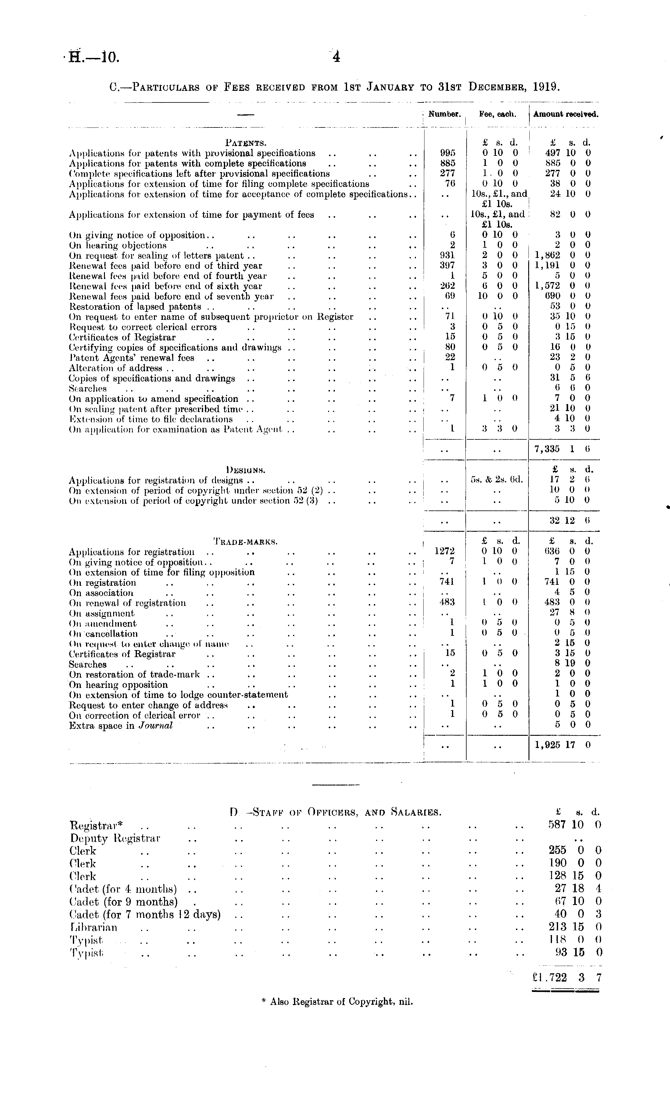 I) -Staff of Officers, a*d Salaries. £ s. d. Registrar* .. .. . . .. .. .. .. .. .. 587 10 0 Deputy Registrar Clerk ' . . . . . . . ■ • • 255 0 0 Clerk .. •• 190 0 0 Clerk .. .. .. .. .. .. 128 15 0 Cadet (for 4 months) .. .. .. .. .. .. .. .. 27 18 4 Cadet (for 9 months) . .. .. .. .. .. .. .. 67 10 0 Cadet (for 7 months 12 days) .. .. .. .. .. .. .. 40 0 .'! Librarian .. .. .. .. .. .. .. .. 213 15 0 Typist - .. .. .. .. .. .. •• •• ■• lis o o Typist .. .. .. .. .. .. .. •• •• 93 15 0 CI. 722 3 7 * Also Registrar of Copyright, nil.