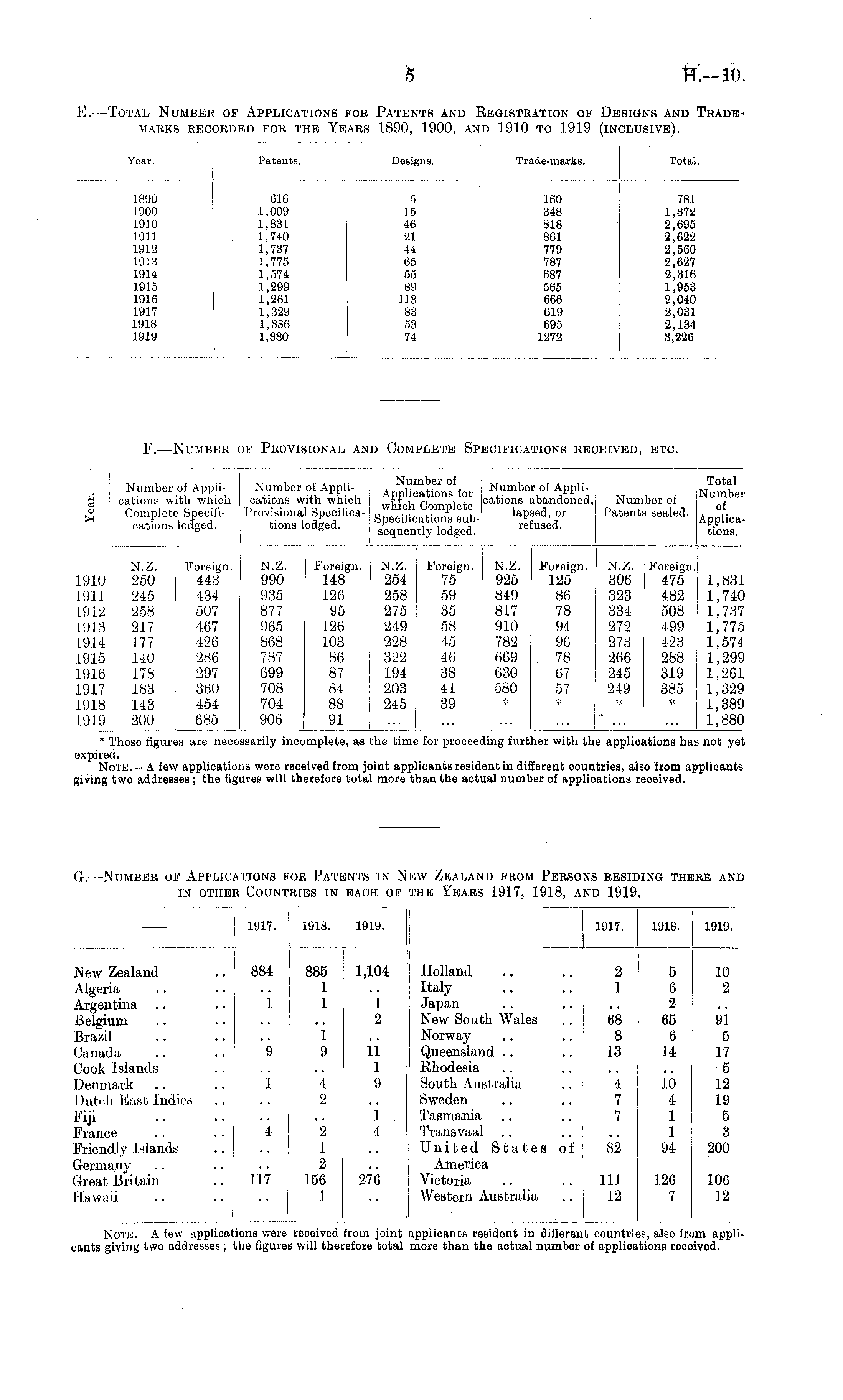 E.—Total Number of Applications for Patents and Registration of Designs and Trademarks recorded for the Years 1890, 1900, and 1910 to 1919 (inclusive).