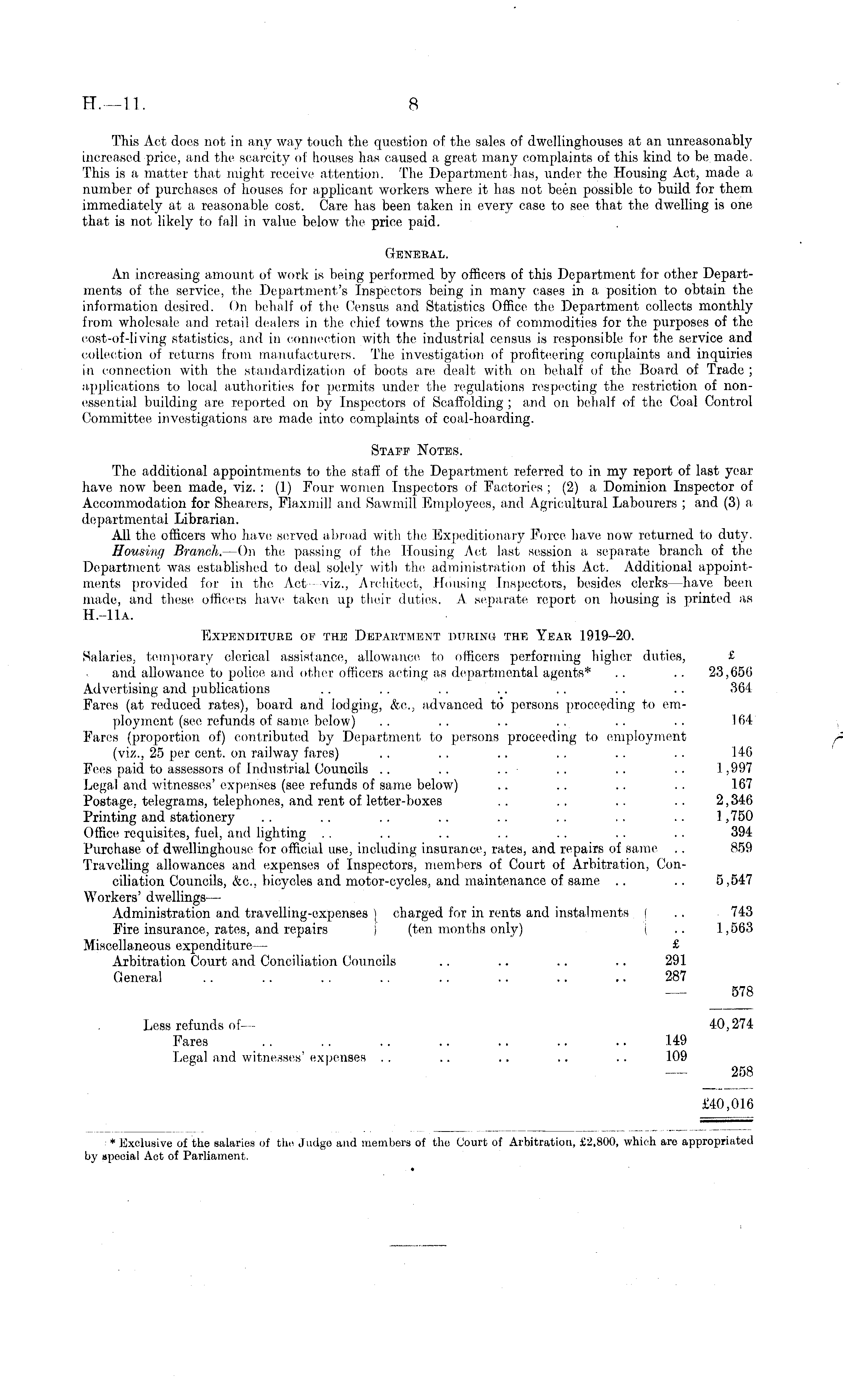 This Act does not in any way touch the question of the sales of dwellinghouses at an unreasonably increased price, and the scarcity of houses has caused a great many complaints of this kind to be made. This is a matter that might receive attention. The Department lias, under the Housing Act, made a, number of purchases of houses for applicant workers where it has not been possible to build for them immediately at a reasonable cost. Care has been taken in every case to see that the dwelling is one that is not likely to fall in value below the price paid. General. An increasing amount of work is being performed by officers of this Department for other Departments of the service, the Department's Inspectors being in many cases in a position to obtain the information desired. On behalf of the Census and Statistics Office the Department collects monthly from wholesale and retail dealers in the chief towns the prices of commodities for the purposes of the cost-of-living statistics, and in connection with the industrial census is responsible for the service and collection of returns from manufacturers. The investigation of profiteering complaints and inquiries in connection with the standardization of boots are dealt with on behalf of the Board of Trade ; applications to local authorities for permits under the regulations respecting the restriction of nonessential building are reported on by Inspectors of Scaffolding ; and on behalf of the Coal Control Committee investigations are made into complaints of coal-hoarding. Staff Notes. The additional appointments to the staff of the Department referred to in my report of last year have now been made, viz. : (1) Four women Inspectors of Factories ; (2) a Dominion Inspector of Accommodation for Shearers, Flaxmill and Sawmill Employees, and Agricultural Labourers ; and (3) a de partmental Librarian. All the officers who have served abroad with the Expeditionary Force have now returned to duty. Housing Branch. —On the passing of the Housing Act last session a, separate branch of the Department was established to deal solely with the administration of this Act. Additional appointments provided for in the Act viz., Architect, Housing Inspectors, besides clerks —have been made, and these officers have taken up their duties. A separate, report on housing is printed as H.-IU. Expenditure of the Department during the Yeah 1919-20. Salaries, temporary clerical assistance, allowance to officers performing higher duties, £ and allowance to police and other officers acting as departmental agents* .. .. 23,050 Advertising and publications .. . . . . . . . . . . .. 364 Fares (at reduced rates), board and lodging, &c, advanced to persons proceeding to employment (see refunds of same below) . . . . . . . . . . . . 104 Fares (proportion of) contributed by Department to persons proceeding to employment (viz., 25 per cent, on railway fares) . . .. .. . . .. . . 146 Fees paid to assessors of Industrial Councils . . .. . . . . .. .. 1,997 Legal and witnesses'expenses (see refunds of same below) .. .. .. .. 167 Postage, telegrams, telephones, and rent of letter-boxes . . .. .. .. 2, 346 Printing and stationery .. .. .. .. .. .. .. .. 1,750 Office requisites, fuel, and lighting . . .. .. .. . . . . .. 394 Purchase of dwellinghouse for official use, including insurance, rates, and repairs of same .. 859 Travelling allowances and expenses of Inspectors, members of Court of Arbitration, Conciliation Councils, &c, bicycles and motor-cycles, and maintenance of same .. . . 5,547 Workers' dwellings— Administration and travelling-expenses ) charged for in rents and instalments f . . 743 Fire insurance, rates, and repairs (ten months only) ( .. 1,563 Miscellaneous expenditure — £ Arbitration Court and Conciliation Councils .. .. .. .. 291 General .. .. .. .. .. .. .. .. 287 578 Less refunds of— 40,274 Fares .. .. .. .. .. .. .. 149 Legal and witnesses' expenses . . . . .. . . . . 109 258 £40,016