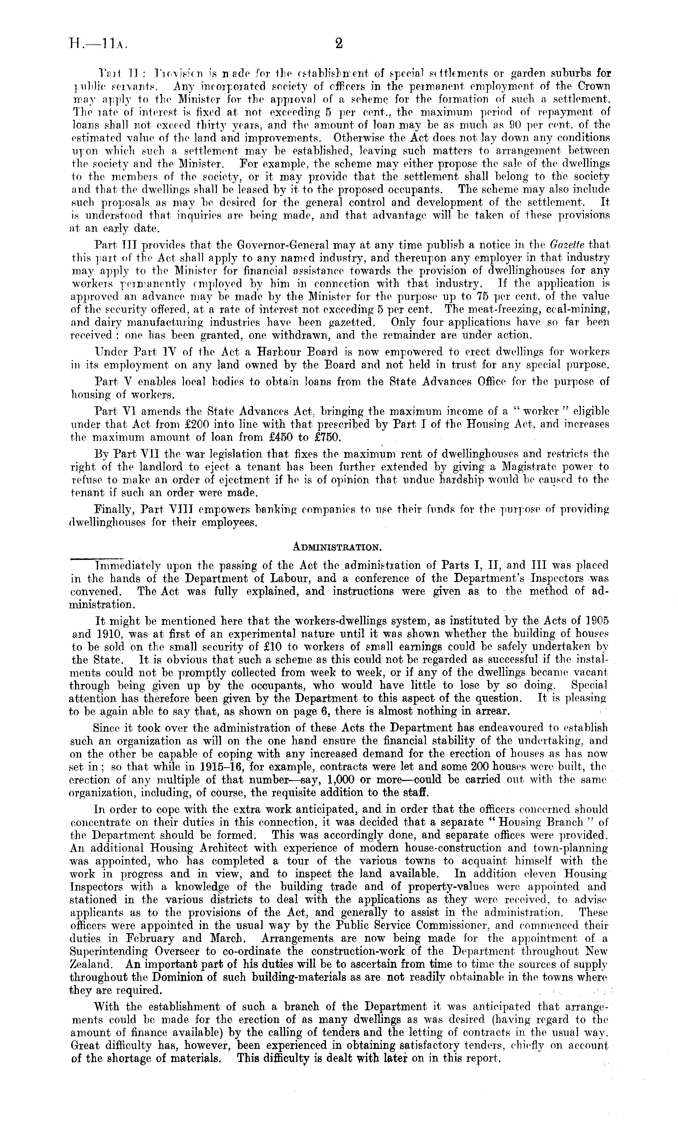 Tart II : Frovieicn is n ade for the establislnccjit of special settlements or garden suburbs for public servants. Any incorporated society of officers in the permanent employment of the Crown may apply to the Minister for the approval of a scheme for the formation of such a settlement. The rate of interest is fixed at not exceeding 5 per cent., the maximum period of repayment of loans shall not exceed thirty years, and the amount of loan may be as much as 90 per cent, of the estimated value of the land and improvements. Otherwise the Act does not lay down any conditions upon which such a settlement may be established, leaving such matters to arrangement between the society and the Minister. For example, the scheme may either propose the sale of the dwellings to the members of the society, or it may provide that the settlement shall belong to the society and that the dwellings shall be leased by it to the proposed occupants. The scheme may also include such proposals as may be desired for the general control and development of the settlement. It is understood that inquiries are being made, and that advantage will be taken of these provisions at an early date. Part 111 provides that the Governor-General may at any time publish a notice in the Gazette that this part of the Act shall apply to any named industry, and thereupon any employer in that industry may appl} T to the Minister for financial assistance towards the provision of dwellinghouses for any workers permanently employed by him in connection, with that industry. If the application is approved an advance may be made by the Minister for the purpose up to 75 per cent, of the value of the security offered, at a rate of interest not exceeding 5 per cent. The meat-freezing, ccal-mining, and dairy manufacturing industries have been gazetted. Only four applications have so far been received : one has been granted, one withdrawn, and the remainder are under action. Under Part IV of the Act a Harbour Board is now empowered to erect dwellings for workers in its employment on any land owned by the Board and not held in trust for any special purpose. Part V enables local bodies to obtain loans from the State Advances Office for the purpose of housing of workers. Part VI amends the State Advances Act. bringing the maximum income of a " worker " eligible under that Act from £200 into line with that prescribed by Part I of the Housing Act, and increases the maximum amount of loan from £450 to £750. By Part VII the war legislation that fixes the maximum rent of dwellinghouses and restricts the right of the landlord to eject a tenant has been further extended by giving a Magistrate power to refuse to make an order of ejectment if he is of opinion that undue hardship would be caused to the tenant if such an order were made. Finally, Part VIII empowers banking companies to use their funds for the purpose of providing dwellinghouses for their employees. Administration. Immediately upon the passing of the Act the administration of Parts I, 11, and 111 was placed in the hands of the Department of Labour, and a conference of the Department's Inspectors was convened. The Act was fully explained, and instructions were given as to the method of administration. It might be mentioned here that the workers-dwellings system, as instituted by the Acts of 1905 and 1910, was at first of an experimental nature until it was shown whether the building of houses to be sold on the small security of £10 to workers of small earnings could be safely undertaken by the State. It is obvious that such a scheme as this could not be regarded as successful if the instalments could not be promptly collected from week to week, or if any of the dwellings became vacant through being given up by the occupants, who would have little to lose by so doing. Special attention has therefore been given by the Department to this aspect of the question. It is pleasing to be again able to say that, as shown on page 6, there is almost nothing in arrear. Since it took over the administration of these Acts the Department has endeavoured to establish such an organization as will on the one hand ensure the financial stability of the undertaking, and on the other be capable of coping with any increased demand for the erection of houses as has now set in; so that while in 1915-16, for example, contracts were let and some 200 houses were built, the erection of any multiple of that number—say, 1,000 or more—could be carried out with the same organization, including, of course, the requisite addition to the staff. In order to cope with the extra work anticipated, and in order that the officers concerned should concentrate on their duties in this connection, it was decided that a separate " Housing Branch " of the Department should be formed. This was accordingly done, and separate offices were provided. An additional Housing Architect with experience of modern house-construction and town-planning-was appointed, who has completed a tour of the various towns to acquaint himself with the work in progress and in view, and to inspect the land available. In addition eleven Housing Inspectors with a knowledge of the building trade and of property-values were appointed and stationed in the various districts to deal with the applications as they were received, to advise applicants as to the provisions of the Act, and generally to assist in the administration. These officers were appointed in the usual way by the Public Service Commissioner, and commenced their duties in February and March. Arrangements are now being made for the appointment of a Superintending Overseer to co-ordinate the construction-work of the Department throughout New Zealand. An important part of his duties will be to ascertain from time to time the sources of supplythroughout the Dominion of such building-materials as are not readily obtainable in the towns where they are required. -I With the establishment of such a branch of the 
