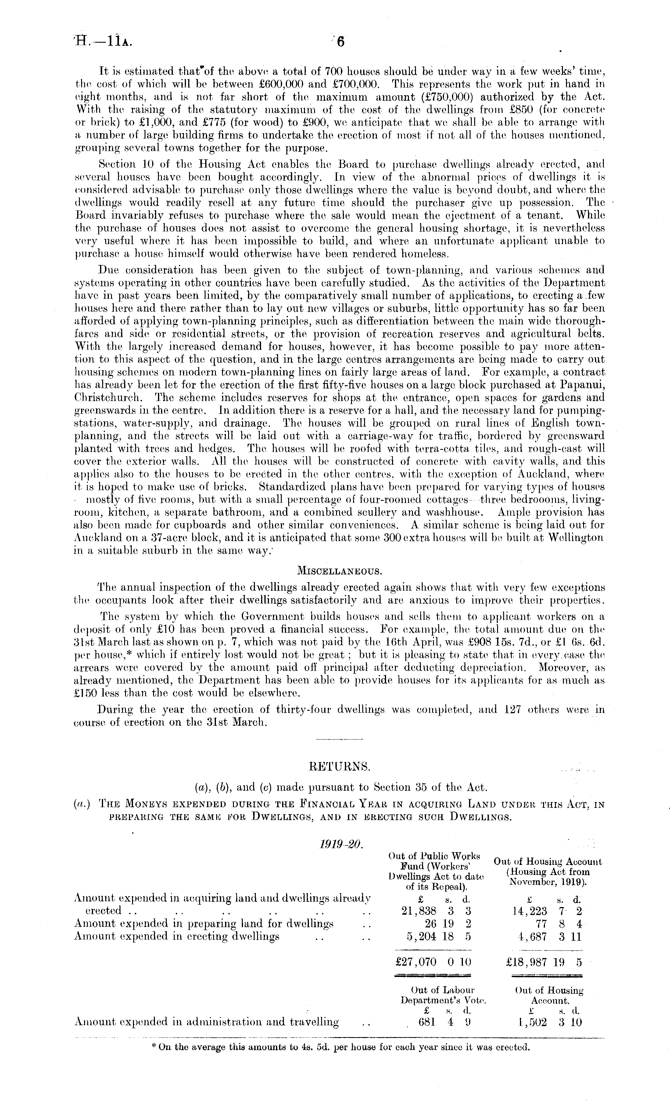 It is estimated that'of the above, a total of 700 houses should be, under way in a few weeks' time, the cost of which will be between £600,000 and £700,000. This represents the work put in hand in eight months, and is not far short of the maximum amount (£750,000) authorized by the Act. With the raising of the statutory maximum of the cost of the dwellings from £850 (for concrete or brick) to £1,000, and £775 (for wood) to £900, we. anticipate that we shall be able to arrange with a number of large building firms to undertake the erection of most if not all of the houses mentioned, grouping several towns together for the purpose. Section 10 of the, Housing Act enables the Board to purchase dwellings already erected, and several houses have been bought accordingly. In view of the abnormal prices of dwellings it is considered advisable to purchase only those dwellings where the value is beyond doubt, and where the dwellings would readily resell at any future time should the purchaser give up possession. The, Board invariably refuses to purchase where the sale would mean the ejectment of a tenant. While the purchase of houses does not assist to overcome the general housing shortage, it is nevertheless very useful where it has been impossible to build, and where an unfortunate, applicant unable to purchase a house, himself would otherwise have been rendered homeless. Due consideration has been given to the subject of town-planning, and various schemes and systems operating in other countries have been carefully studied. As tin; activities of the, Department have in past years been limited, by the comparatively small number of applications, to erecting a.few houses here and there rather than, to lay out new villages or suburbs, little, opportunity has so far been afforded of applying town-planning principles, such as differentiation between the main wide thoroughfares and side, or residential streets, or the provision of recreation reserves and agricultural belts. With the largely increased demand for houses, however, it has become, possible to pay more attention to this aspect of the question, and in the large centres arrangements are being made to carry out housing schemes on modern town-planning lines on fairly large areas of land. For example, a contract has already been let for the erection of the first fifty-five houses on a large block purchased at Papanui, Christchurch. The scheme includes reserves for shops at the entrance, open spaces for gardens and greenswards in the centre. In addition there is a reserve for a hall, and tin; necessary land for pumpingstations, water-supply, and drainage. The houses will be grouped on rural lines of English townplanning, and the streets will be laid out with a carriage-way for traffic, bordered by greensward planted with trees and hedges. The houses will Ik; roofed with terra-cotta tiles, and rough-cast will cover the exterior walls. All the houses will be constructed of concrete with cavity walls, and this applies also to the houses to be erected in the, other centres, with the exception of Auckland, where it is hoped to make use of bricks. Standardized plans have been, prepared for varying typos of houses mostly of five, rooms, but with a small percentage of four-roomed cottages three bedroooins, livingroom, kitchen, a separate bathroom, and a combined scullery and washhouse. Ample provision has also been made for cupboards and other similar conveniences. A similar scheme is being laid out for Auckland on. a 37-acre block, and it is anticipated that some 300 extra houses will be built at Wellington in a suitable suburb in the same way.' Miscellaneous. The annual inspection of the dwellings already erected again shows that with very few exceptions the occupants look after their dwellings satisfactorily and are anxious to improve, their properties. The system by which the Government builds houses and sells them to applicant workers on a deposit of only £10 has been proved a financial success. For example, the total amount due on the 31st March last as shown on p. 7, which was not paid by the 16th April, was £908 15s. 7d., or £1 6s. 6d. per house,* which if entirely lost would not be great; but it is pleasing to state that in every.case the arrears were covered by the amount paid off principal after deducting depreciation. Moreover, as already mentioned, the Department has been able to provide houses for its applicants for as much as £150 less than the, cost would be elsewhere. During the year the erection of thirty-four dwellings was completed, and 127 others were in course, of erection on the 31st March. RET URNS. (a), (b), and (c) made pursuant to Section 35 of the Act. («.) The Moneys expended during the Financial Year in acquiring Land under this Act, in preparing the samu for Dwellings, and in erecting such Dwellings. 1919 20. Out of Public Works „.,, v . Fund (Workers' ou , t ° f Housing Account Dwellings Act to date (Housing Act from of its Repeal). November, 1919). Amount expended in acquiring land and dwellings already £ s. d. £ s. d. erected.. .. .. .. .. .'. 21,838 3 3 14,223 7 2 Amount expended in preparing land for dwellings .. 26 19 2 77 8 4 Amount expended in erecting dwellings .. .. 5,204 18 5 1,687 3 11 £27,070 0 10 £1.8,987 19 5 Out of Labour Out of Housing Department's Vote. Account. £ s. d. £ s. d. Amount expended in administration and travelling .. 681 4 9 1,502 310