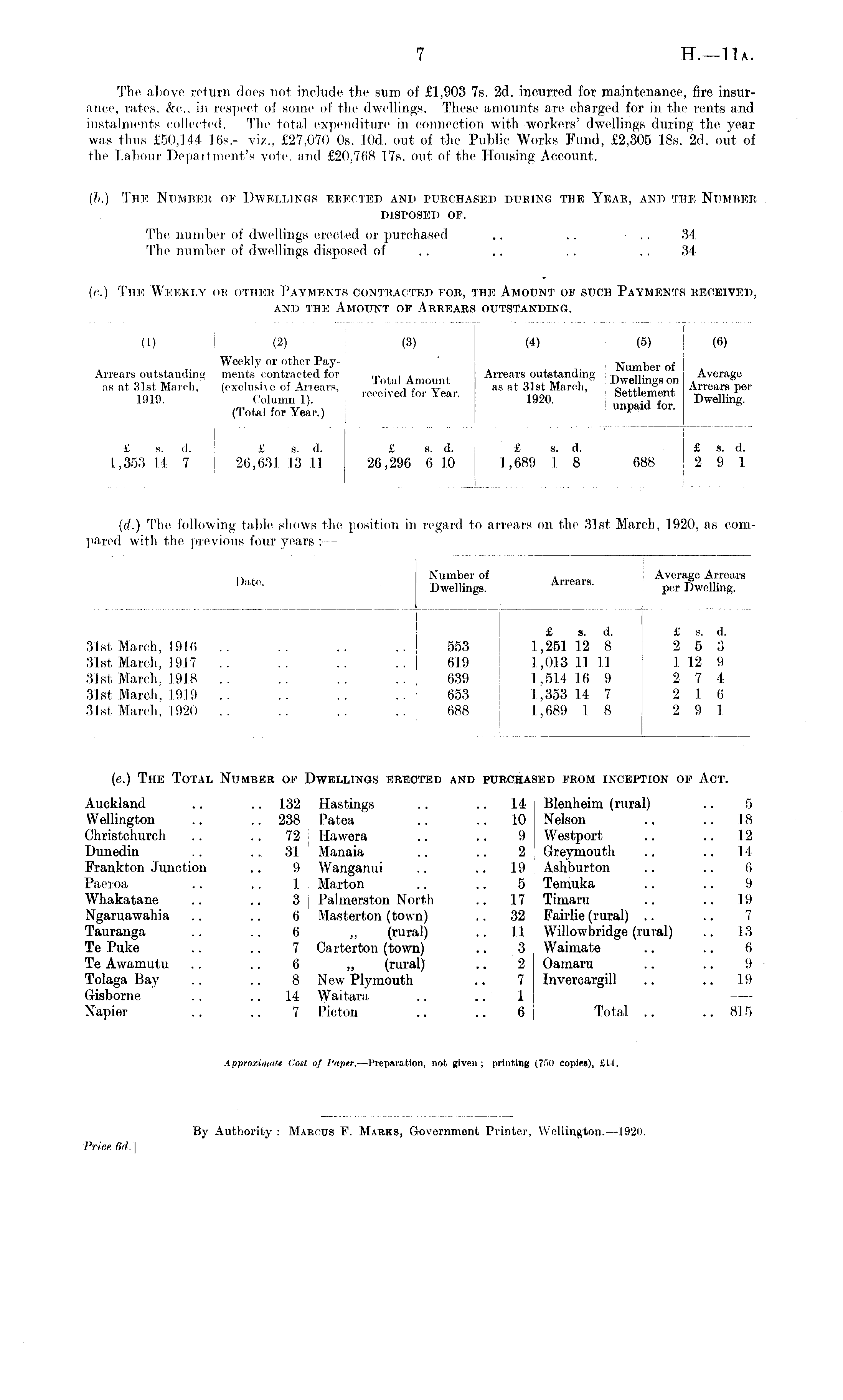 The above return does not include the sum of £1,903 7s. 2d. incurred for maintenance, fire, insurance, rates, &c, in respect of some of the, dwellings. These amounts are charged for in the rents and instalments collected. The total expenditure in connection with workers' dwellings during the year was thus £50,144 16s.- viz., £27,070 os. lOd. out of the Public Works Fund, £2,305 18s. 2d. out of the Labour Department's vote, and £20,768 17s. out of the Housing Account. (I>.) The Number of Dwellings erected and purchased during the Year, and the Number DISPOSED OP. The number of dwellings erected or purchased .. .. ■ .. 34. The number of dwellings disposed of .. . . 34