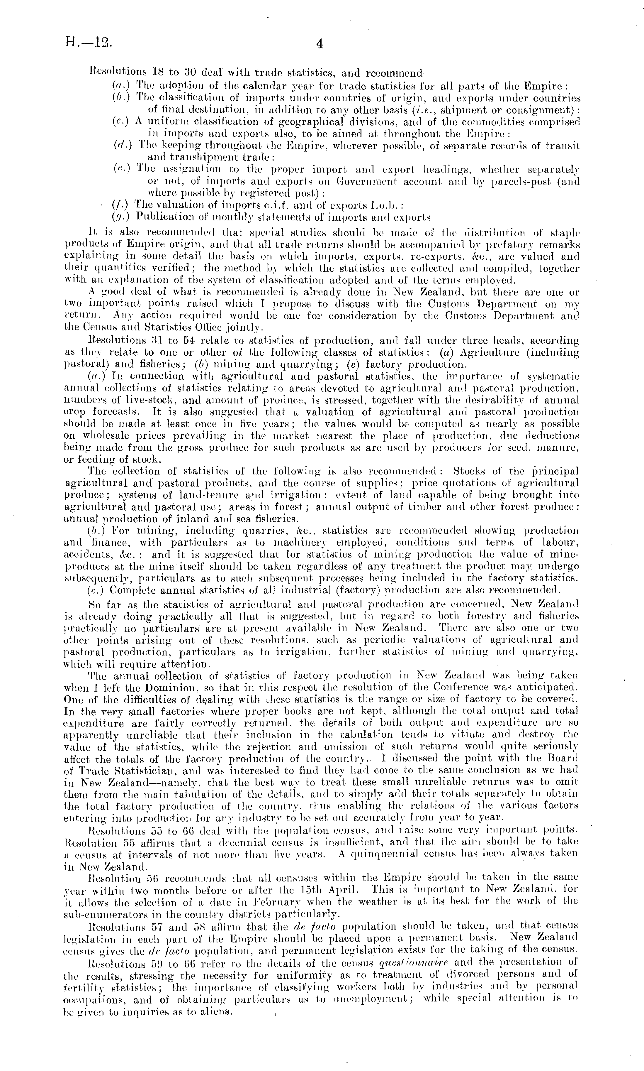 Resolutions 18 to 30 deal with trade statistics, and recommend — (a.) The adoption of the calendar year for trade statistics for all parts of the Empire: (b.) The classification of imports under countries of origin, and exports under countries of final destination, in addition to any other basis (i.e., shipment or consignment) : (c.) A uniform classification of geographical divisions, and of the commodities comprised in imports and exports also, to be aimed at throughout the Empire : (V/.) The keeping throughout flic Empire, wherever possible, of separate records of transit and transhipment trade: (('■) The assignation to the proper import and export headings, whether separately or not, of imports and exports on Government account, and by parcels-post (and where, possible by registered post) : ■ (/.) The valuation of imports c.i.f. and of exports f.o.b. : (//.) Publication of monthly statements of imports and exports It is also recommended that special, studies should be made of the distribution of staple products of Empire origin, and that all trade returns should be accompanied by prefatory remarks explaining in some detail the basis on which imports, exports, re-exports, &c, are valued and their quantities verified; the method by which the statistics are collected and compiled, together with an explanation of the system of classification adopted and of the terms employed. A good deal of what is recommended is already done in New Zealand, but there are one or two important points raised which I propose to discuss with the Customs Department on my return. Any action required would be one for consideration by the Customs Department and the Census and Statistics Office jointly. Resolutions 31 to 54 relate to statistics of production, and fall under three heads, according as they relate to one or other of the following classes of statistics : (a) Agriculture (including pastoral) and fisheries; (b) mining and quarrying; (c) factory production. (a.) In connection with agricultural and pastoral statistics, the importance of systematic annual collections of statistics relating to areas devoted to agricultural and pastoral production, numbers of live-stock, and amount of produce, is stressed, together with the desirability of annual crop forecasts. It is also suggested that a valuation of agricultural and pastoral production should be made at least once in five years ; the values would be computed as nearly as possible on wholesale prices prevailing in the market nearest the place of production, due deductions being made from the gross produce for such products as are used by producers for seed, manure, or feeding of stock. The collection of statistics of the following is also recommended : Stocks of the principal agricultural and pastoral products, and the course of supplies; price quotations of agricultural produce; systems of land-tenure and irrigation; extent of land capable of being brought into agricultural and pastoral use; areas in forest; annual output of limber and other forest: produce; annual production of inland and sea fisheries. (b.) For mining, including quarries, &c, statistics are recommended showing production and finance, with particulars as to machinery employed, conditions and terms of labour, accidents, &c. : and it, is suggested that for statistics of mining production Ihe value of mineproducts at the mine itself should be taken regardless of any treatment the product may undergo subsequently, particulars as to such subsequent processes being included in the factory statistics. (c.) Complete annual statistics of all industrial (factory) production are also recommended. So far as the statistics of agricultural and pastoral prod net. ion are concerned, New Zealand is already doing practically all that is suggested, but in regard to both forestry and fisheries practically no particulars are at present available in New Zealand. There are also one or two other points arising out of these resolutions, such as periodic valuations of agricultural and pastoral production, particulars as to irrigation, further statistics of mining and quarrying, which will require attention. The annual collection of statistics of factory production in New Zealand was being taken when I left the Dominion, so that in this respect the resolution of the Conference was anticipated. One of the difficulties of dealing with these statistics is the range or size of factory to be covered. In the very small factories where proper books are not kept, although the total output and total expenditure are fairly correctly returned, the details of both output, and expenditure are so apparently unreliable that their inclusion in the tabulation lends to vitiate and destroy the value of the statistics, while the rejection and omission of such returns would quite seriously affect the totals of the factory production of the country., 1 discussed the point with (he Board of Trade Statistician, and was interested to find they had come to the same conclusion as we had in New Zealand —namely, that the best way to treat these small unreliable returns was to omit them from the main tabulation of the details, and to simply add their totals separately lo obtain the total factory production of the country, thus enabling the relations of the various factors entering into production for any industry to be set out accurately from year to year. Resolutions 55 to 66 deal with Ihe population census, and raise some very important points. Resolution 55 affirms that a decennial census is insufficient, and that the aim should be to take a census at intervals of not more than live years. A quinquennial census has been always taken in New Zealand. Resolution 56 recommends thai all censuses within the Empire should be taken in the same .year within two months before or after the 15th April. This is important to New Zealand, for it allows the selection of a dale in February when the weather is at its best for the work of the sub-enum