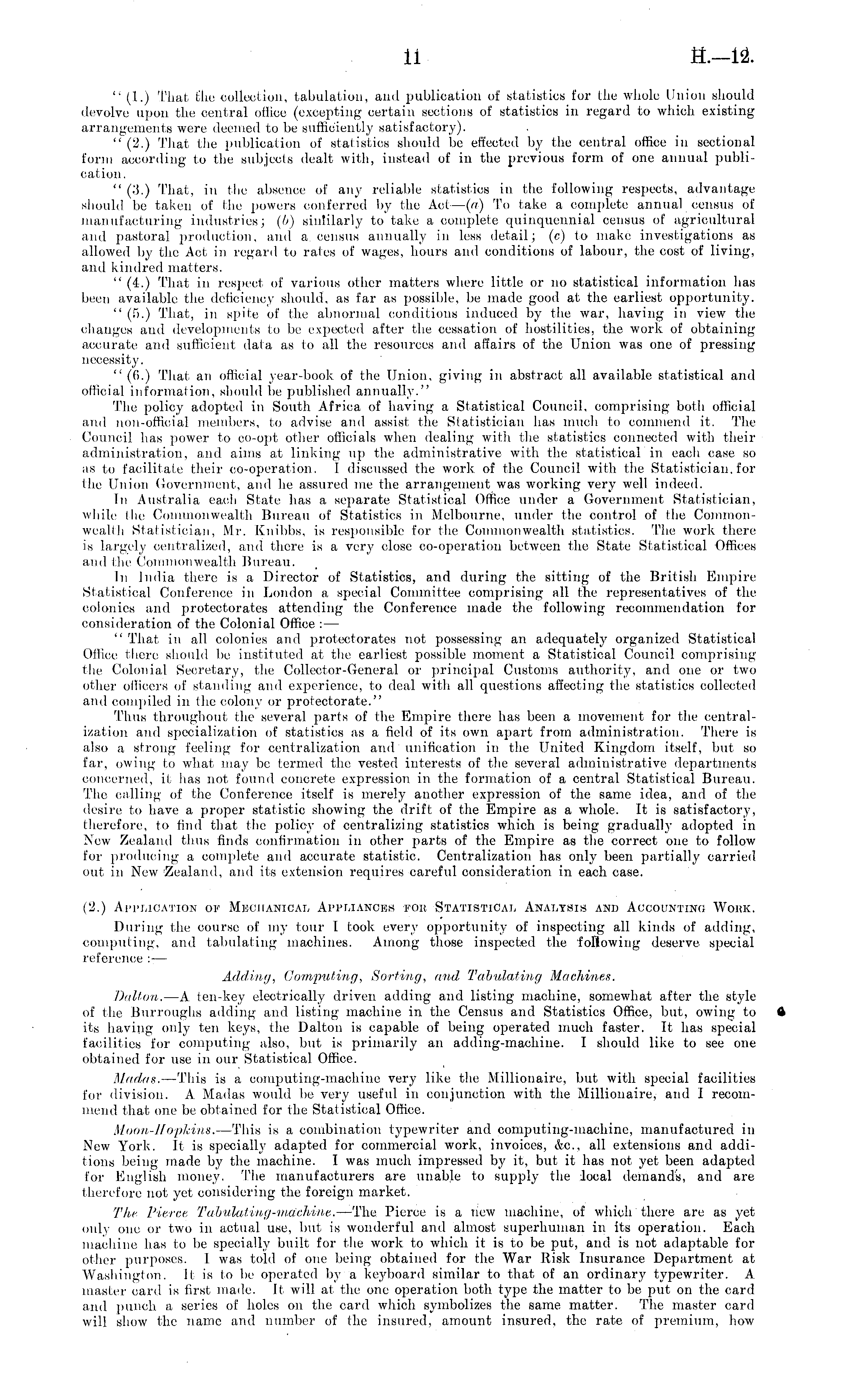 " (1.) That the collection, tabulation, and publication of statistics for the whole Union should devolve upon the central office (excepting certain sections of statistics in regard to which existing arrangements were deemed to be sufficiently satisfactory). " (2.) That the publication of statistics should be effected by the central office in sectional form according to the subjects dealt with, instead of in the previous form of one annual publication. " (3.) That, in the absence of any reliable statistics in the following respects, advantage should be taken of the powers conferred by the Act — (a) To take a complete annual census of manufacturing industries; (b) siutilarly to take a complete quinquennial census of agricultural and pastoral production, and a census annually in less detail; (c) to make investigations as allowed by the Act in regard to rates of wages, hours and conditions of labour, the cost of living, and kindred matters. " (4.) That in respect of various other matters where little or no statistical information has been available the deficiency should, as far as possible, be made good at the earliest opportunity. " (5.) That, in spile of the abnormal conditions induced by the war, having in view the changes and developments to be expected after the cessation of hostilities, the work of obtaining accurate and sufficient data as to all the resources and affairs of the Union was one of pressing necessity. " (6.) That an official year-book of the Union, giving in abstract all available statistical and official information, should be published annually." The policy adopted in South Africa of having a Statistical Council, comprising both official and non-official members, to advise and assist, the Statistician has much to commend it. The Council has power to co-opt other officials when dealing with the statistics connected with their administration, and aims at linking up the administrative with the statistical in each case so as to facilitate their co-operation. I discussed the work of the Council with the Statistician, for the Union Government, and he assured me the arrangement was working very well indeed. In Australia each State has a separate Statistical Office under a Government Statistician, while (he Commonwealth Bureau of Statistics in Melbourne, under the control of the Commonwealth Statistician, Mr. Knibbs, is responsible for the Commonwealth statistics. The work there is largely centralized, and there is a very close co-operation between the State Statistical Offices and the Commonwealth Bureau. In India there is a Director of Statistics, and during the sitting of the British Empire Statistical Conference in London a special Committee comprising all the representatives of the colonies and protectorates attending the Conference made the following recommendation for consideration of the Colonial Office : — " That, in all colonies and protectorates not possessing an adequately organized Statistical Office there should be instituted at the earliest possible moment a Statistical Council comprising the Colonial Secretary, the Collector-General or principal Customs authority, and one or two other officers of standing and experience, to deal with all questions affecting the statistics collected and compiled in the colony or protectorate." Thus throughout the several parts of the Empire there has been a movement for the centralization and specialization of statistics as a field of its own apart from administration. There is also a strong feeling for centralization and unification in the United Kingdom itself, but so far, owing to what may be termed the vested interests of the several administrative departments concerned, it has not found concrete expression in the formation of a central Statistical Bureau. The calling of the Conference itself is merely another expression of the same idea, and of the desire to have a proper statistic showing the drift of the Empire as a whole. It is satisfactory, therefore, to find that the policy of centralizing statistics which is being gradually adopted in New Zealand thus finds confirmation in other parts of the Empire as the correct one to follow for producing a complete and accurate statistic. Centralization has only been partially carried out in New 'Zealand, and its extension requires careful consideration in each case. (2.) Application of Mfoiianical Appliances for Statistical Analysis and Accounting Work. During the course of my tour I took every opportunity of inspecting all kinds of adding, computing, and tabulating machines. Among those inspected the following deserve special reference ;•; — Adding, Computing, Sorting, and Tabulating Machines. Dalton. —A ten-key electrically driven adding and listing machine, somewhat after the style of the Burroughs adding and listing machine in the Census and Statistics Office, but, owing to its having only ten keys, the Dalton is capable of being operated much faster. It has special facilities for computing also, but is primarily an adding-machine. I should like to see one obtained for use in our Statistical Office. Madas. —This is a computing-machine very like the Millionaire, but with special facilities for division. A Madas would be very useful in conjunction with the Millionaire, and I recommend that one be obtained for the Statistical Office. Moon-Hopkins. —This is a combination typewriter and computing-machine, manufactured in New York. It is specially adapted for commercial work, invoices, &c, all extensions and additions being made by the machine. I was much impressed by it, but it has not yet been adapted for English money. The manufacturers are unable to supply the local demands, and are therefore not yet, considering the foreign market. The, fierce Tabulating-machine. —The Pierce is a new machine, of which there are as yet only one or two in actual use, but. is wonderful and almost superhuman in its operation. Each machine has to be specially built for the work to whi