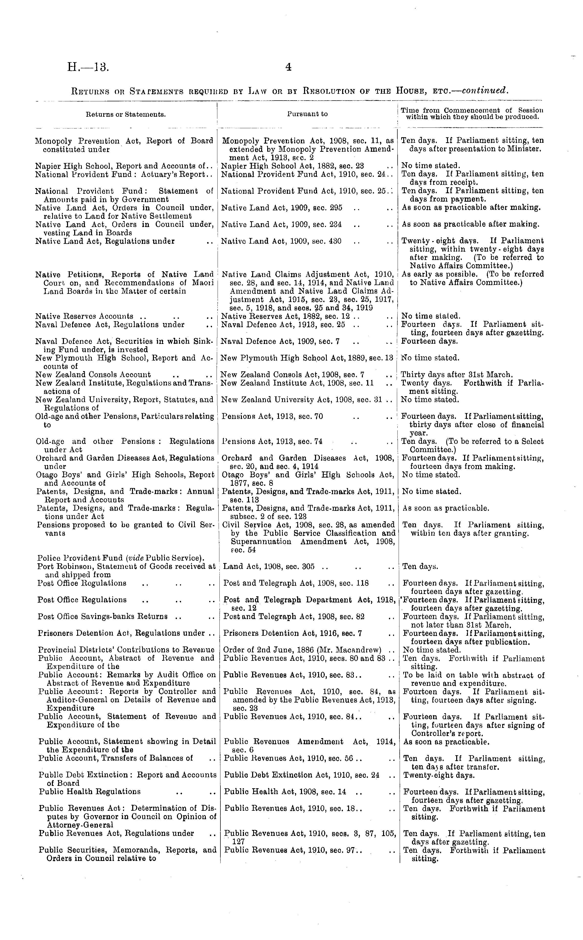 Heturns or Statements. Pursuant to Time from Commencement of Session within which they should be produced. Monopoly Prevention Aot, Beport of Board constituted under Monopoly Prevention Act, 1908, sec. 11, as extended by Monopoly Prevention Amendment Act, 1913, sec. 2 Napier High School Act, 1882, sec. 23 National Provident Fund Act, 1910, sec. 24.. Ten days. If Parliament sitting, ten days after presentation to Minister. Napier High School, Beport and Accounts of.. National Provident Fund : Actuary's Beport.. National Provident Fund: Statement of Amounts paid in by Government Native Land Act, Orders in Council under, relative to Land for Native Settlement Native Land Act, Orders in Council under, vesting Land in Boards Native Land Act, Regulations under National Provident Fund Act, 1910, sec. 25.. No time stated. Ton days. If Parliament sitting, ten days from receipt. Ten days. If Parliament sitting, ten days from payment. As scon as practicable after making. Native Land Act, 1909, sec. 295 Native Land Act, 1909, sec. 234 As soon as practicable after making. Native Petitions, Reports of Native Land Cours on, and Recommendations of Maoii Land Boards in tho Matter of cortain Native Land Aot, 1909, sec. 430 Nativo Land Claims Adjustment Act, 1910, sec. 28, and sec. 11, 1914, and Native Land Amendment and Native Land Claims Adjustment Aot, 1915, sec. 23, sec. 25, 1917, sec. 5, 1918, and seos. 25 and 34, 1919 Native Beserves Act, 1882, sec. 12 .. Naval Defence Act, 1913, sec. 25 .. Twenty - eight days. If Parliament sitting, within twonty-eight daye after making. (To be referred to Nativo Affairs Committee.) As early as possible. (To be referred to Native Affairs Committee.) Native Beserves Accounts .. .. .. j Naval Defence Act, Begulations under No time staled. Fourteen days. If Parliament sitting, fourteen days after gazetting. Fourteen days. Naval Defence Act, Securities in which Sinking Fund under, is invested New Plymouth High School, Report and Accounts of New Zealand Consols Account .. .. I New Zealand Institute, Regulations and Transaotions of New Zealand University, Report, Statutes, and Regulations of Old-age and other Pensions, Particulars relating to Naval Defence Act, 1909, sec. 7 New Plymouth High School Act, 1889, sec. 13 New Zealand Consols Act, 1908, sec 7 .. . New Zealand Institute Act, 1908, sec. 11 No time stated. Thirty days after 31st March. Twonty days. Forthwith if Parliament sitting. No time stated. New Zealand University Act, 1908, sec. 31 .. Old-age and other Pensions : Regulations under Act Orchard and Garden Diseases Aot, Regulations under Otago Boys' and Girls' High Sohools, Report and Accounts of Patents, Designs, and Trade-marks : Annual Report and Accounts Patents, Designs, and Trade-marks : Regulations under Act Pensions proposed to be granted to Civil Servants Pensions Act, 1913, sec. 70 Pensions Act, 1913, sec. 74 Fourteen days. If Parliament sitting, thirty days after close of financial year. Ton days. (To be referred to a Select Committee.) Fourteendays. If Parliament sitting, fourteen days from making. No timo stated. Orchard and Garden Diseases Act, 1908, sec. 20, and sec. 4, 1914 Otago Boys' and Girls' High Schools Act, 1877, sec. 8 Patents, Designs, and Trade-marks Act, 1911, see. 113 Patents, Designs, and Trade-marks Act, 1911, subsec. 2 of sec. 123 Civil Service Act, 1908, sec. 28, as amended by the Public Service Classification and ■ Superannuation Amendment Aot, 1908, tec. 54 No time stated. As soon as practicable. Ten days. If Parliament sitting, within ten days after granting. Police Provident Fund (vide Public Service). Port Robinson, Statement of Goods received at and shipped from Post Office Regulations Land Act, 1908, sec. 305 .. Ten days. Post Office Regulations Post Office Savings-banks Returns Prisoners Detention Act, Regulations under .. Provincial Districts' Contributions to Revenue Public Account, Abstract of Revenue and Expenditure of the Public Account: Remarks by Audit Office on Abstract of Revenue and Expenditure Public Account: Reports by Controller and Auditor-General on Details of Revenue and Expenditure Public Account, Statement of Revenue and Expenditure of the Post and Telegraph Aot, 1908, sec. 118 Post and Telegraph Department Act, 1918, sec. 12 Post and Telegraph Act, 1908, sec. 82 Prisoners Detention Act, 1916, sec. 7 Order of 2nd June, 1886 (Mr. Macandrew) .. Public Bevenues Act, 1910, eecs. 80 and 83 .. Fourteen days. If Parliament sitting, fourteen days after gazetting, 'Fourteen days. If Parliament fitting, fourteen days after gazetting. Fourteen days. If Parliament sitting, not later than 31st March. Fourteendays. If Parliament sitting, fourteen days after publication. No time stated. Ten days. Forthwith if Parliament sitting. To be laid on table wilh abstract of revenue and expenditure. Fourteen days. If Parliament sitting, fourteen days after signing. Public Revenues Act, 1910, sec. 83.. Public Revonuos Act, 1910, sec. 84, as amended by the Public Revenues Act, 1913, sec. 23 Public Bevenues Act, 1910, sec. 81.. Public Revonuos Amendment Act, 1914, sec. 6 Public Revenues Act, 1910, sec. 56 .. Fourteen days. If Parliament sitting, fourteen days after signing of Controller's report. As soon as practicable. Public Account, Statement showing in Detail the Expenditure of the Public Account, Transfers of Balances of Public Debt Extinction : Report and Accounts of Board Public Health Regulations i Ton days. If Parliament sitting, ten dajs after transfor. Twenty-eight days. Publio Debt Extinction Act, 1910, sec. 24 .. Public Revenues Act: Determination of Disputes by Governor in Council on Opinion of Attorney-General Public Bevenues Act, Regulations under Public Health Act, 1908, see. 14 .. Public Revenues Act, 1910, sec. 18.. Fourteen days. If Parliament sitting, fourteen days after gazetting. Ten days. Forthwith if Parliament sitting. Public Bevenues Act, 1910, sees, 3, 87, 105, 127 Public Bevenues Act, 1910, sec. 97.. 