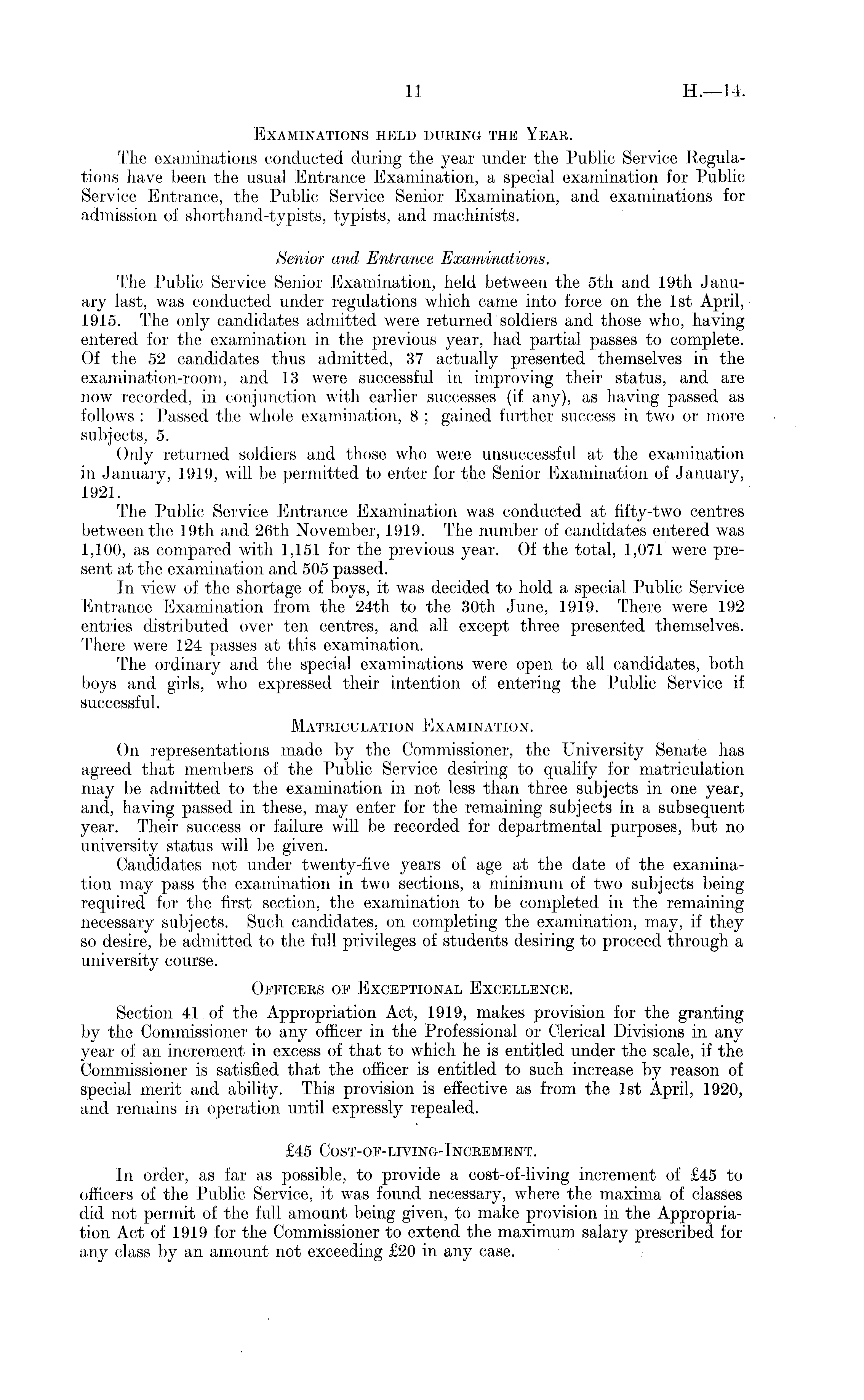 Examinations held during the Year. The examinations conducted during the year under the Public Service Regulations have been the usual Entrance Examination, a special examination for Public Service Entrance, the Public Service Senior Examination, and examinations for admission of shorthand-typists, typists, and machinists. Senior and Entrance Examinations. The Public Service Senior Examination, held between the sth and 19th January last, was conducted under regulations which came into force on the Ist April, 1915. The only candidates admitted were returned soldiers and those who, having entered for the examination in the previous year, had partial passes to complete. Of the 52 candidates thus admitted, 37 actually presented themselves in the examination-room, and 13 were successful in improving their status, and are now recorded, in conjunction with earlier successes (if any), as having passed as follows : Passed the whole examination, 8 ; gained further success in two or more subjects, 5. Only returned soldiers and those who were unsuccessful at the examination in January, 1919, will be permitted to enter for the Senior Examination of January, 1921. The Public Service Entrance Examination was conducted at fifty-two centres between the 19th and 26th November, 1919. The number of candidates entered was 1,100, as compared with 1,151 for the previous year. Of the total, 1,071 were present at the examination and 505 passed. In view of the shortage of boys, it was decided to hold a special Public Service Entrance Examination from the 24th to the 30th June, 1919. There were 192 entries distributed over ten centres, and all except three presented themselves. There were 124 passes at this examination. The ordinary and the special examinations were open to all candidates, both boys and girls, who expressed their intention of entering the Public Service if successful. Matriculation Examination. On representations made by the Commissioner, the University Senate has agreed that members of the Public Service desiring to qualify for matriculation may be admitted to the examination in not less than three subjects in one year, and, having passed in these, may enter for the remaining subjects in a subsequent year. Their success or failure will be recorded for departmental purposes, but no university status will be given. Candidates not under twenty-five years of age at the date of the examination may pass the examination in two sections, a minimum of two subjects being required for the first section, the examination to be completed in the remaining necessary subjects. Such candidates, on completing the examination, may, if they so desire, be admitted to the full privileges of students desiring to proceed through a university course. Officers of Exceptional Excellence. Section 41 of the Appropriation Act, 1919, makes provision for the granting by the Commissioner to any officer in the Professional or Clerical Divisions in any year of an increment in excess of that to which he is entitled under the scale, if the Commissioner is satisfied that the officer is entitled to such increase by reason of special merit and ability. This provision is effective as from the Ist April, 1920, and remains in operation until expressly repealed. £45 Cost-of-living-Increm:ent. In order, as far as possible, to provide a cost-of-living increment of £45 to officers of the Public Service, it was found necessary, where the maxima of classes did not permit of the full amount being given, to make provision in the Appropriation Act of 1919 for the Commissioner to extend the maximum salary prescribed for any class by an amount not exceeding £20 in any case.