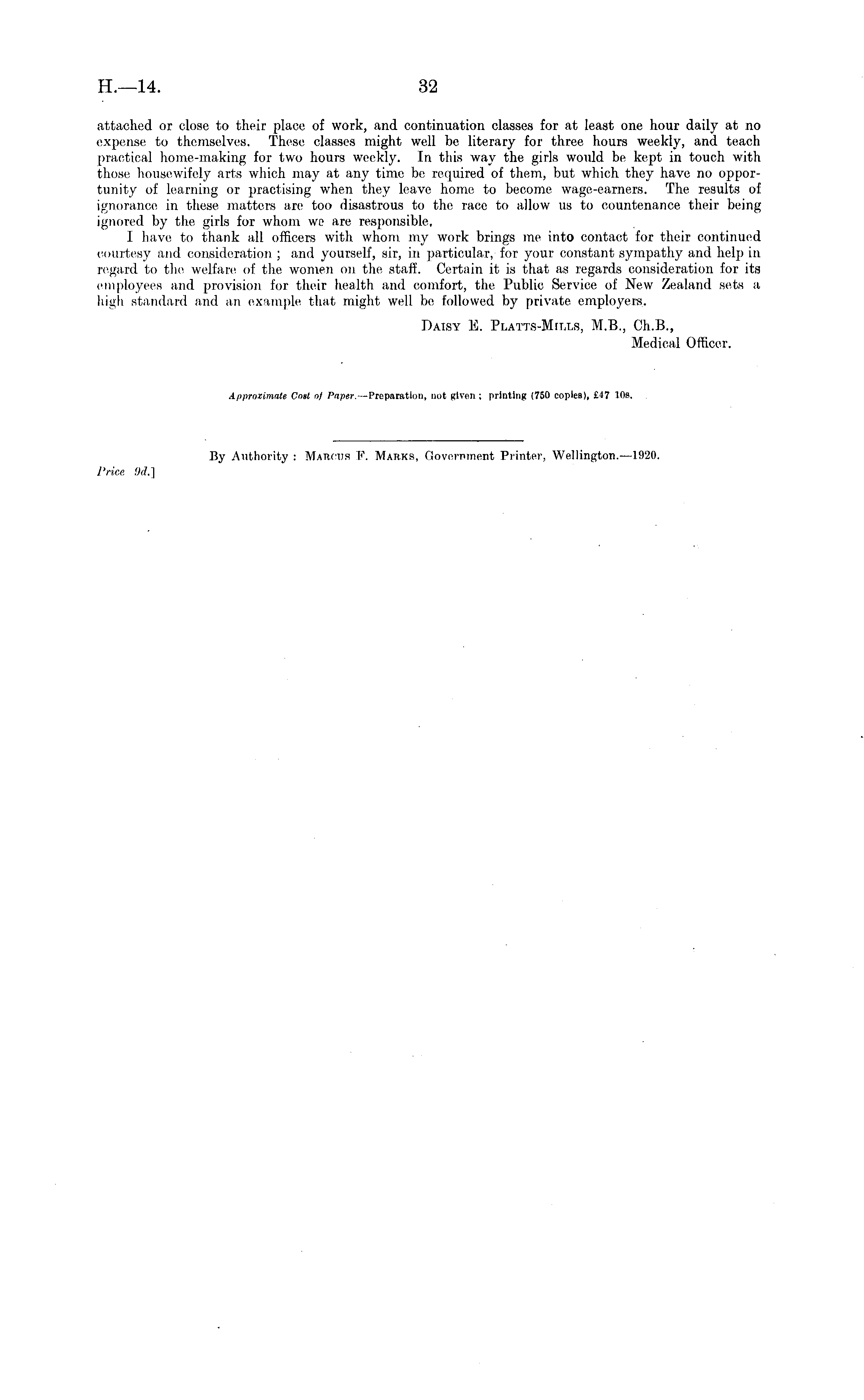 attached or close to their place of work, and continuation classes for at least one hour daily at no expense to themselves. These classes might well be literary for three hours weekly, and teach practical home-making for two hours weekly. In this way the girls would be kept in touch with those housewifely arts which may at any time be required of them, but which they have no opportunity of learning or practising when they leave home to become wage-earners. The results of ignorance in these matters are too disastrous to the race to allow us to countenance their being ignored by the girls for whom we are responsible. I have to thank all officers with whom my work brings me into contact for their continued courtesy and consideration ; and yourself, sir, in particular, for your constant sympathy and help in regard to the welfare of the women on the staff. Certain it is that as regards consideration for its employees and provision for their health and comfort, the Public Service of New Zealand sets a high standard and an example that might well be followed by private employers. Daisy E. Platts-Mills, M.8., Ch.B., Medical Officer.