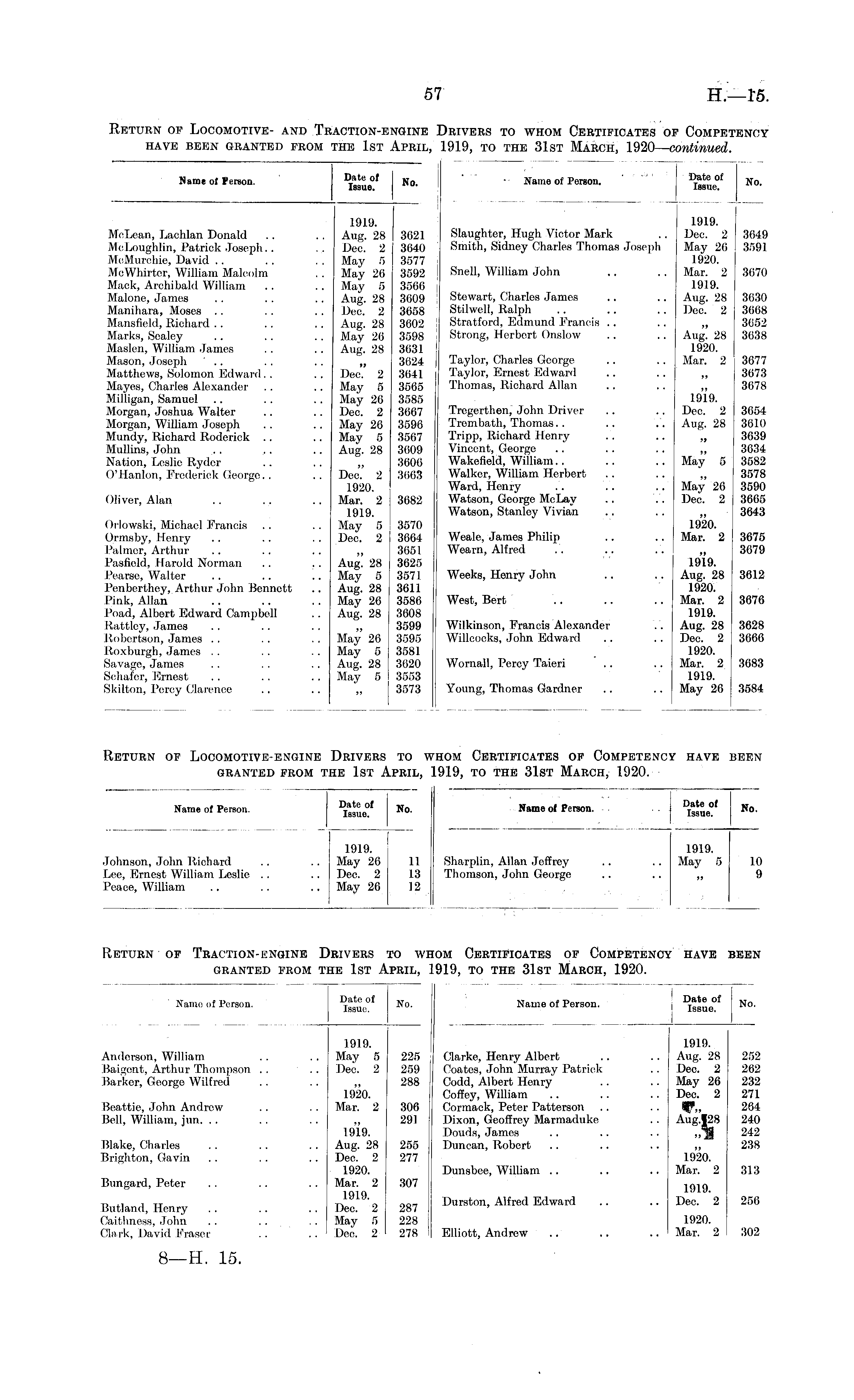 Return of Traction-engine Drivers to whom Certificates of Competency have been granted from the 1st april, 1919, to the 31st march, 1920.