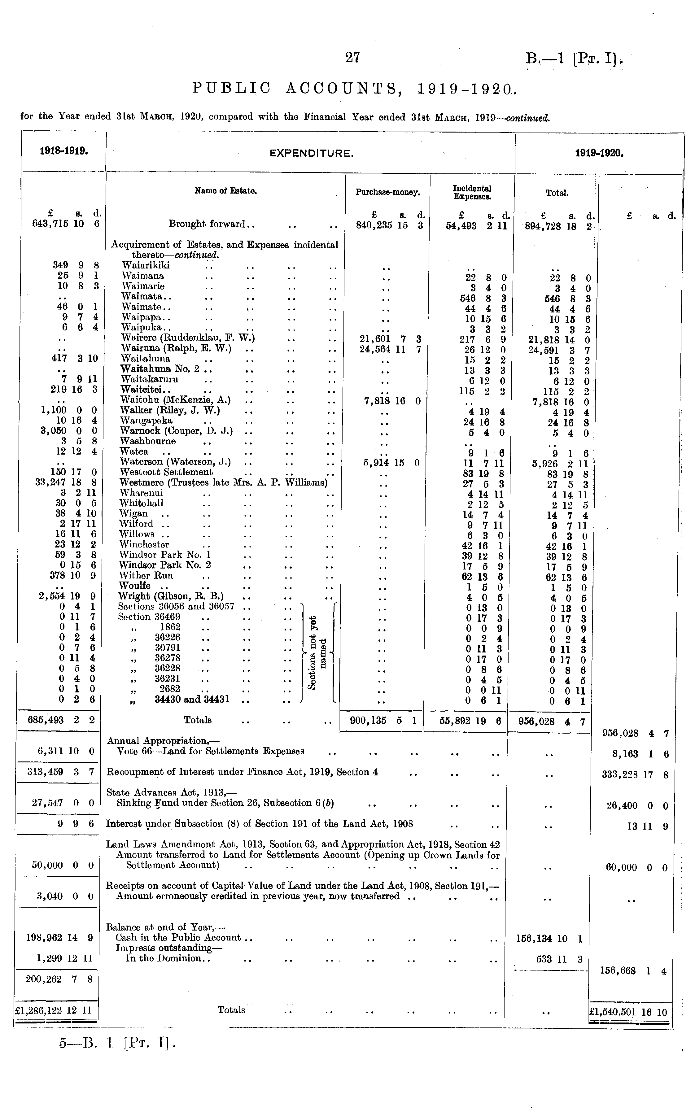 1918-1919. EXPENDITUR 1919-1920. Name of Estate. Purchase-money. E^peracs 4 Purchase-money. Incidental Expenses. Total. £ s. d. 643,715 10 6 £ s. d. £ s. Brought forward.. .. .. 840,235 15 3 54,493 2 1 £ s. d. 840,235 15 3 £ s. d. 54,493 2 11 £ s. d. 894,728 18 2 £ s. d. 349 9 8 25 9 1 10 8 3 46 0 1 9 7 4 6 6 4 4n 3 10 7 9 11 219 16 3 1,100 0 0 10 16 4 3,050 0 0 3 5 8 12 12 4 150 17 0 33,247 18 8 3 2 11 30 0 5 38 4 10 2 17 11 16 11 6 23 12 2 59 3 8 0 16 6 378 10 9 Acquirement of Estates, and Expenses incidental thereto- -continued. Waiarikiki Waimana .. .. .. .. .. 22 8 Waimarie .. .. .. .. .. 3 4 Waimata.. .. .. .. .. .. 54(5 8 Waimate.. .. ,. .. .. .. 44 4 Waipapa.. .. .. .. .. .. 10 15 Waipuka.. .. .. .. .. .. 33 Wairere (Ruddenklau, F. W.) .. .. 21,601 7 3 217 6 Wairuna (Ralph, E. W.) .. .. .. 24,564 11 7 26 12 Waitahuna .. .. .. .. .. 15 2 Waitahuna No. 2 .. .. .. .. .. 13 3 Waitakaruru .. .. .. .. .. 6 12 1 Waiteitei.. .. .. .. .. .. 115 2 ! Waitohu (MeKenzie, A.) .. .. .. 7,818 16 0 Walker (Riley, J. W.) .. '4 19 . Wangapeka .. . . . . .. .. 24 16 I Warnock (Couper, D. J.) .. .. .. 5 4 ( Washbourne Watea .. .. .. .. .. .. 9 1 ( Waterson (Waterson, J.) .. .. .. 5,914 15 0 11 7 L Westcott Settlement .. .. .. .. 83 19 i Westmere (Trustees late Mrs. A. P. Williams) .. 27 5 J Wharonui .. .. .. .. .. 4 14 11 Whitehall .. .. .. .. .. 2 12 I Wigan .. .. .. .. .. .. 14 7 4 Wilford .. .. .. .. .. .. 9 7 11 Willows .. .. .. .. .. .. 63f Winchester . . .. .. .. ... 42 16 1 Windsor Park No. 1 .. .. .. .. 39 12 5 Windsor Park No. 2 .. .. .. . . 17 5 £ Withor Run .. .. .. .. .. 62 13 E Woulfe .. .. .. .. .. .. 15C Wright (Gibson, R. B.) .. .. .. 4 0 fi Sections 36056 and 36057 .. .. "] f .. 0 13 C Section 36469 .. ' .. •• * • • 0 17 3 1862 .. .. .. R .. 00S „ 36226 .. 024 ,, 30791 I « g J .. 0 113 „ 36278 f I I .. 0 17 0 „ 36228 J « .. 0 8 6 36231 f> .. 045 2682 .. .. .. « .. 0 0 11 34430 and 34431 .. ..J I .. 0 6 1 21,601 7 3 24,564 11 7 7,8i8 16 0 5,9i4 15 0 22 8 0 3 4 0 646 8 3 44 4 6 10 15 6 3 3 2 217 6 9 26 12 0 15 2 2 13 3 3 6 12 0 115 2 2 4 19 4 24 16 8 5 4 0 9 1 6 11 7 11 83 19 8 27 5 3 4 14 11 2 12 5 14 7 4 9 7 11 6 3 0 42 16 1 39 12 8 17 5 9 62 13 6 1 6 0 4 0 5 0 13 0 0 17 3 0 0 9 0 2 4 0 11 3 0 17 0 0 8 6 0 4 6 0 0 11 0 6 1 22 8 0 3 4 0 546 8 3 44 4 6: 10 15 6 3 3 2 21,818 14 0 24,591 3 7 15 2 2j 13 3 3 6 12 0! 115 2 2 7,818 16 0 4 19 4' 24 16 8 . 5 4 0 9 1 6 5,926 2 11 83 19 8 27 5 3 4 14 11 2 12 5 14 7 4 9 7 11 6 3 0 42 16 1 39 12 8 17 5 9 62 13 6 1 5 0 4 0 5 0 13 0 0 17 3 0 0 9 0 2 4 0 11 3 0 17 0 0 8 6 0 4 5 0 0 11 0 6 1 2,554 19 9 0 4 1 0 11 7 0 16 0 2 4 0 7 6 0 11 4 0 5 8 0 4 0 0 1 0 0 2 6 685,493 2 2 Totals .. .. .. 900,135 5 1 55,892 19 6 900,135 5 1 55,892 19 6 956,028 4 7 Annual Appropriation,— Vote 66 —Land for Settlements Expenses 956,028 4 7 6,311 10 0 8,163 1 6 313,459 3 7 Recoupment of Interest under Finance Act, 1919, Section 4 333,22'S 17 8 Stato Advances Act, 1913, — Sinking Fund under Section 26, Subsection 6 (b) 26,400 0 0 27,547 0 0 9 9 6 Interest undor Subsoction (8) of Section 191 of the Land Act, 1908 13 11 9 Land Laws Amendment Act, 1913, Section 63, and Appropriation Act, 1918, Section 42 Amount transforrod to Land for Sottloments Account (Opening up Crown Lands for Settlement Aocount) 60,000 0 0 50,000 0 0 3,040 0 0 Receipts on account of Capital Value of Land under the Land Act, 1908, Seotion 191, — Amount erroneously credited in previous year, now transferred 198,962 14 9 Balance at end of Year, — Cash in the Public Account Imprests outstanding— In the Dominion.. .. .. 156,134 10 1 156,668 1 4 1,299 12 11 533 II 3 200,262 7 8 Totals £1,286,122 12 11 £1,540,501 16 10