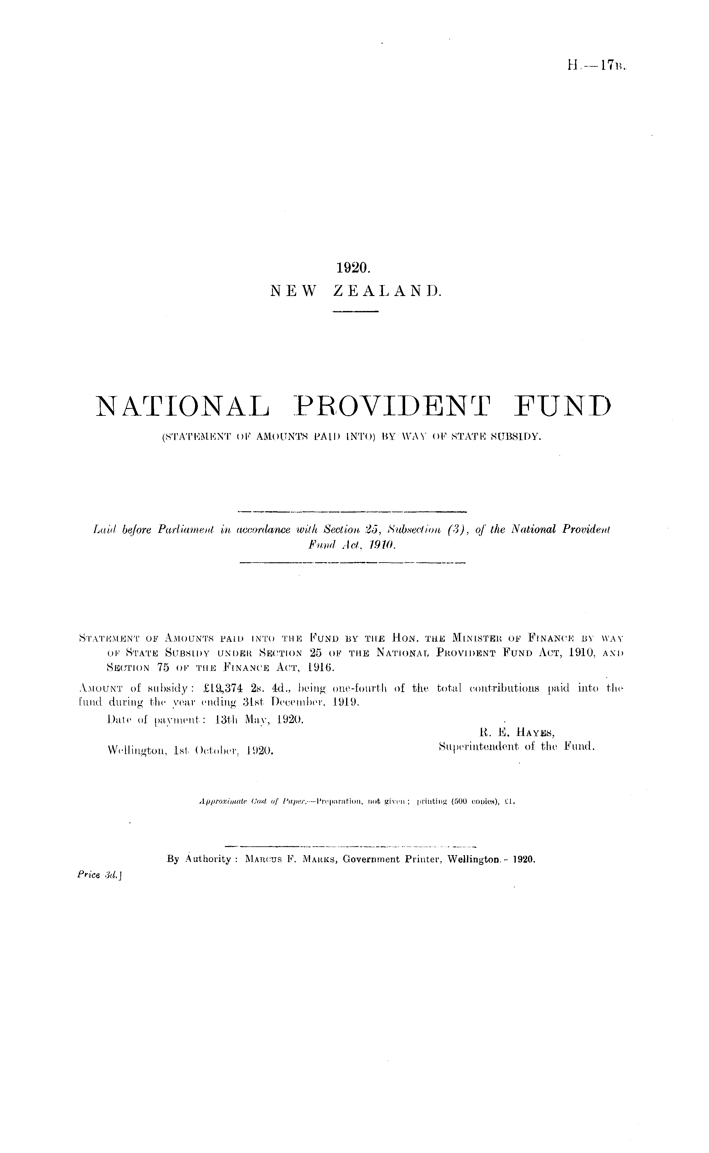 Statement of Amounts paid into thb by the Hon. the Minister op Finance by way of State Subsidy under Section 25 of the National Provident Fund Act, 1910, and Section 75 of the Finance Act, .916. Amount of subsidy: £19,374 2s. 4d., being one-fourth of the total contributions paid into the fund during the year ending 31st December, 1919. Date of payment: 13th May, 1920. R. F. Hayes, Wellington, Ist October, 1920. Superintendent of the Fund.