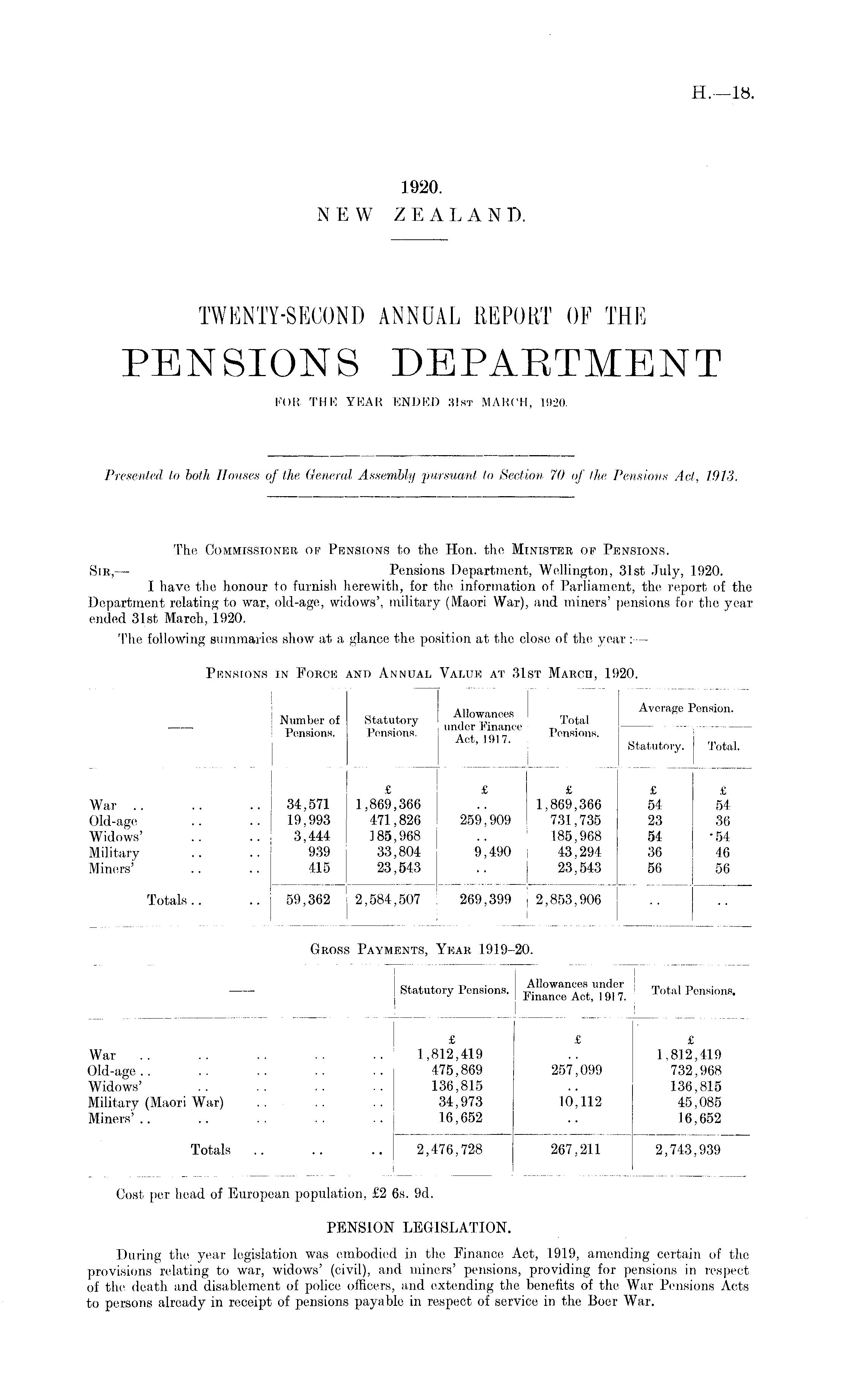 The Commissioner oi? Pensions to the Hon. the Minister op Pensions. Sir, — Pensions Department, Wellington, 31st July, 1920. I have the honour to furnish herewith, for the information of Parliament, the report of the Department relating to war, old-age, widows', military (Maori War), and miners' pensions for the year ended 31st March, 1920. The following summaries show at a glance the position at the close of the year : —