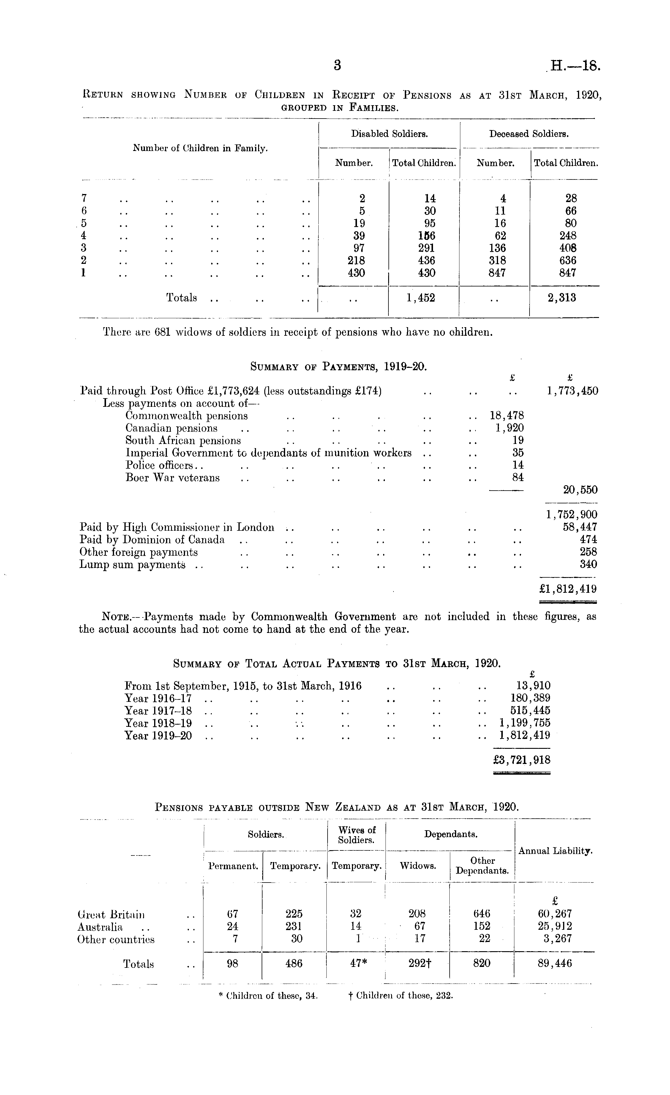 There are 681 widows of soldiers in receipt of pensions who have no children. Summary of Payments, 1919-20. £ £ Paid through Post Office £.1,773,624 (less outstandings £174) .. .. .. 1,773,450 Less payments on account of — Commonwealth pensions .. .. . .. .. 18,478 Canadian pensions .. . . . . . . .. .. 1,920 South African pensions .. .. .. .. .. 19 Imperial Government to dependants of munition workers . . .. 35 Police officers.. . . .. . . . . .. .. 14 Boer War veterans . . . . . . . . .. .. 84 20,550 1,752,900 Paid by High Commissioner in London .. .. .. .. .. .. 58,4.47 Paid by Dominion of Canada .. . . . . .. . . . . .. 474 Other foreign payments . . . . .. . . .. .. .. 258 Lump sum payments .. .. .. .. .. .. .. .. 340 £1,812,419 Note.- Payments made; by Commonwealth Government are not included in these figures, as the actual accounts had not come to hand at the end of the year. Summary of Total Actual Payments to 31st March, 1920. £ From Ist September, 1915, to 31st March, 191.6 .. .. .. .13,910 Year 1916-17 .. .. .. .. .. .. .. 180,389 Year 1917-18 .. .. .. .. .. .. .. 515,445 Year 1918-19 .. .. •.-. .. 1,199,755 Year 1919-20 .. .. .. .. .. .. .. 1,812,419 £3,721,918