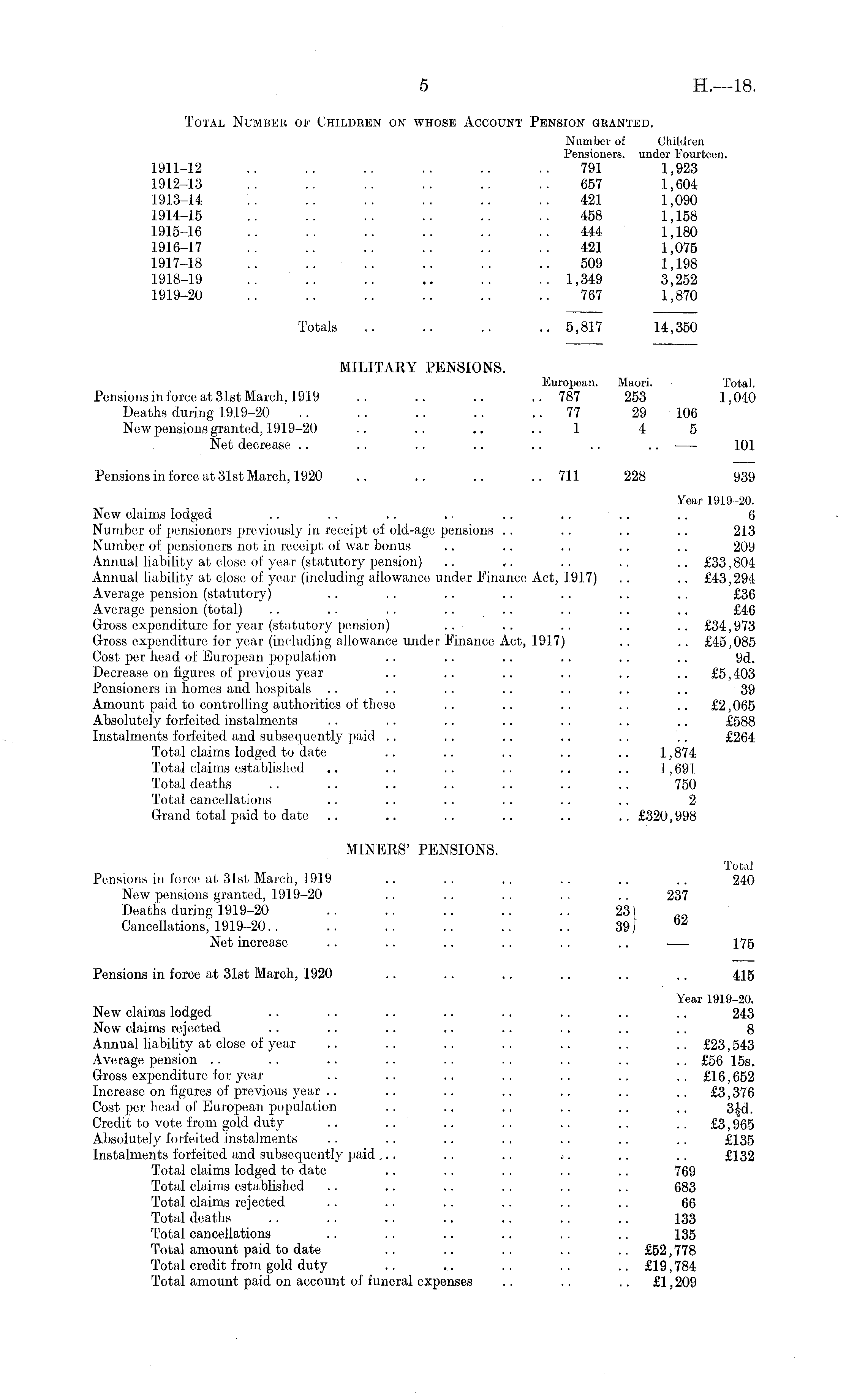 Total Number of Children on whose Account Pension granted. Number of Children Pensioners, under Fourteen. 1911-12 .. .. .. .. .. .. 791 1,923 1912-13 .. .. .. .. .. .. 657 1,604 1913-14 '.. .. .. .. .. .. 421 1,090 1914-15 .. .. .. .. .. ..458 1,158 1915-16 .. .. .. .. .. .. 444 1,180 1916-17 .. .. .. .. .. .. 421 1,075 1917-18 .. .. .. .. .. .. 509 1,198 1918-19 .. .. .. .. .. .. 1,349 3,252 1919-20 .. .. .. .. .. .. 767 1,870 Totals .. .. .. .. 5,817 14,350 MILITARY PENSIONS. European. Maori. Total. Pensions in force at 31st March, 1919 .. .. .. ..787 253 1,040 Deaths during 1919-20 .. .. .. .. 77 29 106 New pensions granted, 1919-20 .. .. .. ..1 4 5 Net decrease .. .. .. .. .. .. .. 101 Pensions in force at 31st March, 1920 .. .. .. .. 711 228 939 Year 1919-20. New claims lodged .. .. .. .. .. .. .. .. 6 Number of pensioners previously in receipt of old-age pensions .. .. .. .. 213 Number of pensioners not in receipt of war bonus .. .. .. .. .. 209 Annual liability at close of year (statutory pension) .. .. .. .. .. £33,804 Annual liability at close of year (including allowance under Finance Act, 1917) .. .. £43,294 Average pension (statutory) .. .. .. .. .. .. ... £36 Average pension (total) .. .. .. .. .. .. .. .. £46 Gross expenditure for year (statutory pension) .. .. .. .. .. £34,973 Gross expenditure for year (including allowance under Finance Act, 1917) . . .. £45,085 Cost per head of European population .. .. .. .. .. .. 9d. Decrease on figures of previous year . . .. .. . . .. .. £5,403 Pensioners in homes and hospitals .. .. .. .. .. .. .. 39 Amount paid to controlling authorities of these .. .. .. .. .. £2,065 Absolutely forfeited instalments .. . . .. .. .. .. .. £588 Instalments forfeited and subsequently paid .. .. .. .. .. .. £264 Total claims lodged to date .. .. .. .. .. 1,874 Total claims established .. .. .. .. .. .. 1,69.1 Total deaths .. .. .. .. .. .. .. 750 Total cancellations .. .. .. . . .. .. 2 Grand total paid to date .. .. .. .. .. .. £320,998 MINERS' PENSIONS. Total Pensions in force at 31st March, 1919 .. . . . . .. .. .. 240 New pensions granted, 1919-20 . . . . .. . . . . 237 Deaths during 1919-20 .. .. .. .. .. 23 | Cancellations, 1919-20.. .. .. .. .. .. 39 J b2 Net increase .. .. .. .. .. .. 175 Pensions in force at 31st March, 1920 .. .. .. .. .. .. 415 Year 1919-20. New claims lodged .. .. .. .. .. .. .. .. 243 New claims rejected .. .. . . .. . . . . .. . . 8 Annual liability at close of year .. .. .. .. .. .. .. £23,543 Average pension .. . . .. .. .. .. .. .. . . £56 15s. Gross expenditure for year .. .. .. .. .. .. .. £16,652 Increase on figures of previous year .. .. .. .. .. .. .. £3,376 Cost per head of European population . . .. .. .. .. .. jj&d. Credit to vote from gold duty .. .. .. . . .. . . . . £3,965 Absolutely forfeited instalments .. .. .. .. .. .. .. £135 Instalments forfeited and subsequently paid ... .. .. ( . . . . . £132 Total claims lodged to date .. .. .. .. .. 769 Total claims established .. .. .. . . .. . . 683 Total, claims rejected .. .. .. .. .. .. 66 Total deaths .. .. .. .. .. .. .. 133 Total cancellations .. .. .. .. .. .. 135 Total amount paid to date .. .. .. .. . . £52,778 Total credit from gold duty .. ... .. . . . . £19,784 Total amount paid on account of funeral expenses .. .. .. £1,209