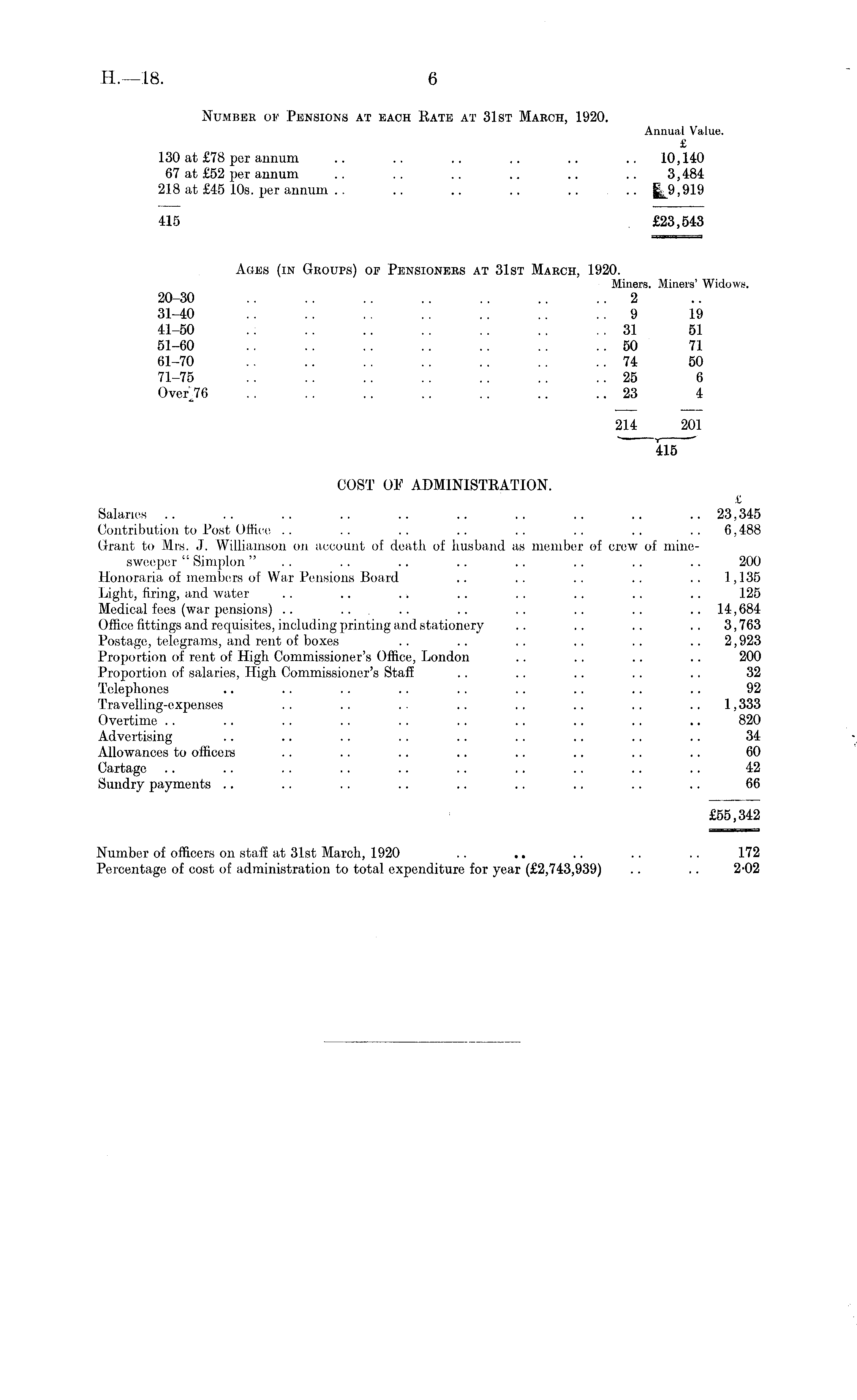 Number of Pensions at each Rate at 31st March, 1920. Annual Value. £ 130 at £78 per annum .. .. .. .. .. .. 10,140 67 at £52 per annum .. .. .. .. .. .. 3,484 218 at £45 10s. per annum . . .. .. .. .. .. §^9,919 415 £23,543 Ages (in Groups) of Pensioners at 31st March, 1920. Miners. Miners' Widows. 20-30 .. .. .. .. .. .. ..2 31-40 .. .. .. .. .. .. ..9 19 41-50 .. .. .. .. .. .. . . 31 51 51-60 .. .. .. ..50 71 61-70 .. .. .. .. .. .. ..74 50 71-75 .. .. .. .. .. .. ..25 6 Over 76 .. .. .. .. .. .. ..23 4 214 201 415 COST OF ADMINISTRATION. £ Salaries .. .. .. .. .. .. .. .. .. .. 23,345 Contribution to Post Office .. .. .. .. .. .. .. ..6,488 Grant to Mrs. J. Williamson on account of death of husband as member of crew of minesweeper " Simplon" .. .. .. .. .. .. .. .. 200 Honoraria of members of War Pensions Board .. . . .. .. . . 1,135 Light, firing, and water .. .. .. .. . . .. .. .. 125 Medical fees (war pensions) .. .. .. .. .. .. 14,684 Office fittings and requisites, including printing and stationery .. .. .. .. 3,763 Postage, telegrams, and rent of boxes .. .. . . ~ .. .. 2,923 Proportion of rent of High Commissioner's Office, London .. .. .. .. 200 Proportion of salaries, High Commissioner's Staff .. .. .. . . . . 32 Telephones .. .. .. .. .. .. .. .. .. 92 Travelling-expenses . . .. . . .. . . . . . . .. 1,333 Overtime .. .. .. .. . . .. .. .. .. .. 820 Advertising .. .. .. . . .. . . .. .. .. 34 Allowances to officers .. .. .. .. .. .. .. .. 60 Cartage .. .. . . .. .. . . .. .. .. .. 42 Sundry payments .. .. .. .. .. .. .. .. .. 66 £55,342 Number of officers on staff at 31st March, 1920 .. .. .. .. .. 172 Percentage of cost of administration to total expenditure for year (£2,743,939) .. .. 2-02