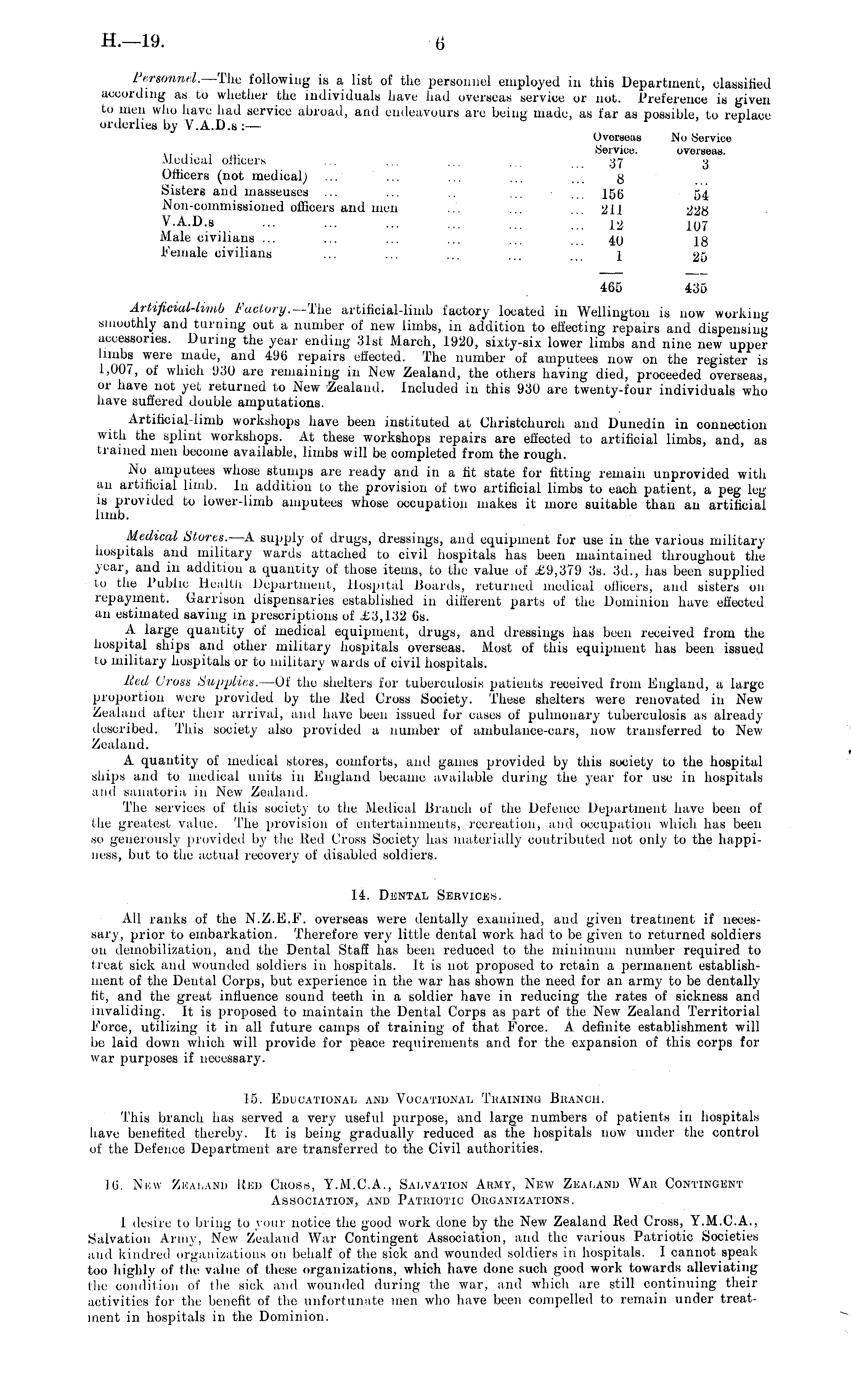 Personnel.—The following is a list of the personnel employed in this Department, classitied according as to whether the individuals have had overseas service or not. Preference is given to men who have had service abroad, and endeavours are being made, as far as possible, to replace orderlies by V.A.D.s :— Overseas No Service (Service, overseas. Medical officers ... ... ... ... 37 3 Officers (not medical) ... ... ... ... 3 Sisters and masseuses ... ... .. ... ... 156 54 Non-commissioned officers and men ... ... ... 211 228 V.A.D.s ... ... ... ... ... ... 12 107 Male civilians ... ... ... ... ... 40 lg Female civilians ... ... ... ... \ 25 465 435 Artificial-limb Factory.—The artificial-limb factory located in Wellington is now working smoothly and turning out a number of new limbs, in addition to effecting repairs and dispensing accessories. During the year ending 31st March, 1920, sixty-six lower limbs and nine new upper limbs were made, and 496 repairs effected. The number of amputees now on the register is 1,007, of which 930 are remaining in New Zealand, the others having died, proceeded overseas, or have not yet returned to New Zealand. Included in this 930 are twenty-four individuals who have suffered double amputations. Artificial-limb workshops have been instituted at Christchuroh and Dunedin in connection with the splint workshops. At these workshops repairs are effected to artificial limbs, and, as trained men become available, limbs will be completed from the rough. No amputees whose stumps are ready and in a lit state for fitting remain unprovided with an artificial limb. In addition to the provision of two artificial limbs to each patient, a peg legis provided to lower-limb amputees whose occupation makes it more suitable than an artificial limb. Medical Stores. —A supply of drugs, dressings, and equipment for use in the various militaryhospitals and military wards attached to civil hospitals has been maintained throughout the year, and in addition a quantity of those items, to the value of £9,379 3s. 3d., has been supplied to the Health Department, Hospital Boards, returned medical officers, and sisters on repayment. Garrison dispensaries established in different parts of the Dominion have effected an estimated saving in prescriptions of £3,132 Cs. A large quantity of medical equipment, drugs, and dressings has been received from the hospital ships and other military hospitals overseas. Most of this equipment has been issued to military hospitals or to military wards of civil hospitals. lied Cross Supplies. —Of the shelters for tuberculosis patients received from England, a large proportion were provided by the Red Cross Society. These shelters were renovated in New Zealand after their arrival, and have been issued for cases of pulmonary tuberculosis as already described. This society also provided a number of ambulance-cars, now transferred to New Zealand. A quantity of medical stores, comforts, ami games provided by this society to the hospital ships and to medical units in England became available during the year for use in hospitals and sanatoria in New Zealand. The services of this society to the Medical Branch of the Defence Department have been of the greatest value. The provision of entertainments, recreation, and occupation which has been so generously provided by the Red Cross Society has materially contributed not only to the happiness, but to the actual recovery of disabled soldiers. 14. Dental Services. All ranks of the N.Z.E.F. overseas were dentally examined, and given treatment if necessary, prior to embarkation. Therefore very little dental work had to be given to returned soldiers on demobilization, and the Dental Staff has been reduced to the minimum number required to treat sick and wounded soldiers in hospitals. It is not proposed to retain a permanent establishment of the Deutal Corps, but experience in the war has shown the need for an army to be dentally tit, and the great influence sound teeth in a soldier have in reducing the rates of sickness and invaliding. It is proposed to maintain the Dental Corps as part of the New Zealand Territorial Force, utilizing it in all future camps of training of that Force. A definite establishment will be laid down which will provide for peace requirements and for the expansion of this corps for war purposes if necessary. 15. Educational and Vocational Training Branch. This branch has served a very useful purpose, and large numbers of patients in hospitals have benefited thereby. It is being gradually reduced as the hospitals now under the control of the Defence Department are transferred to the Civil authorities. 16. New Zealand Red Cross, V.M.C.A., Salvation Army, New Zealand War Contingent Association, and Patriotic Organizations. 1 desire to bring to your notice the good work done by the New Zealand Red Cross, V.M.C.A., Salvation Army, New Zealand War Contingent Association, and the various Patriotic Societies and kindred organizations on behalf of the sick and wounded soldiers in hospitals. I cannot speak too highly of the value of these organizations, which have done such good work towards alleviating the condition of the sick and wounded during the war, and which are still continuing their activities for the benefit of the unfortunate men who have been compelled to remain under treatment in hospitals in the Dominion.