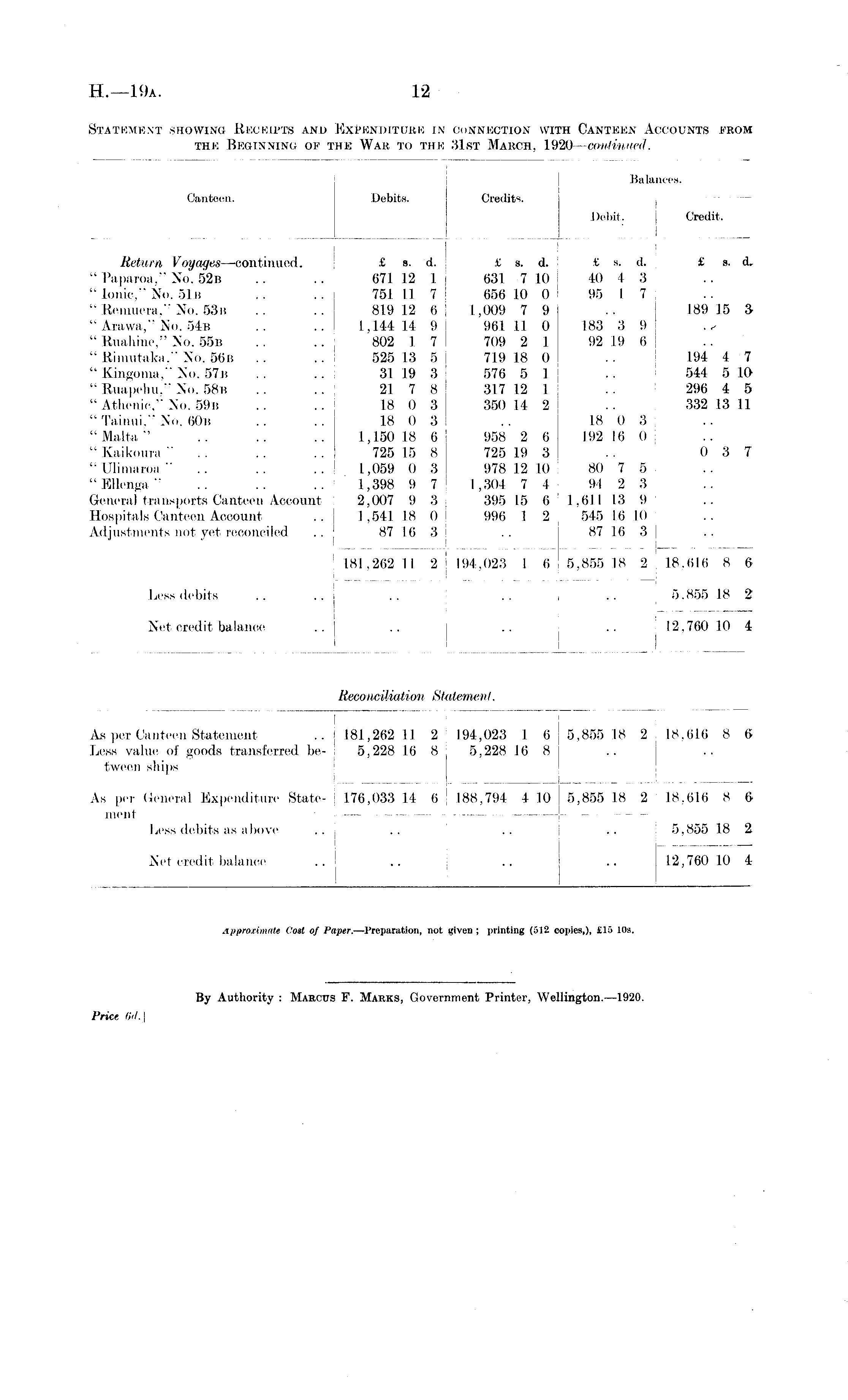Balances. Canteen. Debits. Credits. Debit. Credit. Return Voyages— continued. £ s. d. £ s. d. ■ £ ». d. £ s. d, " Paparoa," No. 52b .. .. 671 12 1 631 7 10 40 4 3 "Ionic," No. 51 it .. .. 751 11 7 656 10 0- 95 I 7 " Remuera," No. 53it . . .. 819 12 6 1,009 7 9 . . 189 15 3 " Arawa," No. 54b 1,144 14 9 96111 0 183 3 9 " Ruahine," No. 55b .. .. 802 1 7 709 2 I 92 19 6 " Rimutaka." No. 56b .. .. 525 13 5 719 18 0 .. 194 4 7 "Kingoma," No. 57it .. .. 31 19 3 576 5 1 .. 544 5 10 " Ruapehu." No. 58b .. .. 21 7 8 317 12 1 .. 296 4 5 "Athenic," No. 59b .. .. 18 0 3 350 14 2 .. 332 13 11 " Tainui." No. 60b . . . . 18 0 3 . . 18 0 3 "Malta" .. .. .. 1,150 18 6 958 2 6 192 16 0 j "Kaikoura" .. .. .. 725 15 8 725 19 3 .. 0 3 7 "Ulimaroa" .. .. .. 1,059 0 3 978 12 10: 80 7 5 "Ellenga" .. .. .. 1,398 9 7 1,304 7 4 91 2 3 Genera] transports Canteen Account 2,007 9 3 395 15 6 : 1,611 13 9 ; Hospitals Canteen Account .. 1,541 18 0 996 1 2, 545 16 10 Adjustments not yet reconciled .. 87 16 3 .. 87 16 3 181.262 11 2 194,023 1 6 5,855 18 2 18.616 8 6 Less debits .. .. .. .. .. 5.855 18 2 Net credit balance .. .. .. .. 12,760 10 4 Reconciliation Stat emeu I. I I i As per Canteen Statement . .j 181,262 11 2 194,023 1 6 5,855 18 2 18,616 8 6 Less value of goods transferred be- ! 5,228 16 8 5,228 16 8 tween ships As per General Expenditure State- 176,033 14 6 188,794 4 10 5,855 18 2 18.616 8 6 ment Less debits as above .. .. .. .. 5.855 18 2 Net credit balance .. .. .. ... 12,760 10 4