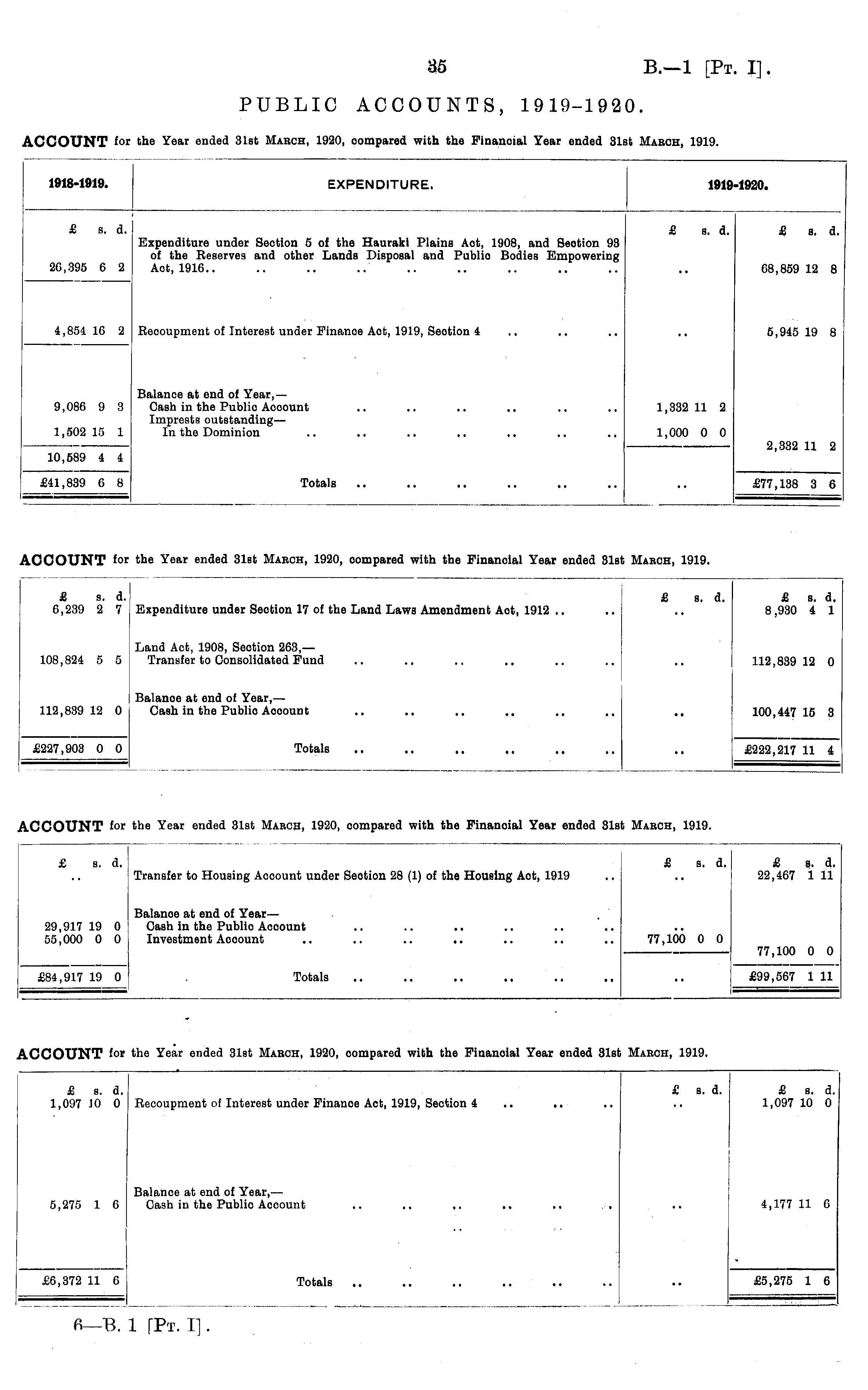 1918-1919. EXPENDITURE. 1919■1920. £ s. d. £ s. d. £ a. d. 26,395 6 2 Expenditure under Section 5 of the Hauraki Plains Aot, 1908, and Section 93 of the Reserves and other Lands Disposal and Publio Bodies Empowering Aot, 1916.. 68,859 12 8 4,854 16 2 Recoupment of Interest under Finance Act, 1919, Seotion 4 5,945 19 8 Balance at end of Year, — Cash in the Publio Aooount Imprests outstanding— In the Dominion 1,332 11 2 2,332 11 2 9,086 9 3 1,502 15 1 1,000 0 0 10,589 4 4 Totals £41,839 6 8 £77,138 3 6 CCOUNT for the Year ended 31st March, 1920, oompared with the Finanoial Year ended 31si March, 1919. 6,239 2 7 Expenditure under Section 17 of the Land Laws Amendment Aot, 1912 .. £ s. d. 6,239 2 7 £ s. d. £ s. d. 8,930 4 1 Land Act, 1908, Seotion 263,— 108,824 5 5 Transfer to Consolidated Fund 108,824 5 5 112,839 12 0 Balanoe at end of Year, — 112,839 12 0 Cash in the Publio Aooount 112,839 12 0 100,447 15 3 £227,903 0 0 Totals £227,903 0 0 £222,217 11 4 .CCOUNT for the Year ended 31st March, 1920, compared with the Finanoial Year ended 31sl March, 1919. £ b. d. Transfer to Housing Account under Seotion 28 (1) of the Housing Act, 1919 £ s. d. £ s. d. £ s. d. 22,467 1 11 Balanoe at end of Year— 29,917 19 0 Cash in the Publio Account 55,000 0 0 Investment Aooount 29,917 19 0 55,000 0 0 77,100 0 0 77,100 0 0 £99,567 1 11 £84,917 19 0 . Totals £84,917 19 0 .CCOUNT for the Year ended 31st March, 1920, oompared with the Finanoial Year ended 31sl March, 1919. £ s. d. 1,097 10 0 Recoupment of Interest under Finance Act, 1919, Section 4 £ s. d. £ s. d. 1,097 10 0 5,275 1 6 Balance at end of Year, — Cash in the Publio Aocount 4,177 11 6 £6,372 11 6 Totals £5,275 1 6