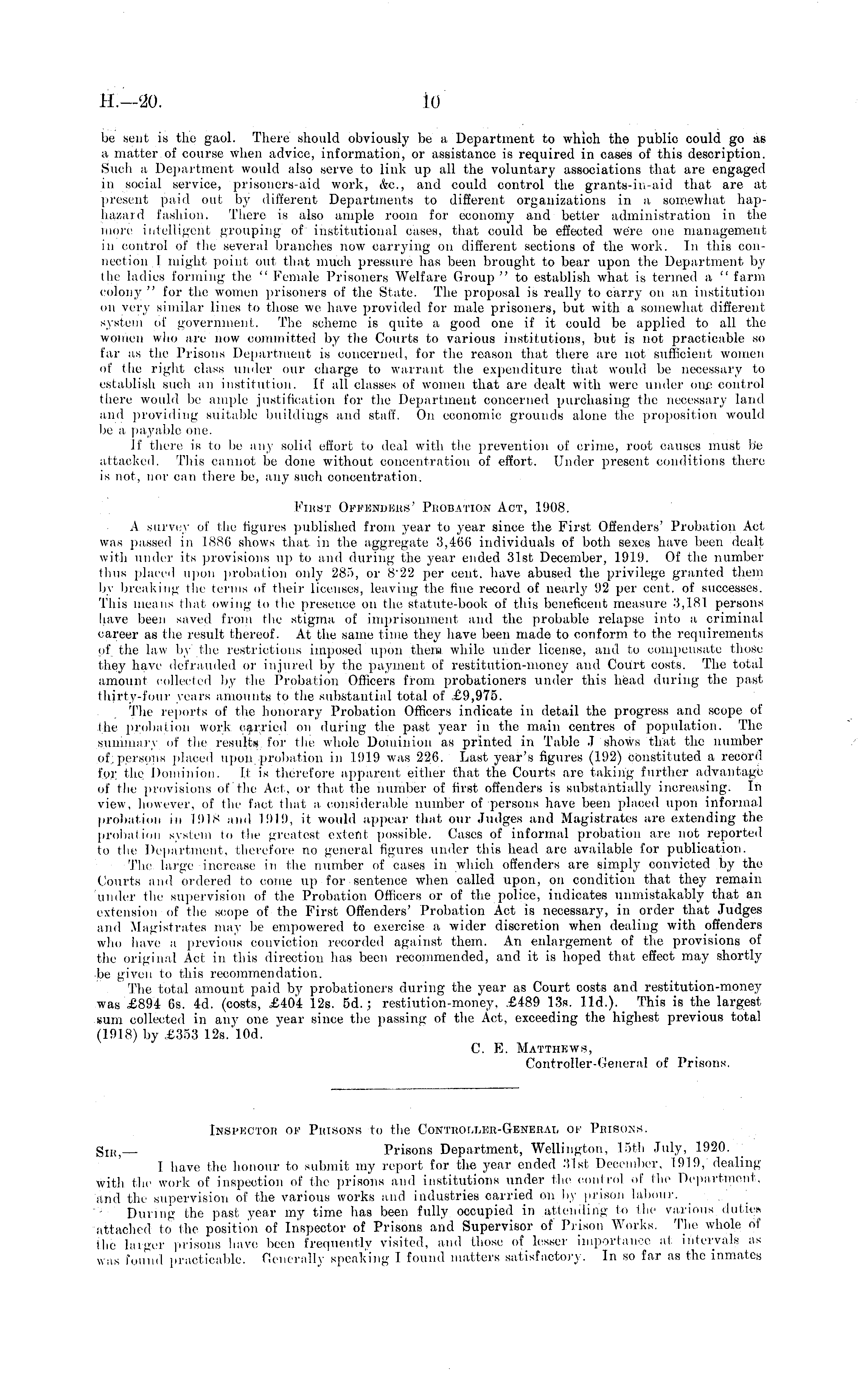 Inspector of Prisons to the Controller-General of Prisons. S IKj Prisons Department, Wellington, 15th July, 1920. I have the honour to submit my report for the year ended 31st December, 1910, dealing with the work of inspection of the prisons and institutions under the control of the Department, and the supervision of the various works and industries carried on by prison lal r. During the past year my time has been fully occupied in attending to the various duties attached to the position of Inspector of Prisons and Supervisor of Prison Works. The whole of the linger prisons have, been frequently visited, and those of lesser importance at. intervals as was Found practicable. Generally speaking I found matters satisfactory. In so far as the inmates
