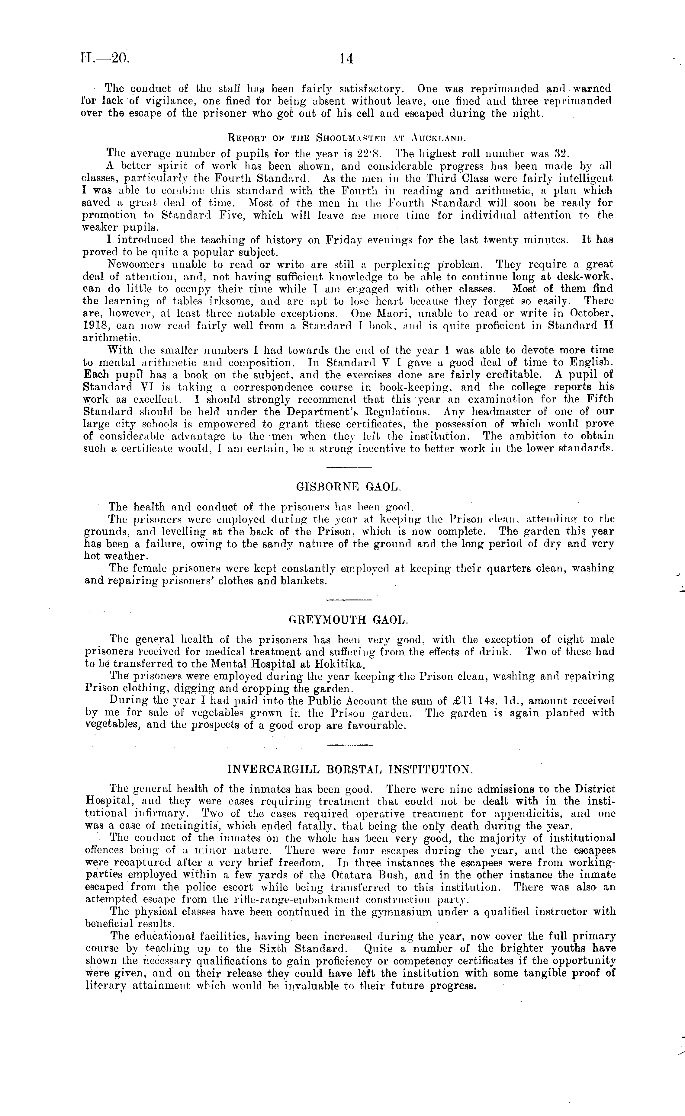 ■ The conduct of the staff has been fairly satisfactory. One was reprimanded and warned for lack of vigilance, one fined for being absent without leave, one fined and three reprimanded over the escape of the prisoner who got, out of his cell and escaped during the night. Report op the Shoolmaster at Auckland The average number of pupils for the year is 228. The highest roll number was 32. A better spirit of work has been shown, and considerable progress has been made by all classes, particularly the Fourth Standard. As the men in the Third Class were fairly intelligent I was able to combine this standard with the Fourth in reading and arithmetic, a plan which saved a great deal of time. Most of the men in the Fourth Standard will soon be ready for promotion to Standard Five, which will leave me more time for individual attention to the weaker pupils. I. introduced the teaching of history on Friday evenings for the last twenty minutes. It has proved to be quite a popular subject. Newcomers unable to read or write are still a perplexing problem. They require a great deal of attention, and, not having sufficient knowledge to be able to continue long at desk-work, can do little to occupy their time while lam engaged with other classes. Most of them find the learning of tables irksome, and arc apt to lose heart because they forget so easily. There are, however, at least three notable exceptions. One Maori, unable to read or write in October, 1918, can now read fairly well from a Standard 1 book, and is quite proficient in Standard II arithmetic. With the smaller numbers I had towards the end of the year I was able to devote more time to mental arithmetic and composition. In Standard V I gave a good deal of time to English. Each pupfl has a book on the subject, and the exercises done are fairly creditable. A pupil of Standard VI is taking a correspondence course in book-keeping, and the college reports his work as excellent. I should strongly recommend that this year an examination for the Fifth Standard should be held under the Department's Regulations. Any headmaster of one of our large city schools is empowered to grant these certificates, the possession of which would prove of considerable advantage to the men when they left the institution. The ambition to obtain such a certificate would, I am certain, be a strong incentive to better work in the lower standards. GISBORNE GAOL. The health and conduct of the prisoners has been good. The prisoners were employed during the year at keeping the Prison clean, attending to t he grounds, and levelling at the back of the Prison, which is now complete. The garden this year has been a failure, owing to the sandy nature of the ground and the long period of dry and very hot weather. The female prisoners were kept constantly employed at keeping their quarters clean, washing and repairing prisoners' clothes and blankets. GREYMOUTH GAOL. The general health of the prisoners has been very good, with the exception of eight male prisoners received for medical treatment and suffering from the effects of drink. Two of these had to be transferred to the Mental Hospital at llokitika. The prisoners were employed during the year keeping the Prison clean, washing and repairing Prison clothing, digging and cropping the garden. During the year I had paid into the Public Account the sum of £11 lis. Id., amount received by me for sale of vegetables grown in the Prison garden. The garden is again planted with vegetables, and the prospects of a good crop are favourable. INVERCARGILL BORSTAL INSTITUTION. The general health of the inmates has been good. There were nine admissions to the District Hospital, and they were cases requiring treatment that could not be dealt with in the institutional infirmary. Two of the cases required operative treatment for appendicitis, and one was a case of meningitis', which ended fatally, that being the only death during the year. The conduct of the inmates on the whole has been very good, the majority of institutional offences being of a, minor nature. There were four escapes during the year, and the escapees were recaptured after a very brief freedom. In three instances the escapees were from workingparties employed within a few yards of the Otatara Rush, and in the other instance the inmate escaped from the police escort while being transferred to this institution. There was also an attempted escape from the rifle-range-embankment construction party. The physical classes have been continued in the gymnasium under a qualified instructor with beneficial results. The educational facilities, having been increased during the year, now cover the full primary course by teaching up to the Sixth Standard. Quite a number of the brighter youths have shown the necessary qualifications to gain proficiency or competency certificates if the opportunity were given, and on their release they could have left the institution with some tangible proof of literary attainment which would be invaluable to their future progress.
