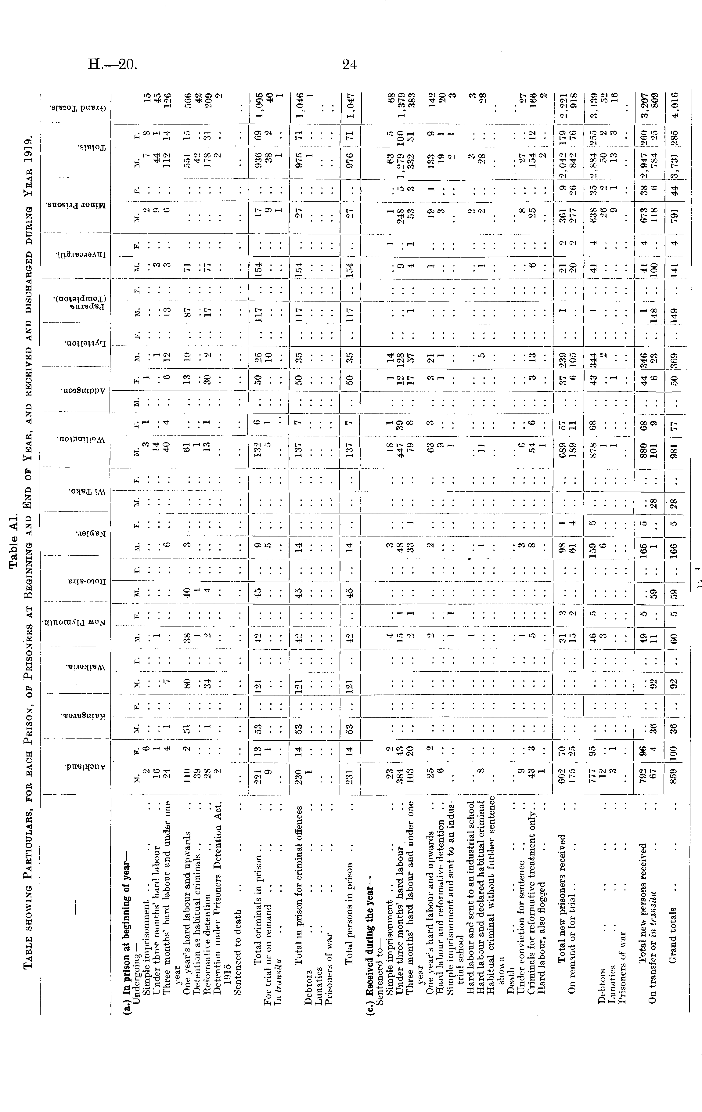 Table A1. Table showing Particulars, for each Prison, of Prisoners at Beginning and End of Year, and received and discharged during Year 1919.