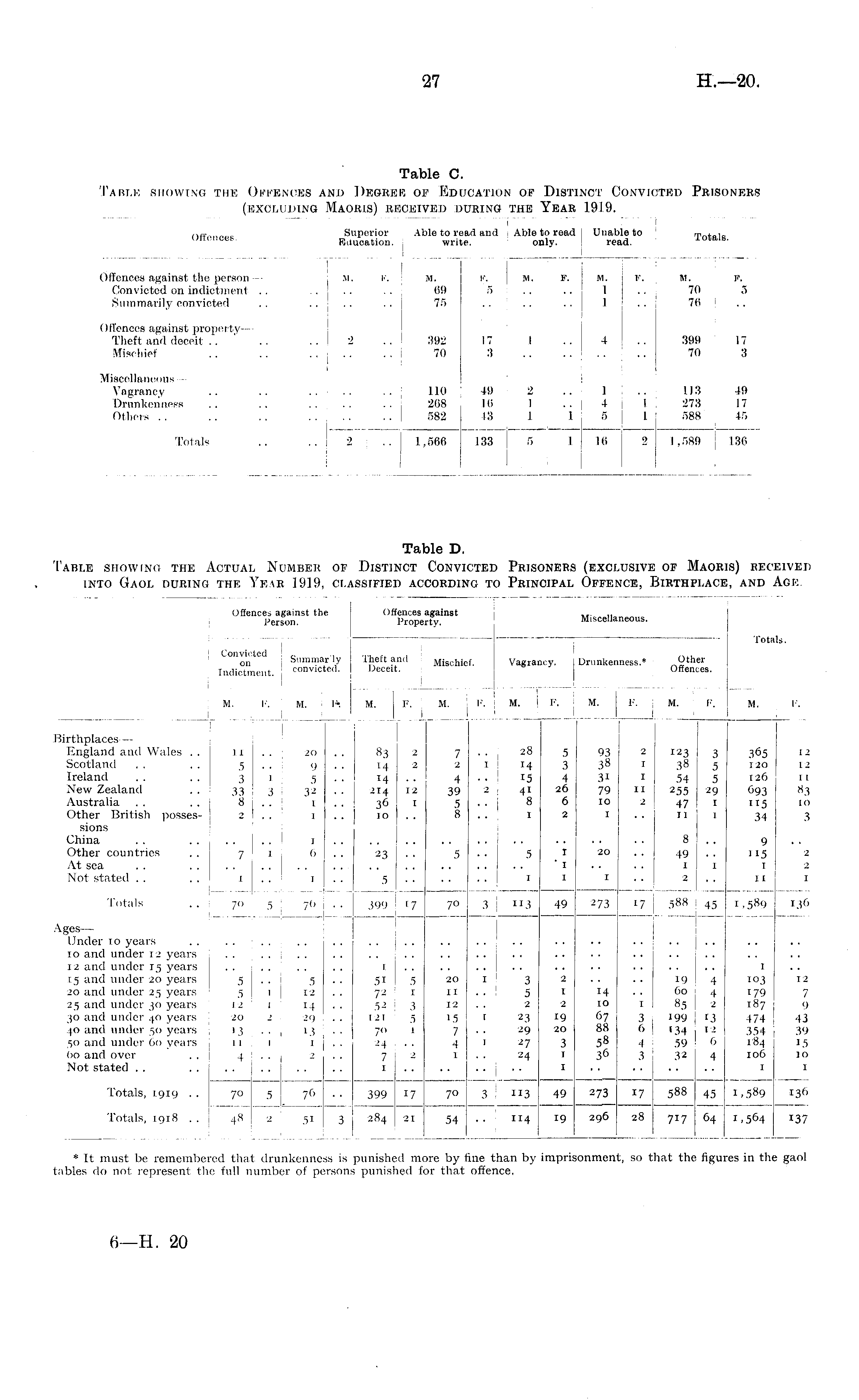 Table C. Table showing the Offences and Degree of Education of Distinct Convicted Prisoners (excluding Maoris) received during the Year 1919.