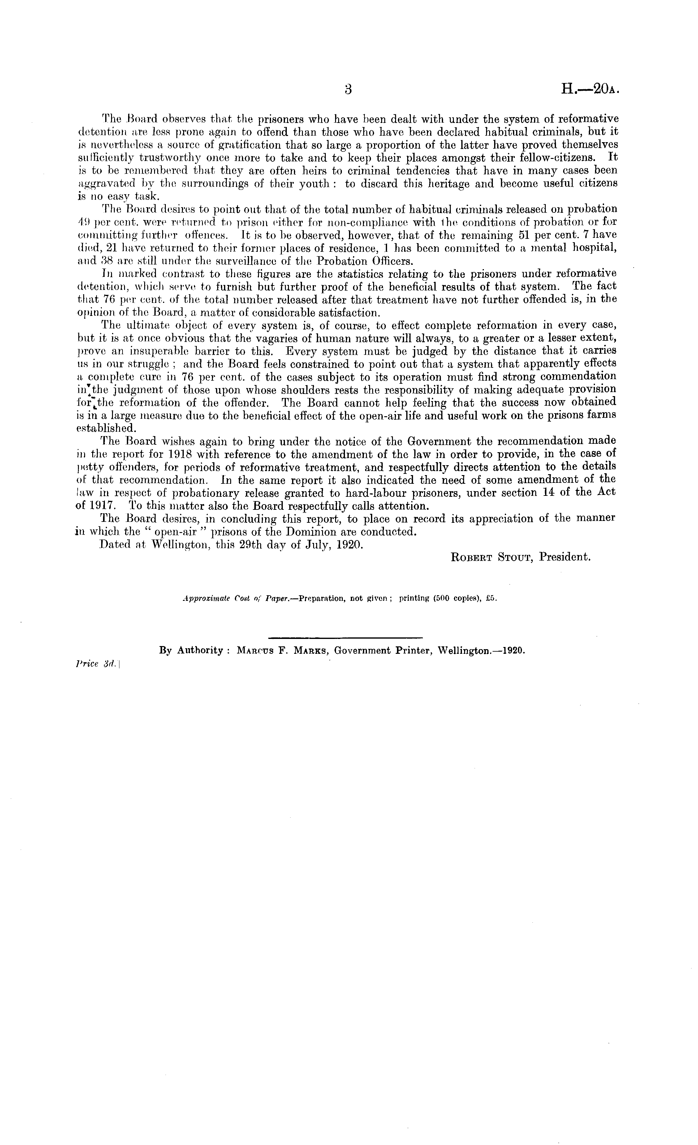 The Board observes that the prisoners who have been dealt with under the system of reformative detention are less prone again to offend than those who have been declared habitual criminals, but it is nevertheless a source of gratification that so large a proportion of the latter have proved themselves sufficiently trustworthy once more to take and to keep their places amongst their fellow-citizens. It is to be remembered that they are often heirs to criminal tendencies that have in many cases been aggravated by the surroundings of their youth : to discard this heritage and become useful citizens is no easy task. The Board desires to point out that of the total number of habitual criminals released on probation 49 per cent, were returned to prison cither for non-compliance with the conditions of probation or for committing further offences. It is to be observed, however, that of the remaining 51 per cent. 7 have died, 21 have returned to their former places of residence, ] has been committed to a mental hospital, and 38 are still under the surveillance of the Probation Officers. In marked contrast to these figures are the statistics relating to the prisoners under reformative detention, which serve to furnish but further proof of the beneficial results of that system. The fact that 76 per cent, of the total number released after that treatment have not further offended is, in the opinion of the Board, a matter of considerable satisfaction. The ultimate object of every system is, of course, to effect complete reformation in every case, but it is at once obvious that the vagaries of human nature will always, to a greater or a lesser extent, prove an insuperable barrier to this. Every system must be judged by the distance that it carries us in our struggle ; and the Board feels constrained to point out that a system that apparently effects a complete cure in 76 per cent, of the cases subject to its operation must find strong commendation in'the judgment of those upon whose shoulders rests the responsibility of making adequate provision for'the reformation of the offender. The Board cannot help feeling that the success now obtained is in a large measure due to the beneficial effect of the open-air life and useful work on the prisons farms established. The Board wishes again to bring under the notice of the Government the recommendation made in the report for 1918 with reference to the amendment of tho law in order to provide, in the case of petty offenders, for periods of reformative treatment, and respectfully directs attention to the details of that recommendation. In the same report it also indicated tho need of some amendment of the law in respect of probationary release granted to hard-labour prisoners, under section 14 of the Act of 1917. To this matter also the Board respectfully calls attention. The Board desires, in concluding this report, to place on record its appreciation of the manneT in which the " open-air " prisons of the Dominion are conducted. Dated at Wellington, this 29th day of July, 1920. Robert Stout, President.