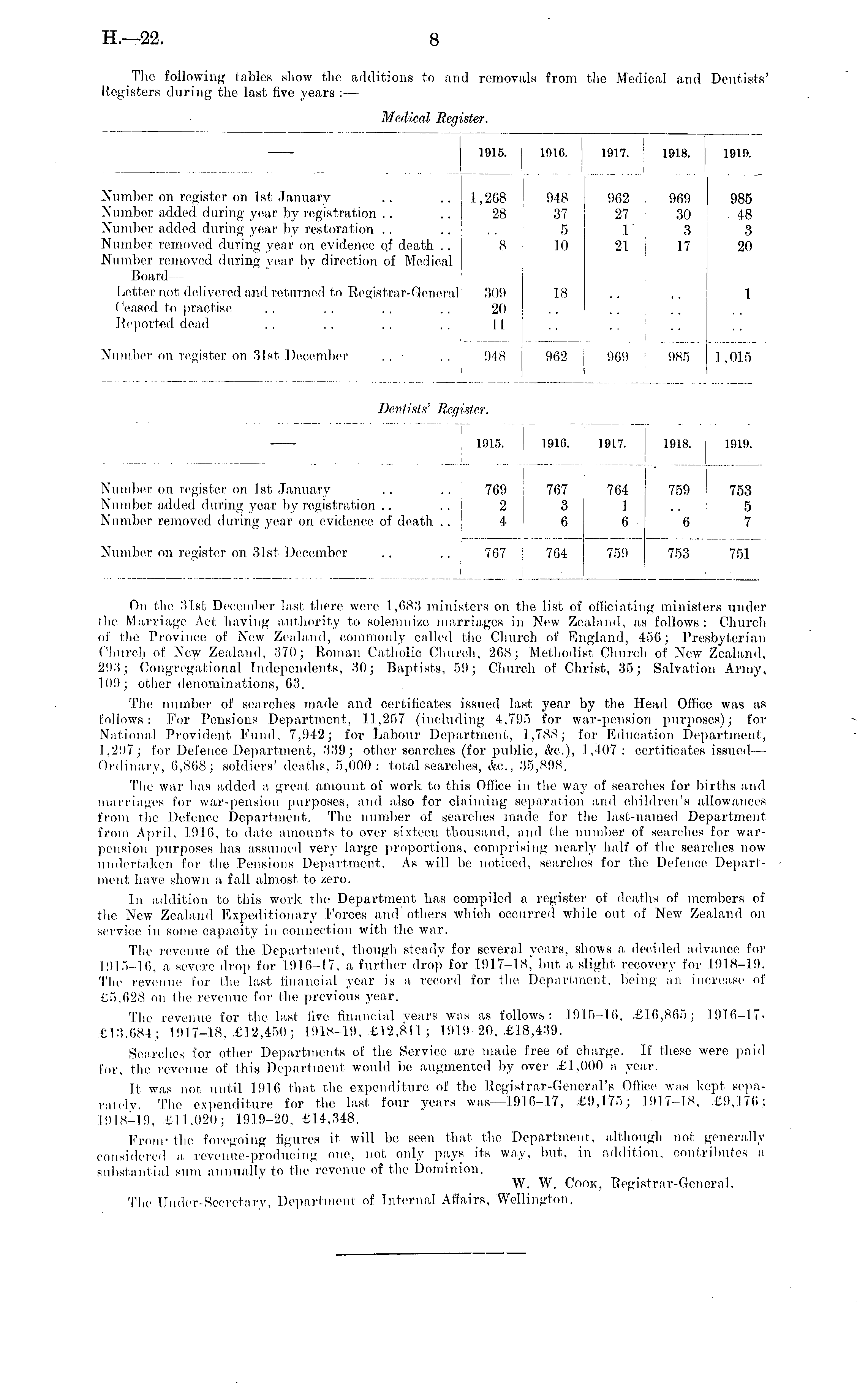 On the .'iist December last there were 1,683 ministers on the list of officiating ministers under the Marriage Act having authority to solemnize marriages in New Zealand, as follows : Church of Ihc Province of New Zealand, commonly called the Church of England, 456; Presbyterian Church of New Zealand, 370 j Roman Catholic Church, 268; Methodist Church of New Zealand, 293; Congregational Independents, 30; Baptists; 59; Church of Christ, 35; Salvation Army, 10!); other denominations, 63. The number of searches made and certificates issued last year by the Head Office was as follows: .For Pensions Department, 11,257 (including 4,795 for war-pension purposes); for National Provident Fund, 7,942; for Labour Department, 1,788; for Education Department, 1,297; for Defence Department, 339; other searches (for public, eve.), 1,107 : certificates issued— Ordinary, 6,808; soldiers' deaths, 5,000: total searches. <fee, 35,898. The war has added a great amount of work to this Office in the way of searches for births and marriages for war-pension purposes, and also for claiming separation and children's allowances from the Defence Department. The number of searches made for the last-named Department from April, 1916, to date amounts to over sixteen thousand, and the number of searches for warpension purposes has assumed very large proportions, comprising nearly half of the searches now undertaken for the Pensions Department. As will be noticed, searches for the Defence Department have shown a fall almost to zero. In addition to this work the Department lias compiled a, register of deaths of members of the New Zealand Expeditionary h'orces and others which occurred while out of New Zealand on service in some capacity in connection with the war. The revenue of the Department, though steady for several years, shows a decided advance for 1915- Mi. a severe drop for 1916-17, a further drop for 1917-18, but a slight recovery for 1918-49. The revenue for the last financial year is a record for the Department, being an increase of £5,628 on the revenue for the previous year. The revenue for the last five financial years was as follows: 1915-16, £16,865; 1916—17 » £13,684; 1917-18, £12,450; 1918-19, £12,811; 1919-20, £18,439. Searches for other Departments of the Service are made free of charge. If these were paid for, the revenue of this Department would be augmented by over £1,000 a year. li was not until 19T6 that the expenditure of the Registrar-General's Office was kept separately. The expenditure for the last four years was—l9l6-17, £9,175; 1917-18, £9,176; I!) I, slid, £11,020; 1919-20, £14,348. From- the foregoing figures it will be seen that the Department, although not generally considered a, revenue-producing one, not only pays its way, but, in addition, contributes a substantial sum annually to the revenue of the Dominion. W. W. Cook, Registrar-General. The Under-Secretary, Departmeni of Internal Affairs, Wellington.