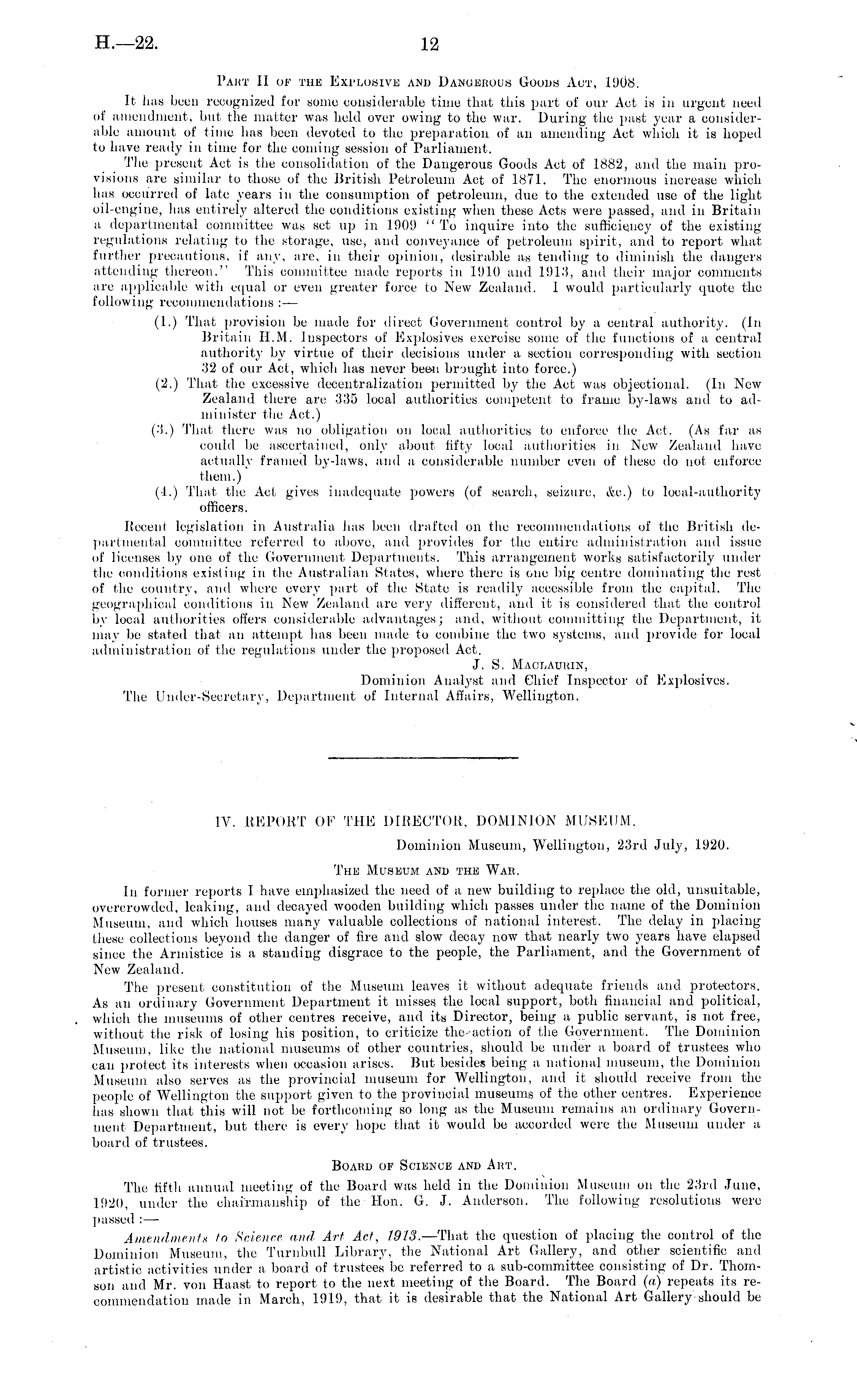 IV. REPORT OF THE DIRECTOR, DOMINION MUSEUM. Dominion Museum, Wellington, 23rd July, 1920. The Mas hum and the War. In former reports I have emphasized the need of a new building to replace the old, unsuitable, overcrowded, leaking, and decayed wooden building which passes under the name of the Dominion Museum, and which houses many valuable collections of national interest. The delay in placing these collections beyond the danger of tire and slow decay now that nearly two years have elapsed since the Armistice is a standing disgrace to the people, the Parliament, and the Government of New Zealand. The present constitution of the Museum leaves it without adequate friends and protectors. As an ordinary Government Department it misses the local support, both financial and political, which the museums of other centres receive, and its Director, being a. public servant, is not free, without the risk of losing his position, to criticize theaction of the Government. The Dominion Museum, like the national museums of other countries, should be under a board of trustees who can protect its interests when occasion arises. But besides being a national museum, the Dominion Museum also serves as the provincial museum for Wellington, and it should receive from the people of Wellington the support given to the provincial museums of the other centres. Experience has shown that this will not be forthcoming so long as the Museum remains an ordinary Government Department, but there is every hope that it would be accorded were the Museum under a board of trustees. BoAiiD of Science and Art. The fifth annual meeting of the Board was held in the Dominion Museum on the 23rd June, 1920, under the chairmanship of the Lion. G. J. Anderson. The following resolutions were passed : — Amendment* to Science and Art Act, 1913. —That the question of placing the control of the Dominion Museum, the Turnbull Library, the National Art Gallery, and other scientific and artistic activities under a, board of trustees be referred to a sub-committee consisting of Dr. Thomson and Mr. yon Haast to report to the next meeting of the Board. The Board (a) repeats its recommendation made in March, l(.)ii), that it is desirable that the National Art Gallery should be