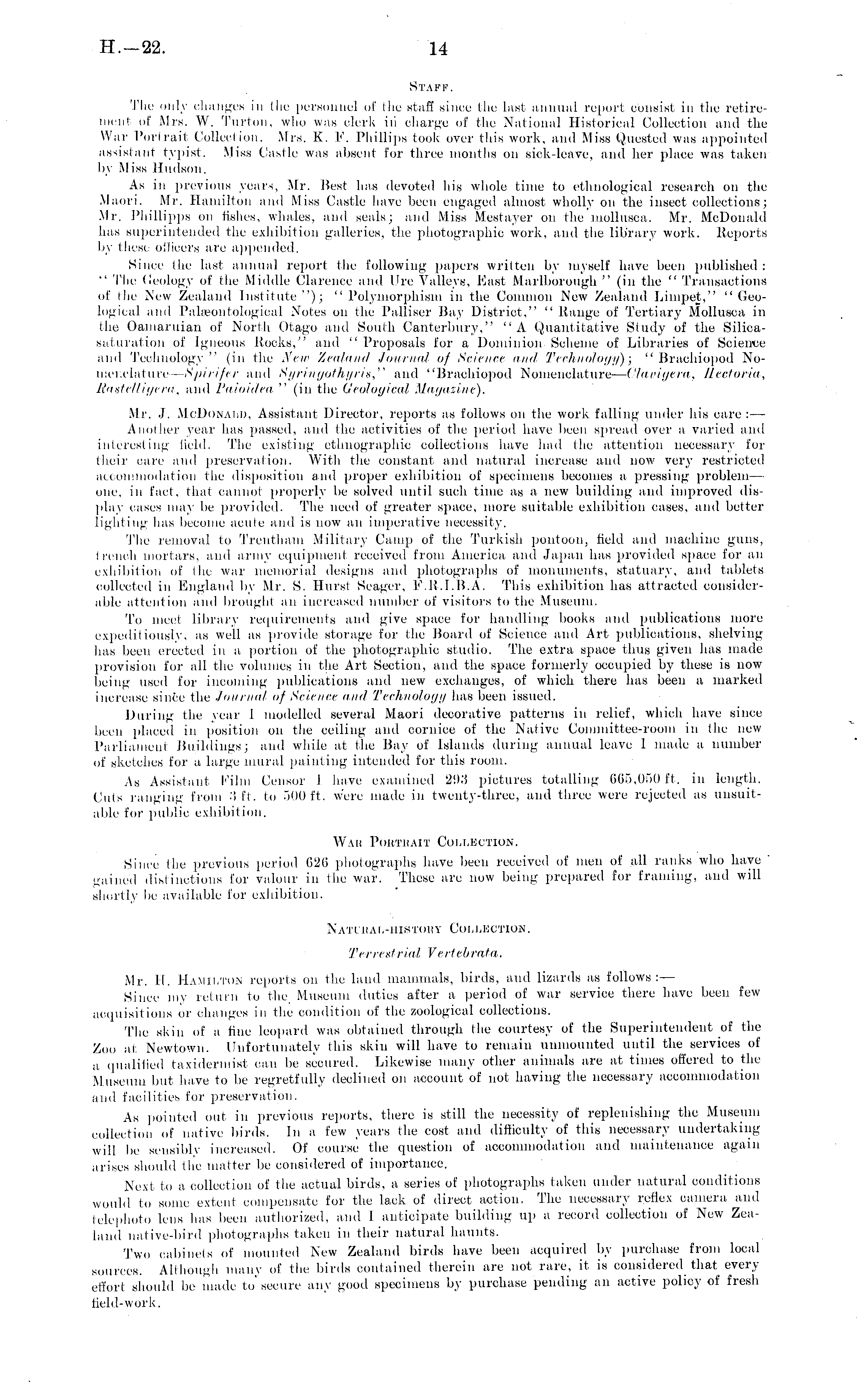 The only changes m (lie personnel of the staff since the last annual report consist in the retireitieiii of Mrs. W. Tiirton, who was clerk iii charge of the National Historical Collection and the War Portrait Collection; Mrs. K. l-f, Phillips took over this work, and Miss Quested was appointed assistant typist. Miss Castle was absent for three months on sick-leave, and her place was taken by Miss Hudson. As in previous years, Mr. Best has devoted his whole time to ethnological research on the Maori. Mr. Hamilton and Miss Castle have been engaged almost wholly on the insect collections; Mr, Phillipps on fishes, whales, and seals; and Miss Mestayer on the inollusea. Mr. McDonald has superintended the exhibition galleries, the photographic work, and the library work. Reports by these- officers are appended. Since the last annual report the following papers written by myself have been published : ' The Geology of the Middle Clarence and Ure Valleys, East Marlborough " (in the " Transactions of lhe Mew Zealand Institute "); " Polymorphism in the Common New Zealand Limpet," " Geological and Palißontologieal Notes on Ihe Palliser Bay District." "Range of Tertiary Mollusca in the Oamaruian of North Otagp and Souili Canterbury," "A Quantitative Study of the Silicasal urat ion of Igneous Rocks," and " Proposals for a Dominion Scheme of Libraries of Science and Technology " (in the New Zealand Journal of Science and Technology); " Brachiopod Nomenclature—Hpirifer and Si/ri/tt/oftii/ris," and "Brachiopod Nomenclature — Glavigera, Hectoria, Rantell xjerti, and I'atoidea " (in the Geological Magazine), Mr. ,1. MoDonaijD, Assistant Director, reports as follows on the work falling under his care : — Another year has passed, and the activities of the period have been spread over a varied and interesting Held. The existing ethnographic collections have had the attention necessary for their care and preservation. With the constant and natural increase and now very restricted accommodation the disposition and proper exhibition of specimens becomes a pressing problem — one, in fact, that cannot properly be solved until such time as a new building and improved display cases may be provided. The need of greater space, more suitable exhibition eases, and better lighting; has become acute and is now an imperative necessity. The removal to Trenthani Military Camp of the Turkish pontoon, field and machine guns, trench mortars, and army equipment received from America, and Japan has provided space for an exhibition of the war memorial designs and photographs of monuments, statuary, and tablets collected in England by Mr. S. Hurst Seager, K.U.I .B.A. This exhibition has attracted considerable attention and brought an increased number of visitors to the Museum. To meet library requirements and give space for handling books and publications more expeditiously, as well as provide storage for the Board of Science and Art publications, shelving lias been erected in a portion of the photographic sludio. The extra space thus given has made provision for all the volumes in the Art Section, and the space formerly occupied by these is now being used for incoming publications and new exchanges, of which there has been a marked increase since the Journal of Science and Technology has been issued. During the year I modelled several Maori decorative patterns in relief, which have since been placed in position on the ceiling and cornice of the Native Committee-room in the new Parliament Buildings; and while at Ihe .Bay of Islands during annual leave 1 made a number of sketches for a large mural painting intended for this room. As Assistant Kilni Censor I have examined 2!).' i pictures totalling 1>05.050 ft. in length, Cuts ranging from 3ft. to 500 ft. were made in twenty-three, and three were rejected as unsuitable for public exhibition. War Portrait Collection. Since the previous period 020 photographs have been received of men of all ranks who have gained distinctions for valour in tin: war. These are now being prepared for framing, and will shortly be available for exhibition. Natuhal-histor? Collection, Terre.it rial Vertebral a. Mr. H. Hamilton reports on the land mammals, birds, and lizards as follows : — Since my return to the; Museum duties after a period of war service there have been few acquisitions or changes in Ihe condition of the zoological collections. The skin of a hue leopard was obtained through Ihe courtesy of the Superintendent of the Zoo at Newtown. Unfortunately this skin will have to remain unmounted until the services of a qualiliod taxidermist can be secured. Likewise many other animals are at times offered to the Museum hut have to be regretfully declined on account of not having Ihe necessary accommodation and facilities for preservation. As pointed out in previous reports, there is still (he necessity of replenishing (he Museum collection of native birds. In a few years the cost and difficulty of this necessary undertaking will be sensibly increased. Of course the question of accommodation and maintenance again arises should the matter be considered of importance. Next to a collection of the actual birds, a series of photographs taken under natural conditions would to some extent compensate for the lack of direct action. The necessary reflex camera and lelophoto lens has been authorized, and I anticipate building up a record collection of New Zealand native-bird photographs taken in their natural haunts. Two cabinets of mounted New Zealand birds have been acquired by purchase from local sources. Although many of the birds contained therein are not rare, il is considered that every effort should be made to'secure any g I specimens by purchase pending an active policy of fresh field-work.