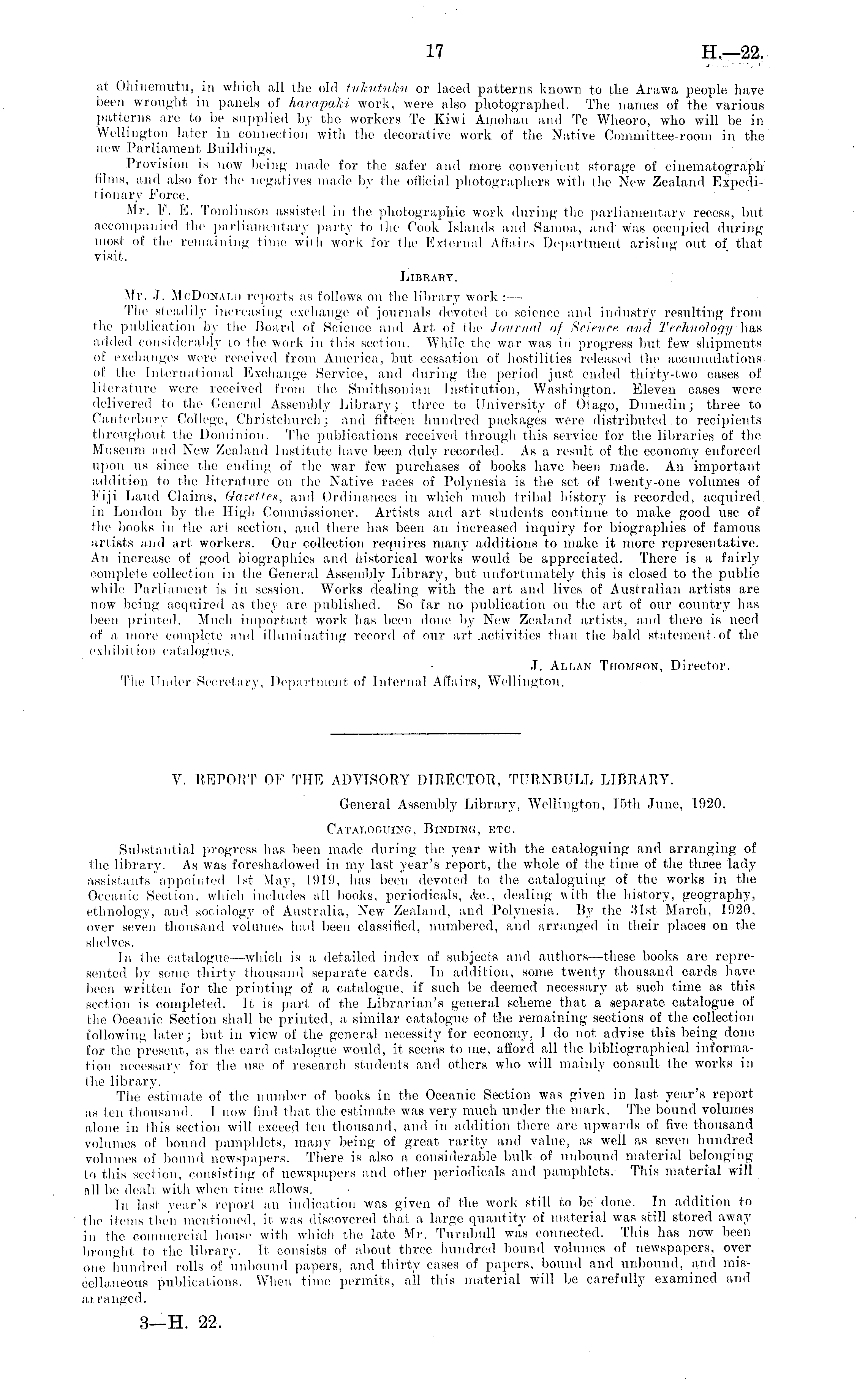 V. KEPORT OF THE ADVISOT?Y DIRECTOR, TURNBULL LIBRARY, General Assembly Library, Wellington, 15th June, 1920. Cataloguing, Binding, etc. Substantial progress lias been made during the year with the cataloguing and arranging of the library. As was foreshadowed in my last year's report, the whole of (lie time of the three lady assistants appointed Ist May, 1019, has been devoted to the cataloguing of the works in the Oceanic Section, which includes all books, periodicals, etc., dealing with the history, geography, ethnology, and sociology of Australia, New Zealand, and Polynesia. By the 81st March, 1920, over seven thousand volumes had been classified, numbered, and arranged in their places on the shelves. In the catalogue—which is a, detailed index of subjects and authors—these books are represented by some thirty thousand separate cards. In addition, some twenty thousand cards have been written for the printing of a, catalogue, if such be deemed necessary at such time as this section is completed. It is part of the Librarian's general scheme that a separate of (lie Oceanic Section shall be printed, a similar catalogue of the remaining sections of the collection following later; but in view of the general necessity for economy, 1 do not advise this being done for the present, as the card catalogue would, it seems to me, afford all the bibliographical information necessary for the use of research students and others who will mainly consult the works in the library. The estimate of the number of books in the Oceanic Section was given in last year's report as ten thousand, I now find that (he estimate was very much under the mark. The bound volumes alone in this section will exceed ten thousand, and in addition there are upwards of five thousand volumes of bound pamphlets, many being of great rarity and value, as well as seven hundred volumes of bound newspapers. There is also a considerable bulk of unbound material belonging to this section, consisting of newspapers and other periodicals and pamphlets. This material will nil be dealt with when time allows. In last year's report an indication was given of the work still to be done. In addition to the items then mentioned, it was discovered that a large quantity of material was still stored away in the commercial house with which the late Mr. Turnbull was connected. This has now been brought to the library. It consists of about three hundred bound volumes of newspapers, over one hundred rolls of unbound papers, and thirty cases of papers, bound and unbound, and miscellaneous publications. When time permits, all this material will be carefully examined and ai ranged.
