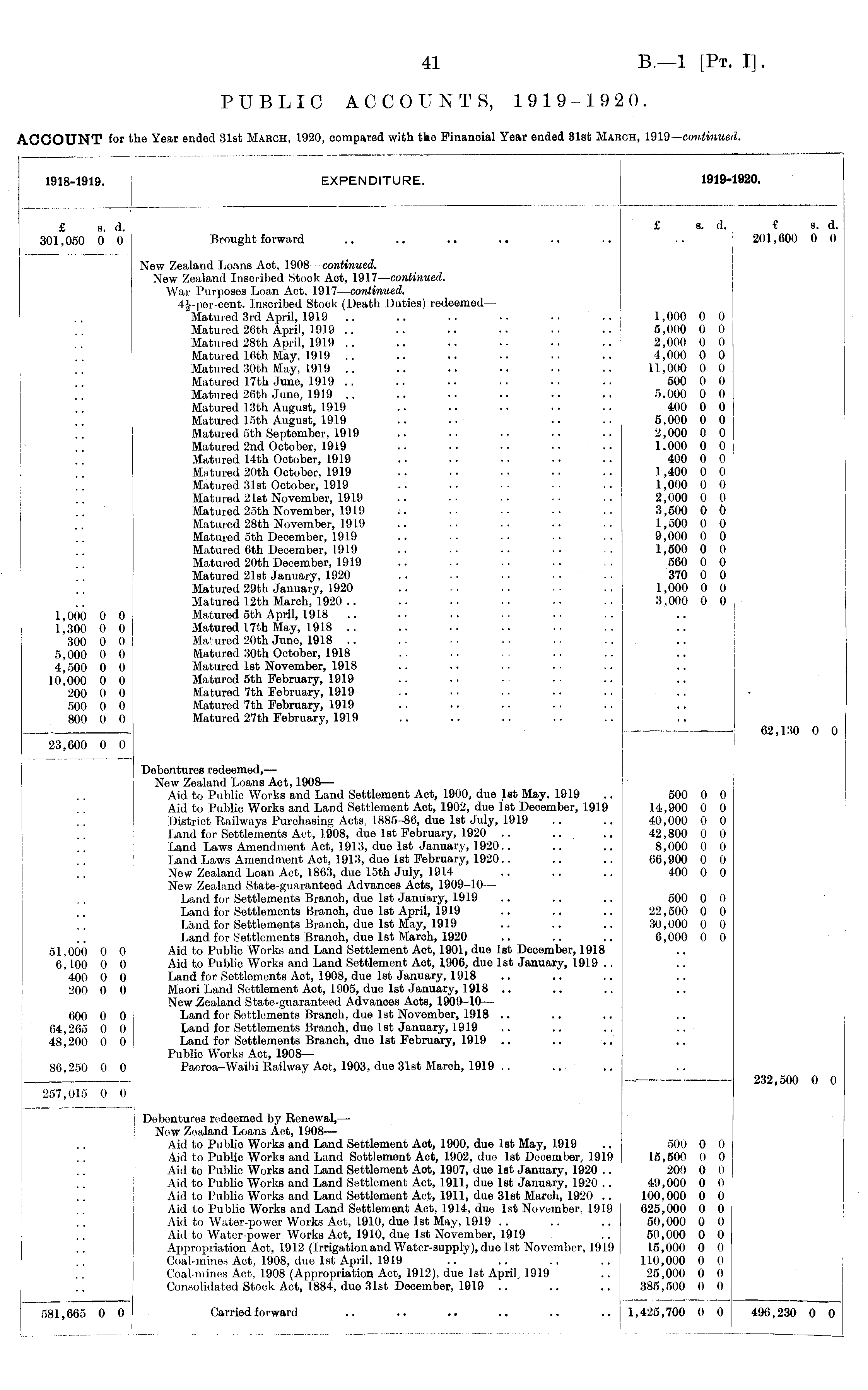 1918-1919. EXPENDITURE. 1919-1920. £ s. d. 301,050 0 0 £ s. d. £ a. d. 201,600 0 0 Brought forward New Zealand Loans Act, 1908— continued. New Zealand Inscribed Stock Act, 1917 — continued. War Purposes Loan Act, 1917— continued. 4£-per-cent. Inscribed Stock (Death Duties) redeemed — Matured 3rd April, 1919 .. .. .. •. • • Matured 26th April, 1919 Matured 28th April, 1919 Matured 16th May, 1919 Matured 30th May, 1919 Matured 17th June, 1919 Matured26th June, 1919 .. Matured 13th August, 1.919 Matured 15th August, 1919 Matured 5th September, 1.919 Matured 2nd October, 1919 . ■ • • • • .... Matured 14th October, 1919 Matured 20th October, 1919 Matured 31st October, 1919 Matured 21st November, 191.9 Matured 25th November, 1919 *. Matured 28th November, 1919 Matured 5th December, 1919 Matured 6th December, 1919 Matured 20th December, 1919 Matured 21st January, 1920 Matured 29th January, 1920 Matured 12th March, 1920 Matured 5th April, 1918 .. Matured 17th May, 1918 .. Matured 20th June, 1918 Matured 30th October, 1918 Matured 1st November, 1918 Matured 5th February, 1919 Matured 7th February, 1919 Matured 7th February, 1919 Maturod 27th February, 1919 1,000 0 0 5,000 0 0 2,000 0 0 4,000 0 0 11,000 0 0 500 0 0 5.000 0 0 400 0 0 5,000 0 0 2,000 0 0 1.000 0 0 400 0 0 1,400 0 0 1,000 0 0 2,000 0 0 3,500 0 0 1,500 0 0 9,000 0 0 1,500 0 0 560 0 0 370 0 0 1,000 0 0 3,000 0 0 1,000 0 0 1,300 0 0 300 0 0 5,000 0 0 4,500 0 0 10,000 0 0 200 0 0 500 0 0 800 0 0 62,130 0 23,600 0 0 Debentures redeemed, — New Zealand Loans Act, 1908 — Aid to Public Works and Land Settlement Act, 1900, due 1st May, 1919 Aid to Public Works and Land Settlement Act, 1902, due 1st December, 1.919 District Railways Purchasing Acts, 1885-86, due 1st July, 1919 Land for Settlements Act, 1908, due 1st February, 1920 .. Land Laws Amendment Act, 1913, duo 1st January, 1920.. Land Laws Amendment Aot, 1913, due 1st February, 1920.. New Zealand Loan Act, 1863, due 15th July, 1914 New Zealand State-guaranteed Advances Acts, 1909-10— Land for Settlements Branch, due 1st January, 1919 Land for Settlements Branch, due 1st April, 1919 Land for Settlements Branch, due 1st May, 191.9 Land for Settlements Branch, due 1st March, 1920 Aid to Public Works and Land Settlement Act, 1901, due 1st December, 1918 Aid to Public Works and Land Settlement Aot, 1906, due 1st January, 1919 .. Land for Settlements Act, 1908, due 1st January, 1918 Maori Land Settlement Aot, 1905, due 1st January, 1918 .. New Zealand State-guaranteed Advances Acts, 1909-10 — Land for Settlements Branch, due 1st November, 1918 Land for Settlements Branch, due 1st January, 1919 Land for Settlements Branch, due 1st February, 1919 Public Works Aot, 1908— Paoroa-Waihi Railway Aot, 1903, due 31st March, 1919 .. .. 500 0 0 14,900 0 0 40,000 0 0 42,800 0 0 8,000 0 0 66,900 0 0 400 0 0 500 0 0 22,500 0 0 30,000 0 0 6,000 0 0 51,000 0 0 6,100 0 0 400 0 0 200 0 0 600 0 0 64,265 0 0 48,200 0 0 86,250 0 0 257,015 0 0 232,500 0 0 Debentures redeemed by Renewal, —■ New Zealand Loans Act, 1908— Aid to Publio Works and Land Settlement Aot, 1900, due 1st May, 1919 Aid to Public Works and Land Settlement Act, 1902, due 1st Decernlier, 1919 Aid to Public Works and Land Settlement Aot, 1907, due 1st January, 1920 .. Aid to Public Works and Land Settlement Aot, 1911, due 1st January, 1920 .. Aid to Publio Works and Land Settlement Act, 1911, due 31st March, 1920 .. Aid to Public Works and Land Settlement Act, 1914, due 1st November, 1919 Aid to Water-power Works Act, 1910, due 1st May, 1919 .. Aid to Water-power Works Act, 1910, due 1st November, 1919 Appropriation Act, 1912 (Irrigation and Water-supply), due 1st November, 1919 Coal-mines Act, 1908, due 1st April, 1919 Coal-mines Act, 1908 (Appropriation Act, 1912), due 1st April, 1919 Consolidated Stock Act, 1884, due 31st December, 1919 500 0 0 15,500 0 0 200 0 0 49,000 0 0 100,000 0 0 625,000 0 0 50,000 0 0 50,000 0 0 15,000 0 0 110,000 0 0 25,000 0 0 385,500 0 0 Carried forward 1,425,700 0 0 496,230 0 0 581,665 0 0