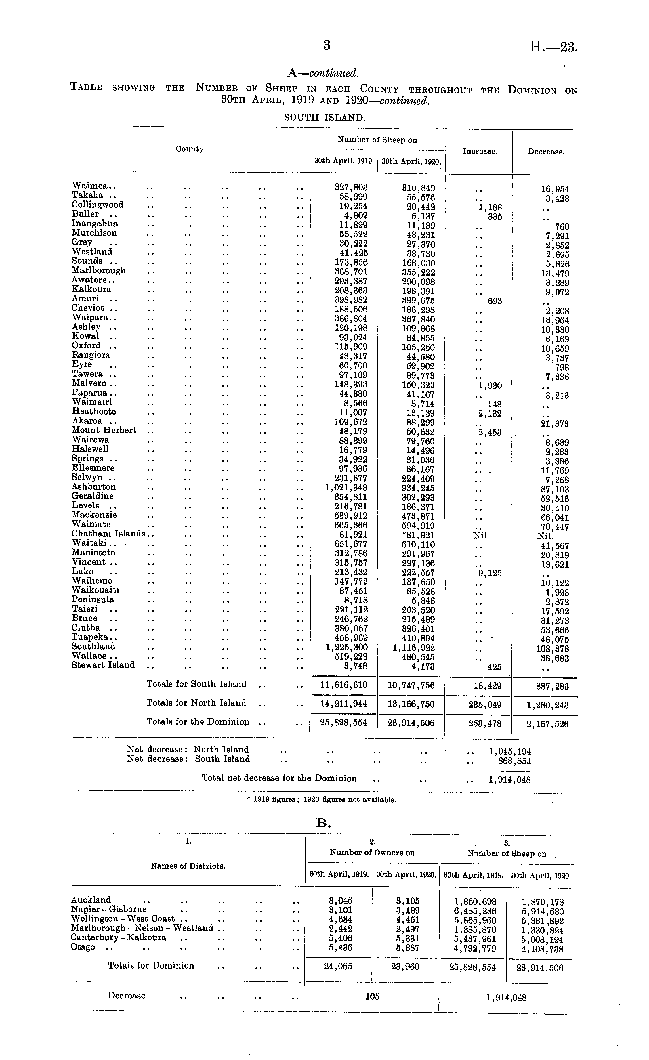 1. 2. 3. Number of Owners on Number of Sheep on Names of Districts. 30th April, 1919. 30th April, 1920. 30th April, 1919. 30th April, 1920. Luckland Tapier - Gisborne Vellingtou -West Coast .. larlborough - Nelson - Westland .. lanterbury - Kaikoura Itago 3,046 3,101 4,634 2,442 5,406 5,436 3,105 3,189 4,451 2,497 5,331 0,387 1,860,698 6,485,286 5,865,960 1,385,870 5,437,961 4,792,779 1,870,178 5,914,680 5,381,892 1,330,824 5,008,194 4,408,738 Totals for Dominion 24,065 23,960 25,828,554 23,914,506 Decrease 1,91i,048