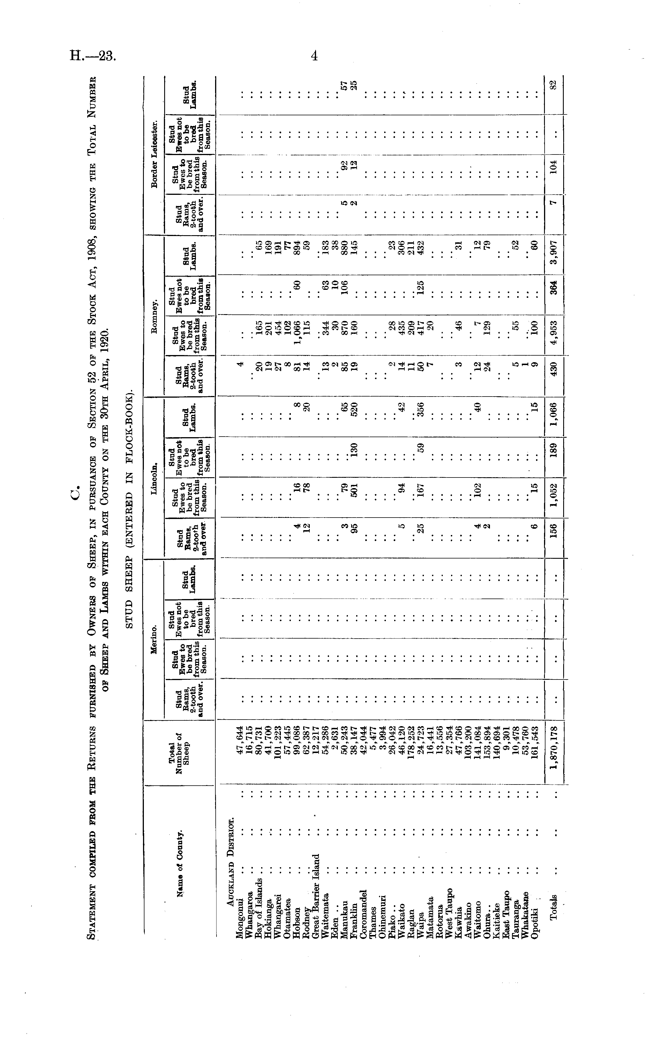 C. Statement compiled from the Returns furnished by Owners of Sheep, in pursuance of Section 52 of the Stock Act, 1908, showing the Total Number of Sheep and Lambs within each County on the 30th April, 1920. STUD SHEEP (ENTERED IN FLOCK-BOOK).