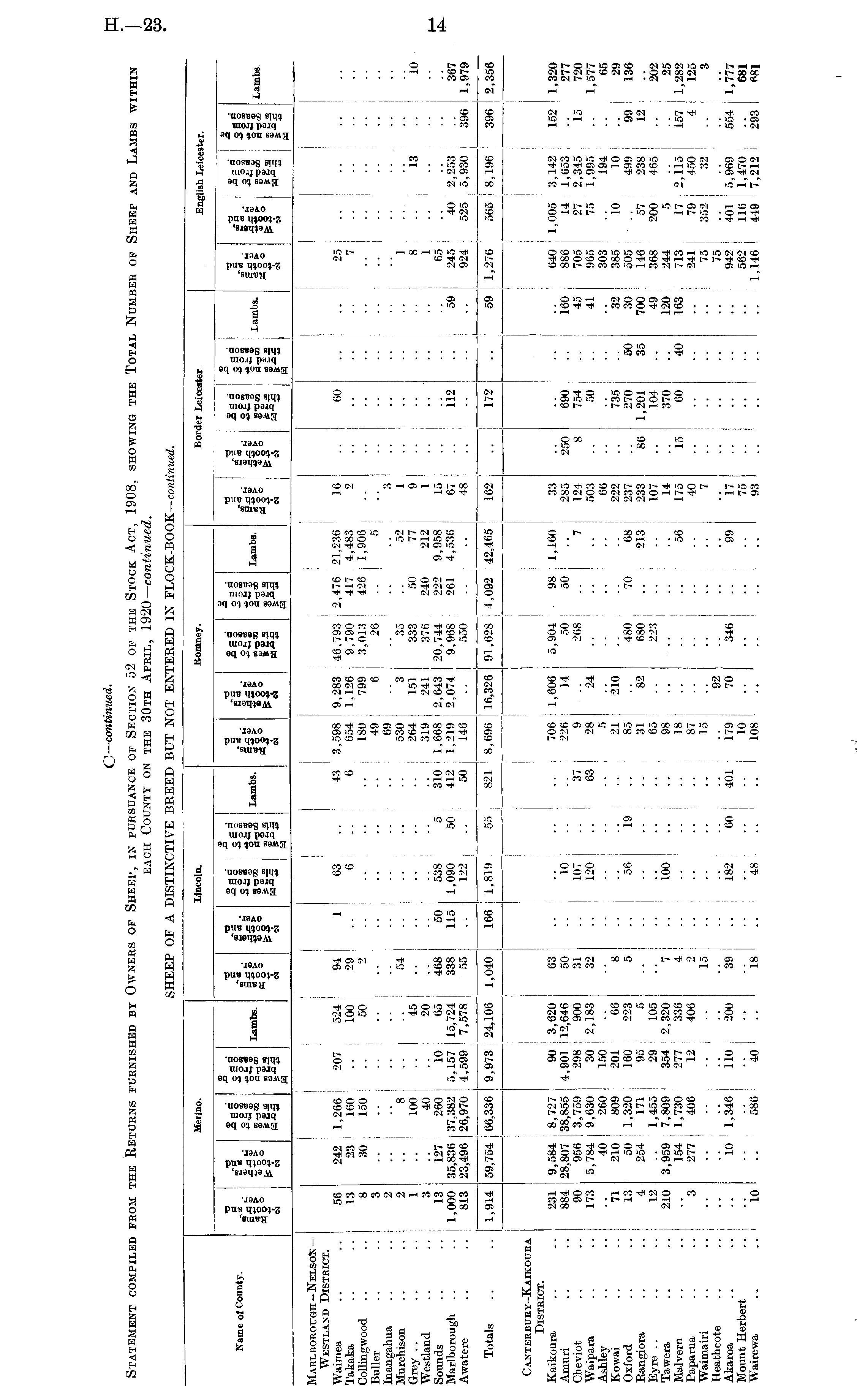 C— continued. Statement compiled from the Returns furnished by Owners of Sheep, in pursuance of Section 52 of the Stock Act, 1908, showing the Total Number of Sheep and Lambs within each County on the 30th April, 1920— continued. SHEEP OF A DISTINCTIVE BREED BUT NOT ENTERED IN FLOCK-BOOK— continued.
