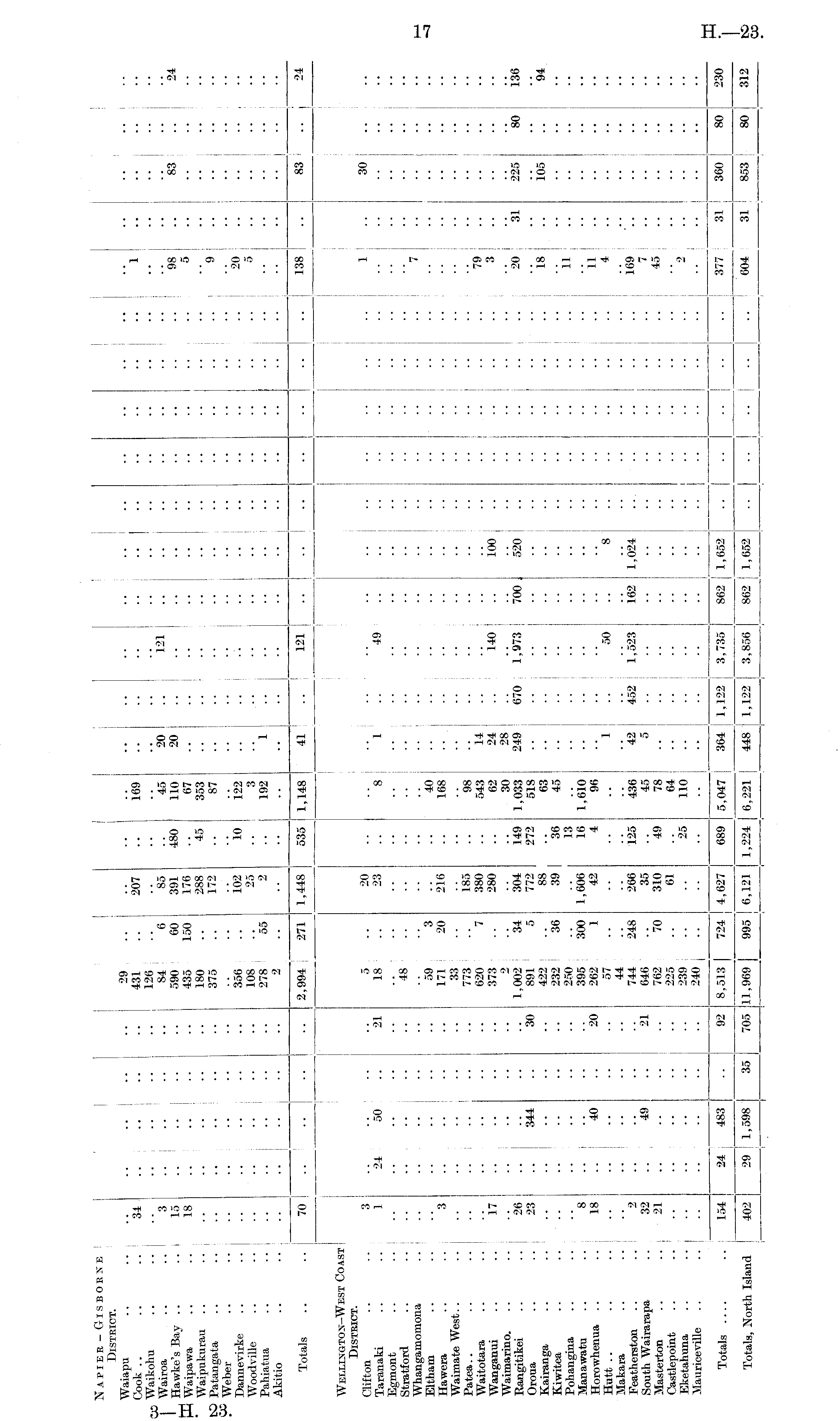 Napier - Gisborxe District. 1 Waiapu Cook Waikohu Wairoa Hawke's Bay Waipawa Waipukurau Patangata Weber Dannevirke WoodviUe Pahiatua Akitio 34 3 15 18 29 431 126 84 590 435 180 375 6 60 150 207 85 391 176 288 172 169 45 110 67 353 87 20 20 .. " .. •• ! 83 24 480 121 98 5 '• 45 9 • • .. •• -• I ■• •• 356 108 278 2 55 102 25 2 10 122 3 192 •• 1 ■• '-• •• 20 5 - •• .. ■ •' I Totals 70 70 2,994 271 1,448 535 1,148 41 121 j 138 83 I 24 — r ... _ W'ellixgton-West Coast | District. 30 Clifton Taranaki Egmont .. Stratford Whangamomona Eltham .. Hawera Waimate West Patea Waitotara Wanganui Waimarino Rangitikei Oroua Kairanga Kiwitea Pohangina .. Manawatu .. Horowhenua .. .. I Hutt .. .. .. I Makara .. Featherston South Wairarapa Masterton .. Castlepoint .. .. | Eketahuna Maurieeville 3 1 3 17 26 23 8 18 2 32 21 24 50 21 5 18 48 20 23 8 1 •■ 49 " 1 7 •• •• •• " 59 171 33 773 620 373 2 1,002 891 422 232 250 395 262 57 44 744 646 762 225 239 240 j 3 20 7 34 5 36 300 248 70 216 40 168 185 380 280 ■ .. .. I I 304 772 88 39 149 272 98 543 62 30 1,033 518 63 45 14 24 28 249 ; 670 140 1,973 700 100 520 79 3 20 31 •■ .. 225 105 80 136 94 344 30 is 1,606 42 36 13 16 4 1,610 96 " l 50 " 11 I 40 20 11 4 162 8 1,024 169 45 j •- .. •- 49 21 266 35 310 61 125 49 436 45 78 64 110 42 5 452 1,523 " ■• 25 2 .. •• •• Totals 154 24 483 92 8,513 | 724 4,627 689 j 5,047 j 689 364 j 1,122 i 3,735 364 1,122 3,735 S62 1,652 377 31 360 80 230 Totals, North Island 402 29 1,598 35 705 11,969 995 6,121 i i 1,224 I 6,221 I i ! 448 1,122 3,856 862 1,652 604 i 31 853 I 80 312