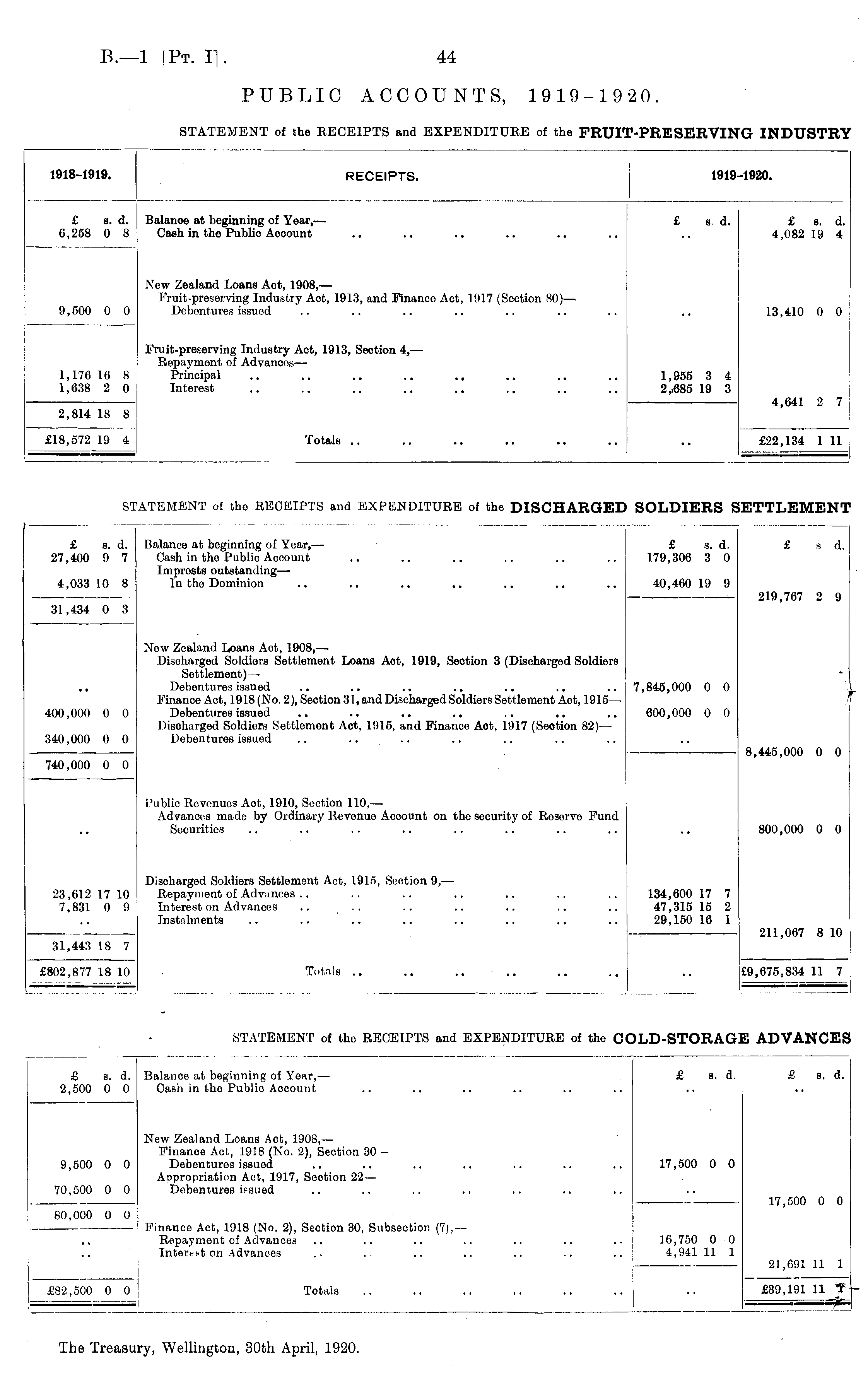 1918-1919. RECEIPTS. 1919-1920. £ s. d. 6,258 0 8 Balanoe at beginning of Year, — Cash in the Publio Acoount £ s d. £ s. d. 4,082 19 4 9,500 0 0 New Zealand Loans Act, 1908, — Fruit-preserving Industry Act, 1913, and Finance Act, 1917 (Section 80) — Debentures issued 13,410 0 0 1,176 16 8 1,638 2 0 Fruit-preserving Industry Act, 1913, Seotion 4, — Repayment of Advanoos— Principal Interest 1,955 3 4 2,685 19 3 4,641 2 7 2,814 18 8 Totals £18,572 19 4 £22,134 1 11 STATEMENT of tho RECEIPTS and EXPENDITURE of the DISCHARGED SOLDIERS 1ETTLEMEN £ s. d. Balance at beginning of Year, — 27,400 9 7 Cash in tho Public Account Imprests outstanding— 4,033 10 8 In the Dominion £ s. d. 179,306 3 0 £ a d. 40,460 19 9 219,767 2 9 31,434 0 3 New Zealand Loans Act, 1908, —, Discharged Soldiers Settlement Loans Aot, 1919, Section 3 (Discharged Soldiers SettlementDebentures issuod .. .. .. .. .. .. ' Finance Act, 1918 (No. 2), Section 31, and Discharged Soldiers Settlomont Act, 1915— 400,000 0 0 Debentures issued Disohargod Soldiers Settlement Act, 1915, and Finance Aot, 1917 (Seotion 82) — 340,000 0 0 Debentures issued 7,845,000 0 0 400,000 0 0 600,000 0 0 340,000 0 0 8,445,000 0 0 740,000 0 0 740,000 0 0 Public Revenues Aot, 1910, Section 110, —■ Advances made by Ordinary Revenuo Account on tho security of Roserve Fund Securities 800,000 0 0 Discharged Soldiers Settlement Act, 1915, Section 9, — 23,612 17 10 Repayment of Advances .. 7,831 0 9 Interest on Advances .. .. Instalments 31 4AS is 7 23,612 17 10 7,831 0 9 134,600 17 7 47,315 15 2 29,150 16 1 211,067 8 10 31,443 18 7 £802,877 18 10 . Totals .. .. .. .. 31,443 18 7 £802,877 18 10 £9,675,834 11 7 STATEMENT of the RECEIPTS and EXPENDITURE of tho CO >ld-storag: ADVANCES £ s. d. Balance at beginning of Year, — 2,500 0 0 Cash in the Publio Account £ s. d. £ a. d. New Zealand Loans Aot, 1908, — Finance Act, 1918 (No. 2), Section 30 - 9,500 0 0 Debentures issued Appropriation Aot, 1917, Seotion 22 — 70,500 0 0 Debentures issued 9,500 0 0 17,500 0 0 17,500 0 0 70,500 0 0 80,000 0 0 Finance Act, 1918 (No. 2), Section 30, Subsection (7),— Repayment of Advances Interest on Advances 80,000 0 0 16,750 0 0 4,941 11 1 21,691 11 1 £82,500 0 0 Totals £82,500 0 0 £39,191 11 * The Treasury, Wellington, 30th April, 1920.
