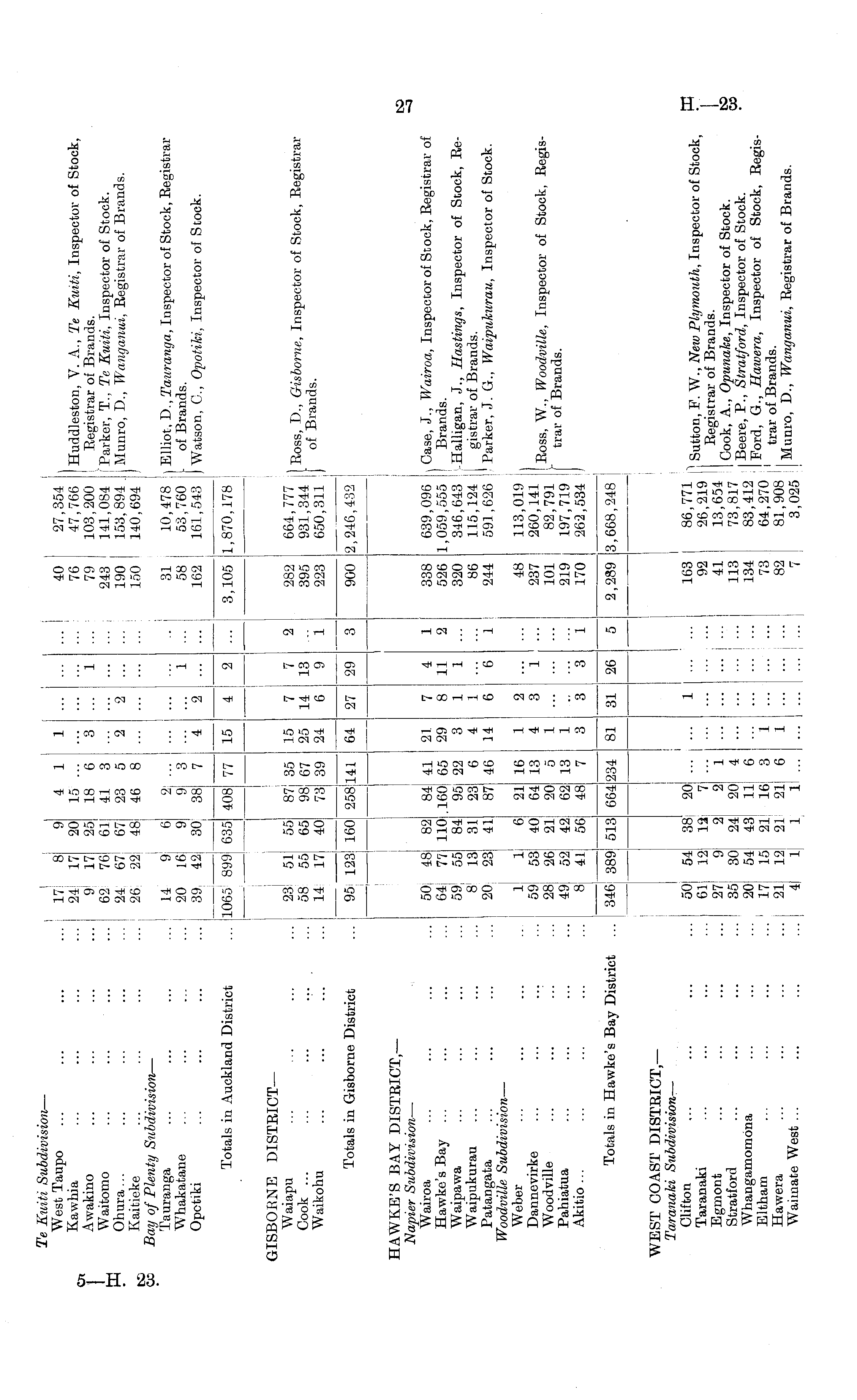 Te Kuiti Subdivision — West Taupo Kawhia Awakino Waitomo Ohura... Kaitieke Bay of Plenty Subdivision — Tauranga Whakatane Opotiki I I 17 8 24 17 9 17 62 76 24 67 26 22 9 20 25 61 67 48 4 15 18 41 23 46 1 6 3 5 8 l 3 2 ... 2 ... i ... ... 40 76 79 243 190 150 27,354 47,766 103,200 141,084 153, 894 . 140,694 j Huddleston, V. A., Te Kuiti, Inspector of Stock, I Registrar of Brands. Parker, T., Te Kuiti, Inspector of Stock. ; Munro, D., Wanganui, Registrar of Brands. 14 9 20 16 39 42 6 9 30 2 1 9 38| 3 7 ... 4 -2 l 31 58 162 10,478 ' 53,760 161,543 Elliot, D., Tauranga, Inspector of Stock, Registrar of Brands. Watson, C, Opotiki, Inspector of Stock. ... Totals in Auckland District 1065 899 I i i : — 635 408 77 15 4 2 3,105 1,870,178 i . GISBORNE DISTRICT— Waiapu Cook ... Waikohu 23 51 58 55 14 17 55 65 40 87 98 73 35 67 39 15 25 24 7 14 6 7 13 9 2 1 282 395 223 664,777 931,344 650,311 ) Ross, D., Gisborne, Inspector of Stock, Registrar f of Brands. Totals in Gisborne District i i 95 123 I 160 258 1 141 64 27 29 3! 900 2,246,432 '■ ! ! i HAWKE'S BAY DISTRICT — Napier Subdivision — Wairoa Hawke's Bay ... Waipawa Waipukurau Patangata WoodviUe Subdivision — Weber Dannevirke WoodviUe Pahiatua Akitio ... 50 48 64i 77 59, 55 8 13 20 23 82 110 84 31 41 84 .160 95j 23 87 41 65 22 46 21 29 3 4 14 7 8 1 1 6 I 4 11 1 6 1 2 1 338 526 320 86 244 639,096 1,059,555 346,643 115,124 591,626 i Case, J., Wairoa, Inspector of Stock, Registrar of ! Brands. -Halligan, J., Hastings, Inspector of Stock, Registrar of Brands. Parker, J. G., Waipukurau, Inspector of Stock. 1 1 59 53 28 26 49 52 8 41 6 40 21 42 56! 21 64 20 62 48 16 13 13 7 1 4 1 1 3 2 3 "i ... 48 237 101 219 170 113,019 260,141 82,791 197,719 262,534 ! Ross, W., WoodviUe, Inspector of Stock, Registrar of Brands. 3 3 i Totals in Hawke's Bay District —! — I ■ I ! 346j 389 513 664 234 81 31 26 5 2,289 3,668,248 ! WEST COAST DISTRICT — Taranaki Subdivision — Clifton Taranaki Egmont Stratford Whangamomona Eltham Hawera Waimate West ... i 50j 61 27 35 20 17 21 4 54 12 9 30 15 12 1 38| 12 2 24 43 21 21 20 7 2 20 11 16 21 1 4 6 3 6 1 163 92 41 113 134 73 82 7 86,771 26,219 13,654 73,817 83,412 64,270 81,908 3,025 Sutton, F. W., New Plymouth, Inspector of Stock, Registrar of Brands. Cook, A., Opunake, Inspector of Stock. Beere, P., Stratford, Inspector of Stock. Ford, G., Hawera, Inspector of Stock, Registrar of Brands. Munro, D., Wanganui, Registrar of Brands. l l