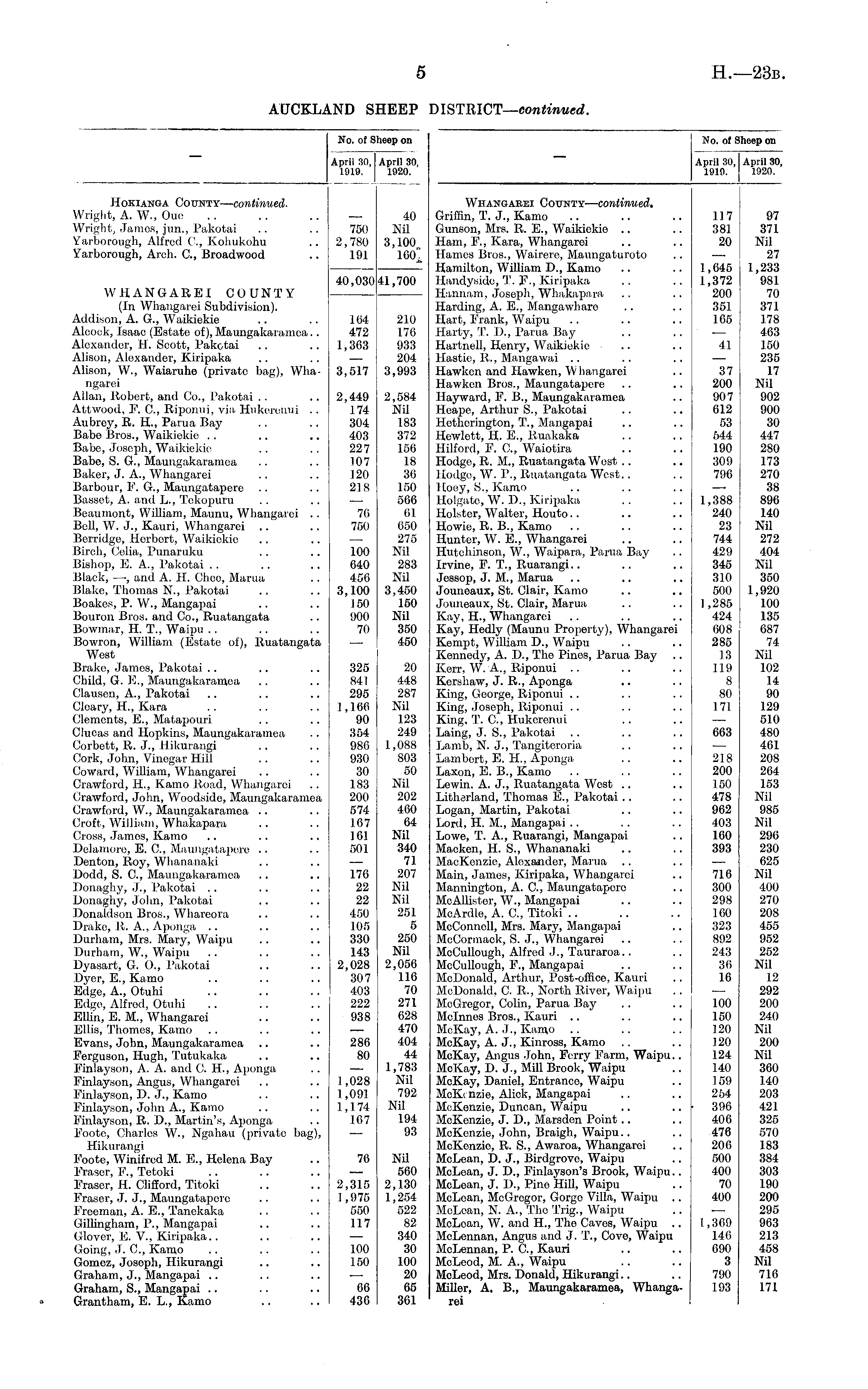 No. of Sheep on April 30,1 April 30, 1919. 1920. Hokianga County— continued. Wright, A. W., Oue Wright, James, jun., Pakotai Yarborough, Alfred C, Kohukohu Yarborough, Arch. G, Broadwood 750 2,780 191 40 Nil 3,100 100. WHANGAREI COUNTY (In Whangarei Subdivision). Addison, A. G., Waikiekie Alcook, Isaac (Estate of), Maungakaramea.. Alexander, H. Seott, Pakotai Alison, Alexander, Kiripaka Alison, W., Waiaruhe (private bag), Whangarei Allan, Robert, and Co., Pakotai Attwood, F. C, Riponui, via Hukereriui .. Aubrey, R. H., Parua Bay Babe Bros., Waikiekie Babe, Joseph, Waikiekie Babe, S. G., Maungakaramea Baker, J. A., Whangarei Barbour, F. G., Maungatapere Basset, A. and L., Tekopuru Beaumont, William, Maunu, Whangarei .. Bell, W. J., Kauri, Whangarei Berridge, Horbort, Waikiekie Birch, Celia, Punaruku Bishop, E. A., Pakotai Black, —-, and A. II. Chco, Marua Blake, Thomas N., Pakotai Boakes, P. W., Mangapai Bouron Bros, and Co., Ruatangata Bowmar, H. T., Waipu Bowron, William (Estate of), Ruatangata West Brake, James, Pakotai Child, G. E., Maungakaramea Clausen, A., Pakotai Clcary, H., Kara Clements, E., Matapouri Clueas and Hopkins, Maungakaramea Corbett, R. J., Hikurangi Cork, John, Vinegar Hill Coward, William, Whangarei Crawford, H., Kamo Road, Whangarei Crawford, John, Woodside, Maungakaramea Crawford, W., Maungakaramea Croft, William, Whakapara Cross, Jamos, Kamo Delamore, E. C, Maungatapere Denton, Roy, Whananaki Dodd, S. C, Maimgakaramoa Donaghy, J., Pakotai Donaghy, John, Pakotai Donaldson Bros., Whareora Drake, R. A., Aponga Durham, Mrs. Mary, Waipu Durham, W., Waipu Dyasart, G. 0., Pakotai Dyer, E., Kamo Edge, A., Otuhi Edge, Alfrod, Otuhi Ellin, E. M., Whangarei Ellis, Thomes, Kamo Evans, John, Maungakaramea Ferguson, Hugh, Tutukaka Finlayson, A. A. and C. H., Aponga Finlayson, Angus, Whangarei Finlayson, D. J., Kamo Finlayson, John A., Kamo Finlayson, R. D., Martin's, Aponga Foote, Charles W., Ngahau (private bag), Hikurangi Foote, Winifred M. E., Helena Bay Eraser, F., Tetoki Eraser, H. Clifford, Titoki Fraser, J. J., Maungatapere Freeman, A. E., Tanekaka Gillingham, P., Mangapai Glover, E. V., Kiripaka.. Going, J. C, Kamo Gomez, Josoph, Hikurangi Graham, J., Mangapai Graham, S., Mangapai Grantham, E. L., Kamo 40,030 104 472 1,363 3,517 2,449 174 304 403 227 107 120 218 70 750 100 640 456 3,100 150 900 70 325 841 295 1,166 90 354 986 930 30 183 200 574 167 161 501 41,700 210 176 933 204 3,993 2,584 Nil 183 372 156 18 36 150 566 01 650 275 Nil 283 Nil 3,450 150 Nil 350 450 20 448 287 Nil 123 249 1,088 803 50 Nil 202 460 04 Nil 340 71 207 Nil Nil 251 5 250 Nil 2,056 116 70 271 628 470 404 44 1,783 Nil 792 Nil 194 93 176 22 22 450 105 330 143 2,028 307 403 222 938 286 80 1 ,028 1,091 1,1.74 167 76 Nil 560 2,130 1,254 522 82 340 30 100 20 65 361 2,315 1,975 550 117 100 150 66 436