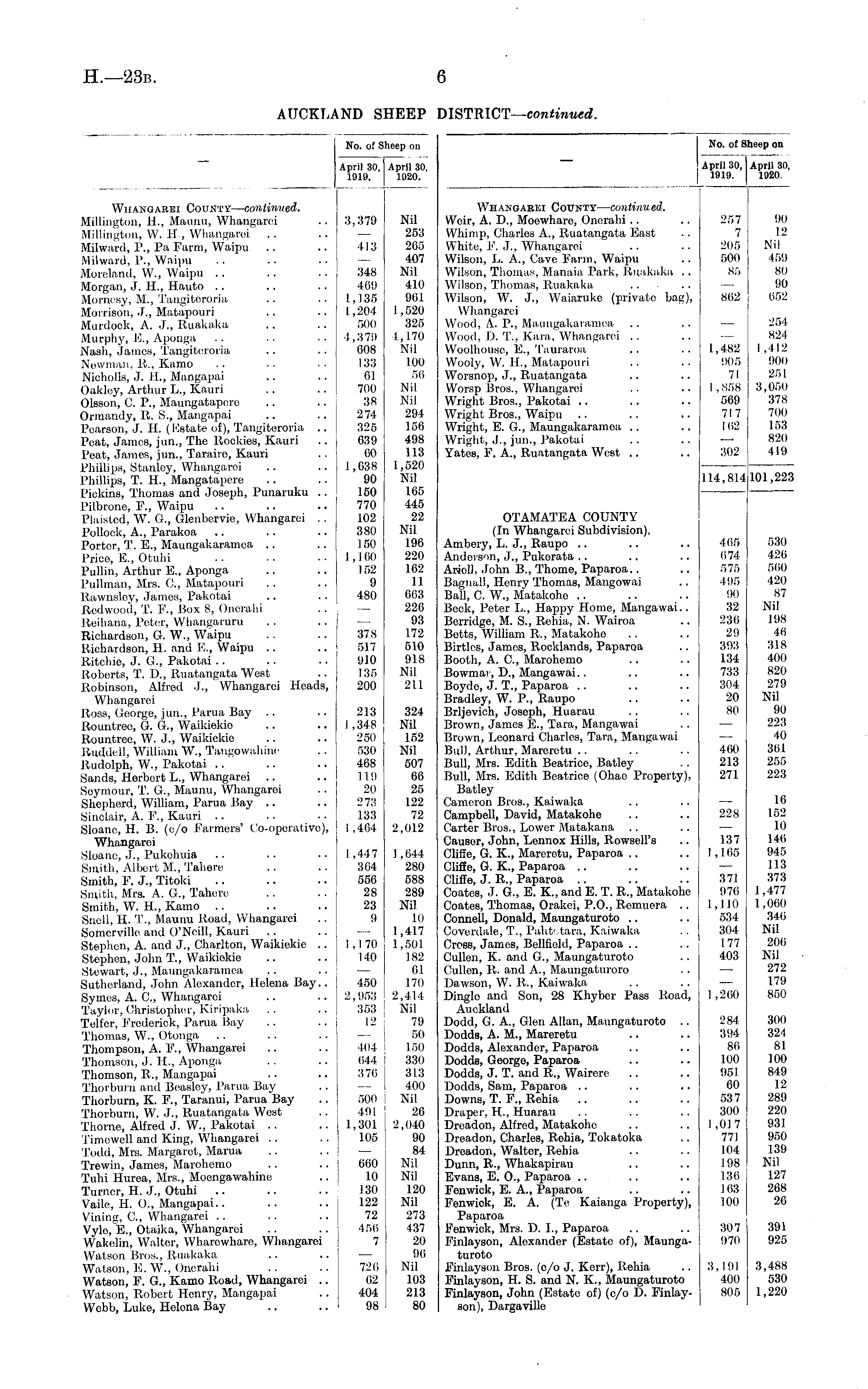 No. of Sheep on April 30, April 30, 1919. 1920. Whangaeut County— continued. Weir, A. D., Moowhare, Onorahi Whimp, Charles A., Ruatangata East White, F. J., Whangarei Wilson, L. A., Cave Farm, Waipu Wilson, Thomas, Manaia Park, Ruakaka .. Wilson, Thomas, Ruakaka Wilson, W. J., Waiaruke (privato bag), Whangarei Wood, A.. P., Maungakaramea Wood, I). T., Kara, Whangarei Woolhousc, E., Tauraroa Wooly, W. H., Matapouri Worsnop, J., Ruatangata Worsp Bros., Whangarei Wright Bros., Pakotai Wright Bros., Waipu Wright, E. G., Maungakaramea Wright, J., jun., Pakotai Yatos, F. A., Ruatangata West 257 7 205 500 85 862 1,482 905 71 1,868 569 717 102 90 12 Nil 459 80 90 052 254 824 1,112 900 251 3,050 378 700 153 820 419 302 114,814 101,223 OTAMATEA COUNTY (In Whangarei Subdivision). Ambery, L. J., Raupo Anderson, J., Pukerata Ariell, John B., Thome, Paparoa.. Bagnall, Henry Thomas, Mangowai Ball, C. W., Matakohe Beck, Peter L., Happy Home, Mangawai.. Berridgo, M. S., Rehia, N. Wairoa Bctts, William R., Matakohe Birtles, James, Rocklands, Paparoa Booth, A. C, Marohemo Bowmar, D., Mangawai.. Boydo, J. T., Paparoa Bradley, W. P., Raupo Brljevich, Joseph, Huarau Brown, James E., Tara, Mangawai Brown, Leonard Charles, Tara, Mangawai Bull, Arthur, Marcretu Bull, Mrs. Edith Beatrice, Batley Bull, Mrs. Edith Beatrice (Ohae Property), Batley Cameron Bros., Kaiwaka Campbell, David, Matakohe Carter Bros., Lower Matakana Causer, John, Lennox Hills, Rowsell's Cliffe, G. K, Mareretu, Paparoa Clifie, G. K., Paparoa Cliffe, J. R., Paparoa Coates, J. G., E. K., and E. T. R., Matakohe Coates, Thomas, Orakci, P.O., Remuera .. Connell, Donald, Maungaturoto Coverdale, T., Pahti tara, Kaiwaka Cross, James, Bellfield, Paparoa Cullen, K. and G., Maungaturoto Oullen, R. and A., Maungaturoro Dawson, W. R., Kaiwaka Dinglo and Son, 28 Khyber Pass Road, Auckland Dodd, G. A., Glen Allan, Maungaturoto .. Dodds, A. M., Mareretu Dodds, Alexander, Paparoa Dodds, George, Paparoa Dodds, J. T. and R., Wairere Dodds, Sam, Paparoa Downs, T, F., Rehia Draper. It., Huarau Dreadon, Alfred, Matakohe Dreadon, Charles, Rehia, Tokatoka Dreadon, Walter, Rehia Dunn, R., Whakapirau Evans, E. 0., Paparoa Fenwick, E. A., Paparoa Fenwick, E. A. (To Kaianga Property), Paparoa Fenwick, Mrs. D. L, Paparoa Finlayson, Alexander (Estate of), Maungaturoto Finlayson Bros, (c/o J. Kerr), Rehia Finlayson, H. S. and N. K, Maungaturoto Finlayson, John (Estate of) (c/o D. Finlayson), Dargaville ■\ 65 674 575 495 90 32 236 29 393 134 733 304 20 80 460 213 271 228 137 1,165 371 976 1,110 534 304 177 403 530 426 560 420 87 Nil 198 46 318 400 820 279 Nil 90 223 40 361 255 223 16 152 10 146 945 113 373 1,477 I ,000 340 Nil 206 Nil 272 179 850 1,260 284 394 86 100 951 60 537 300 1,017 771 104 198 130 103 100 300 324 81 100 849 12 289 220 931 950 139 Nil 127 268 26 30 7 970 391 925 3,191 400 805 3,488 530 1,220