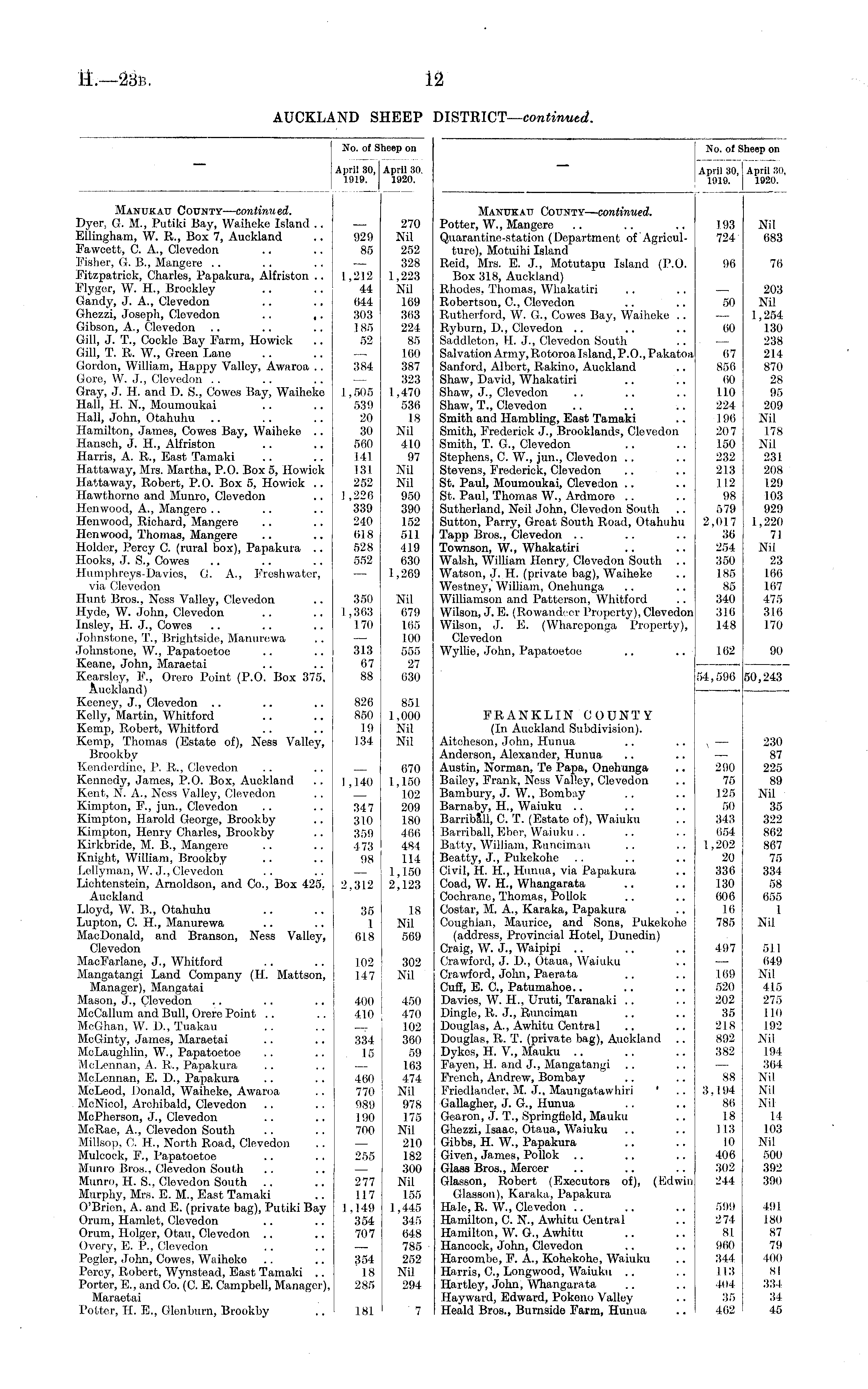No. of SI heep on April 30, 1919. April 30, 1920. Manukau County— continued. Dyer. G. M., Putiki Bay, Waiheke Island .. Ellingham, W. R., Box 7, Auckland Fawcett, C. A., Clevedon Fisher, G. B., Mangero Fitzpatrick, Charles, Papakura, Alfriston .. Flygor, W. H., Brockley Gandy, J. A., Clevedon Ghezzi, Joseph, Clevedon .. ,. Gibson, A., Clevedon Gill, J. T., Cookie Bay Farm, Howick Gill, T. R. W., Green Lane Gordon, William, Happy Valley, Awaroa .. Gore, W. J., Clevedon Gray, J. H. and D. S., Cowes Bay, Waiheke Hall, H. N., Moumoukai Hall, John, Otahuhu Hamilton, James, Cowes Bay, Waiheke .. Ilansch, J. H., Alfriston Harris, A. R., East Tamaki Hattaway, Mrs. Martha, P.O. Box 5, Howick Hattaway, Robert, P.O. Box 5, Howick .. Hawthorne and Munro, Clevedon Henwood, A., Mangero Henwood, Richard, Mangere Henwood, Thomas, Mangere Holder, Percy C. (rural box), Papakura .. Hooks, J. S., Cowes Humphreys-Davios, G. A., Freshwater, via Clevedon Hunt Bros., Ness Valley, Clevedon Hyde, W. John, Clevedon Insley, II. J., Cowes Johnstone, T., Brightsido, Manurewa Johnstone, W., Papatoetoe Keane, John, Maraetai Kearsley, F., Orero Point (P.O. Box 375, Auokland) Keeney, J., Clevedon Kelly, Martin, Whitford Kemp, Robert, Whitford Kemp, Thomas (Estate of), Ness Valley, Brookby Kenderdine, P. R., Clevedon Kennedy, James, P.O. Box, Auckland Kent, N. A., Ness Valley, Clevedon Kimpton, F., jun., Clevedon Kimpton, Harold George, Brookby Kimpton, Henry Charles, Brookby Kirkbride, M. B., Mangere Knight, William, Brookby Lellj'man, W. J., Clevedon Lichtenstein, Arnoldson, and Co., Box 425, Auckland Lloyd, W. B., Otahuhu Lupton, C. H., Manurewa MaoDonald, and Branson, Ness Valley, Clevedon MaeFarlane, J., Whitford Mangatangi Land Company (H. Mattson, Manager), Mangatai Mason, J., Clevedon McCallum and Bull, Orere Point McGhan, W. D., Tuakau McGinty, James, Maraetai McLaughlin, W., Papatoetoe McLennan, A. R., Papakura McLcnnan, E. D., Papakura McLeod, Donald, Waiheke, Awaroa McNicol, Archibald, Clevedon McPherson, J., Clevedon McRae, A., Clevedon South Millsop, C. H., North Road, Clevedon Mulcock, F., Papatoetoe Munro Bros., Clevedon South Munro, H. S., Clevedon South Murphy, Mrs. E. M., East Tamaki O'Brien, A. and E. (private bag), Putiki Bay Orum, Hamlet, Clevedon Orum, Holger, Otau, Clevedon Overy, E. P., Clevedon Poglor, John, Cowes, Waiheke Percy, Robert, Wynstead, East Tamaki .. Porter, E., and Co. (C. E. Campbell, Manager), Maraetai Potter, H. E., Glenburn, Brookby 929 85 1,212 44 644 303 185 52 384 ,1,505 539 20 30 560 141 131 252 1,220 339 240 618 528 552 350 1,363 170 313 67 88 826 850 19 134 270 Nil 252 328 1,223 Nil 169 303 224 85 160 387 323 1,470 536 18 Nil 410 97 Nil Nil 950 390 152 511 419 630 1,269 Nil 679 165 100 555 27 030 851 1,000 Nil Nil 670 1,150 102 209 180 466 484 114 1,150 2,123 1,140 347 310 359 473 98 2,312 35 1 618 18 Nil 569 102 147 302 Nil 400 410 334 15 460 770 980 190 700 255 450 470 102 360 59 163 474 Nil 978 175 Nil 210 182 300 Nil 155 1,445 345 648 785 252 Nil 294 277 117 1,149 354 707 354 18 285 181 7