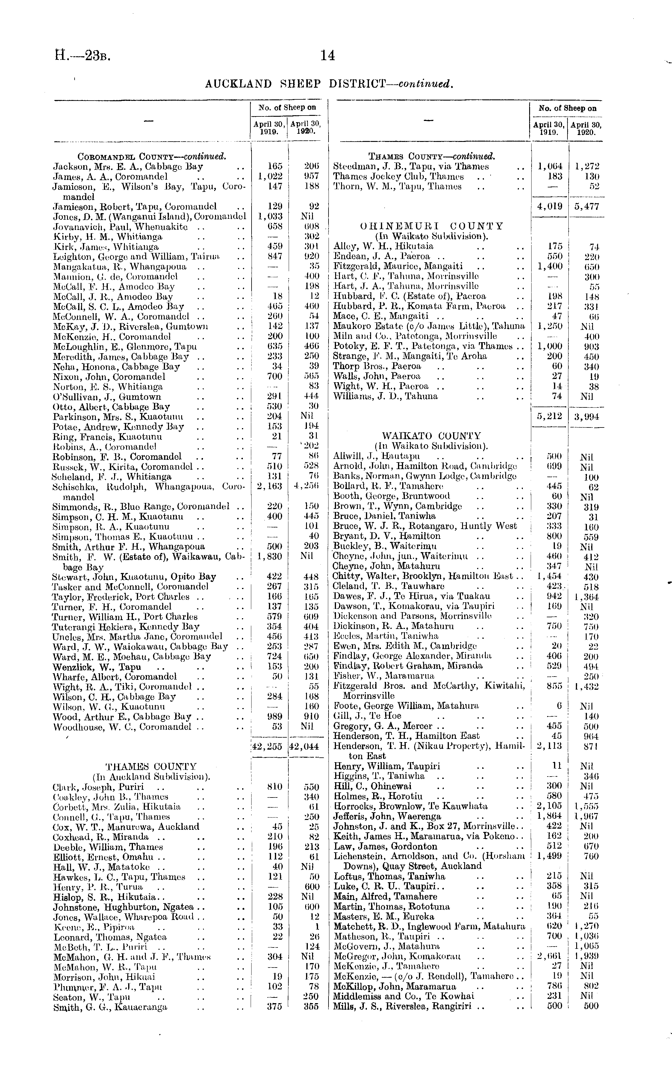 No. of Sheep on — April 30,1 1919. April 80, 1920. Coromandel County— continued. Jackson, Mrs. E. A., Cabbage Bay .. 165 James, A. A., Coromandel .. .. 1,022 Jamicson, E., Wilson's Bay, Tapu, Coro- 147 mandel Jamieson, Robert, Tapu, Coromandel .. 129 Jones, D. M. (Wanganui Island), Coromandel 1,033 Jovanavieh, Paul, Whenuakite .. .. 658 j Kirby, H. M., Whitianga .. .. — i Kirk, James, Whitianga .. .. 459 Leighton, George and William, Tairua .. 847 Mangakatua, R., Whangapoua . . .. . — Marmion, G. de, Coromandel McCall, F. 11., Amodeo Bay McCall, J. R., Amodeo Bay .. .. 18 McCall, S. 0. L„ Amodeo Bay .. .. 465 McConnell, W. A., Coromandel .. .. 260 McKay, J. D., Riverslea, Gumtown .. 142 McKenzie, H.. Coromandel .. .. 200 McLoughlin, E., Glonmore, Tapu .. 635 Meredith, James, Cabbage Bay .. .. 233 Noha, Honona, Cabbage Bay .. .. 34 Nixon, John, Coromandel .. .. 700 Norton, E. S., Whitianga O'Sullivan, J., Gumtown .. .. 291 Otto, Albert, Cabbage Bay .. . . 530 Parkinson, Mrs. S., Kuaotunu .. .. 204 Potae, Andrew, Kennedy Bay . . .. 153 Ring, Francis, Kuaotunu .. .. 21 Robins, A., Coromandel .. .. — Robinson, F. B., Coromandol .. .. 77 Russek, W., Kirita, Coromandel .. .. 510 Scheland, F. .)., Whitianga .. .. 131 Schischka, Rudolph, Whangapoua, Coro- 2,163 mandol Simmonds, R., Blue Range, Coromandel .. ! 220 Simpson, 0. H. M., Kuaotunu .. .. , 400 Simpson, R. A., Kuaotunu Simpson, Thomas E., Kuaotunu Smith, Arthur F. \i., Whangapoua .. 500 Smith, F. W. (Estate of), Waikawau, Cab- 1,830 bage Bay Stewart, John, Kuaotunu, Opito Bay .. 422 Tasker and McConnell, Coromandel .. 267 Taylor, Frederick, Port Charles 166 Turner, F. H., Coromandel .. .. 137 Turner, William IL, Port Charles .. j 579 Tuterangi Hokiera, Kennedy Bay .. I 354 Uncles, Mrs. Martha Jane, Coromandel .. ! 450 Ward, J. W., Waiokawau, Cabbage Bay .. 253 Ward, M. E.,Moehau, Cabbage Bay ... 724 Wenzlick, W., Tapu .. .. .. 153 Wharl'e, Albert, Coromandel .. .. 50 Wight, B. A., Tiki, Coromandel Wilson, C. H-, Cabbage Bay .. .. 284 Wilson, W. 0., Kuaotunu .. .. — Wood, Arthur E., Cabbage Bay .. .. 989 Woodhouse, W. C., Coromandel .. .. 53 12,255 200 957 188 92 Nil 608 302 301 920 35 100 198 12 400 54 137 100 466 250 39 505 83 444 30 Nil 194 31 202 86 528 70 4,256 150 445 101 40 203 Nil 448 315 185 135 009 404 413 287 650 200 131 55 108 100 910 Nil 42,044 THAMES COUNTY (In Auckland Subdivision). Clark, Joseph, Puriri .. .. .. 810 Ooakloy, John B., Thames Corbett, Mrs. Zulia, Hikutaia .. .. — Connell, G., Tapu, Thames .. .. ' — Cox, W. T., Manurewa, Auckland .. 15 Coxhead, R., Miranda .. .. .. 210 Deeble, William, Thames .. .. 196 Elliott, Ernest, Omahu .. .. .. | 112 Hall, W. J., Matatoke .. .. .. 40 Hawkes, L. C, Tapu, Thames .. .. 121 Henry, P. R., Tuiua Hislop, S. R., Hikutaia.. .. .. 228 Johnstone, Hughburton, Ngatea .. .. 105 Jones, Wallace, Wharepoa Road . . .. 50 Keene, K„ Pipiroa .. .. .. 33 Leonard, Thomas, Ngatea .. .. 22 Me Both, T. L., Puriri .. McMahon, G. H. and J. F., Thames .. 304 MeMahon, W. B., Tapu Morrison, John, Hikuai .. .. 19 Plummet', F.A.J., Tapu .. .. 102 Seaton, W., Tapu .. .. .. — Smith, G. G., Kauaeranga .. .. 375 550 340 61 250 25 82 213 01 Nil 50 600 Nil 000 12 1 26 124 Nil 170 175 78 250 355