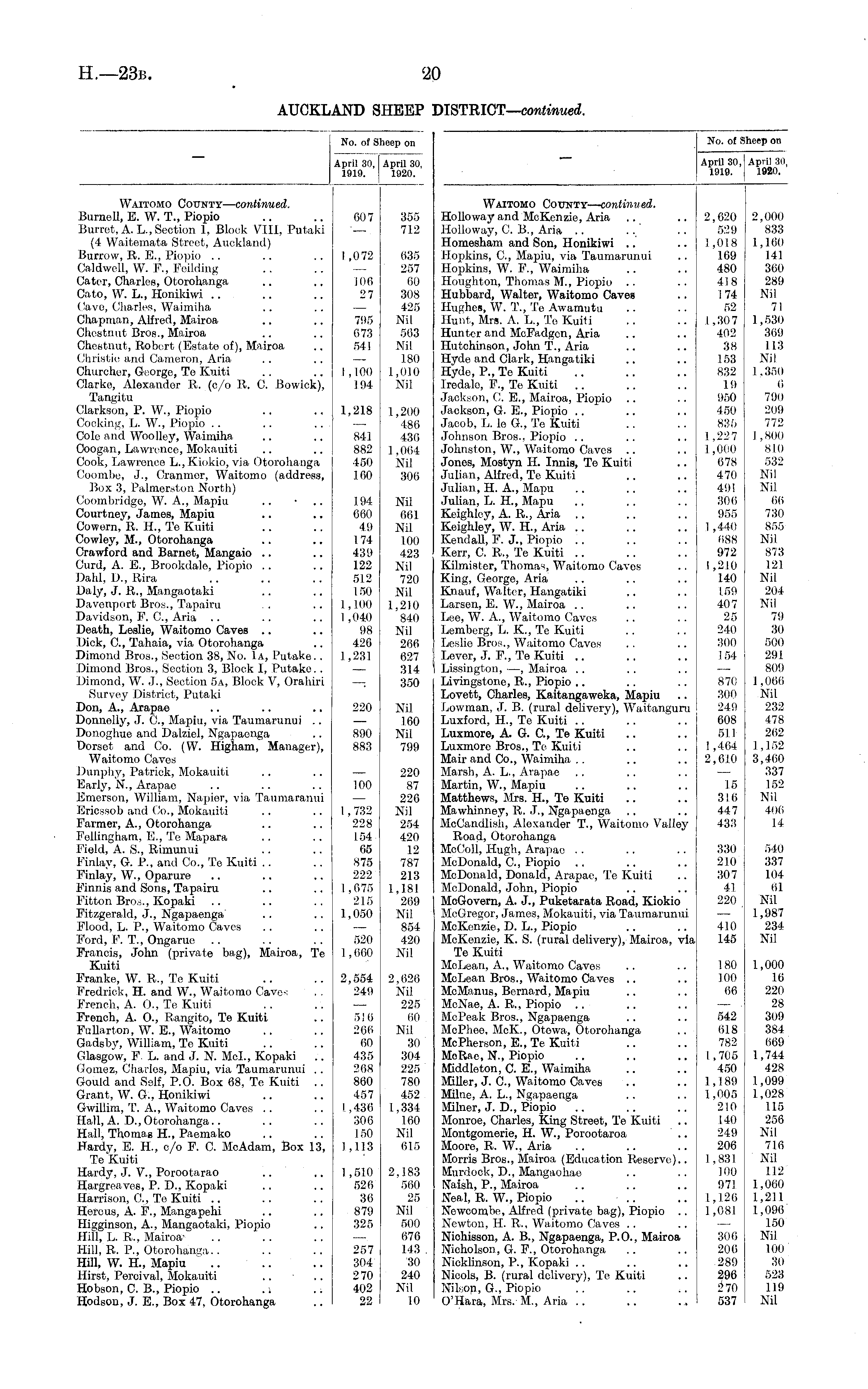 No. of Sheep on April 30, April 30, 1919. 1920. Waitomo County— continued. Holloway and McKenzie, Aria Holloway, C. B., Aria .. Homesham and Son, Honikiwi Hopkins, O, Mapiu, via Taumarunui Hopkins, W. F., Waimiha Houghton, Thomas M., Piopio Hubbard, Walter, Waitomo Caves Hughes, W. T., Te Awamutu Hunt, Mrs. A. L., To Kuiti Hunter and McFadgen, Aria Hutchinson, John T., Aria Hyde and Clark, Hangatiki Hyde, P., Te Kuiti lredalo, F., Te Kuiti Jackson, C, E., Mairoa, Piopio Jackson, G. E., Piopio Jacob, L. le G., Te Kuiti Johnson Bros., Piopio Johnston, W., Waitomo Caves Jones, Mostyn II. Innis, Te Kuiti Julian, Alfred, Te Kuiti Julian, H. A., Mapii Julian, L. H., Mapu Keighley, A. R., Aria Keighley, W. H., Aria Kendall, F. J., Piopio .. Kerr, C. R., Te Kuiti Kilmister, Thomas, Waitomo Caves King, George, Aria Knauf, Walter, Hangatiki Larson, E. W., Mairoa Lee, W. A., Waitomo Caves Lemberg, L. K., Te Kuiti Leslie Bros., Waitomo Caves Lever, J. F., Te Kuiti Lissington, —, Mairoa Livingstone, R., Piopio Lovott, Charles, Kaitangaweka, Mapiu Lowman, J. B. (rural delivery), Waitanguru Luxford, II., Te Kuiti Luxmore, A. G. C, Te Kuiti Luxmore Bros., Te Kuiti Mair and Co., Waimiha Marsh, A. L., Arapae Martin, W., Mapiu Matthews, Mrs. H., Te Kuiti Mawhinney, R. J., Ngapaenga .. McCandlish, Aloxander T., Waitomo Valley Road, Otorohanga McColl, Hugh, Arapae McDonald, C., Piopio McDonald, Donald, Arapae, Te Kuiti McDonald, John, Piopio McGovern, A. J., Puketarata Road, Kiokio McGregor, James, Mokauiti, via Taumarunui McKenzie, D. L., Piopio McKenzie, K. S. (rural delivery), Mairoa, via Te Kuiti McLean, A., Waitomo Caves McLean Bros., Waitomo Caves McManus, Bernard, Mapiu McNae, A. R., Piopio .. McPeak Bros., Ngapaenga McPhee, McK., Otewa, Otorohanga McPherson, E., Te Kuiti MoRae, N., Piopio Middleton, C. E., Waimiha Miller, J. C., Waitomo Caves Milne, A. L., Ngapaenga Milner, J. D., Piopio Monroe, Charles, King Street, Te Kuiti Montgomerie, H. W., Porootaroa Moore, R. W., Aria Morris Bros., Mairoa (Education Reserve).. Murdook, D., Mangaohae Naish, P., Mairoa Neal, R. W., Piopio Newcombe, Alfred (private bag), Piopio .. Newton, II. R., Waitomo Caves Niohisson, A. B., Ngapaenga, P.O., Mairoa Nicholson, G. F., Otorohanga Nicklinson, P., Kopaki Niools, B. (rural delivery), Te Kuiti Nilson, G., Piopio O'Hara, Mrs. M., Aria .. 2,020 529 1,018 169 480 418 174 52 1,307 402 38 163 832 19 950 450 835 1,227 1,000 678 470 491 306 955 1,440 688 972 1,210 140 159 407 25 240 300 154 871! 300 249 608 511 1,464 2,610 2,000 833 1,160 141 360 289 Nil 71 1,530 309 113 Nil 1,350 6 790 209 772 1 ,800 810 532 Nil Nil 06 730 855 Nil 873 121 Nil 204 Nil 79 30 500 291 809 .1,060 Nil 232 478 262 1,152 3,400 337 152 Nil 406 14 15 316 447 433 330 210 307 41 220 540 337 104 01 Nil 1,987 234 Nil 410 1.45 180 100 66 542 618 782 1,705 450 1,189 1,005 210 140 249 206 1,831 100 971 1,126 1,081 1,000 16 220 28 309 384 669 1,744 428 1,099 1,028 115 256 Nil 716 Nil 112 1,000 1,211 1,096 150 Nil 100 30 523 119 Nil 300 200 289 296 270 537