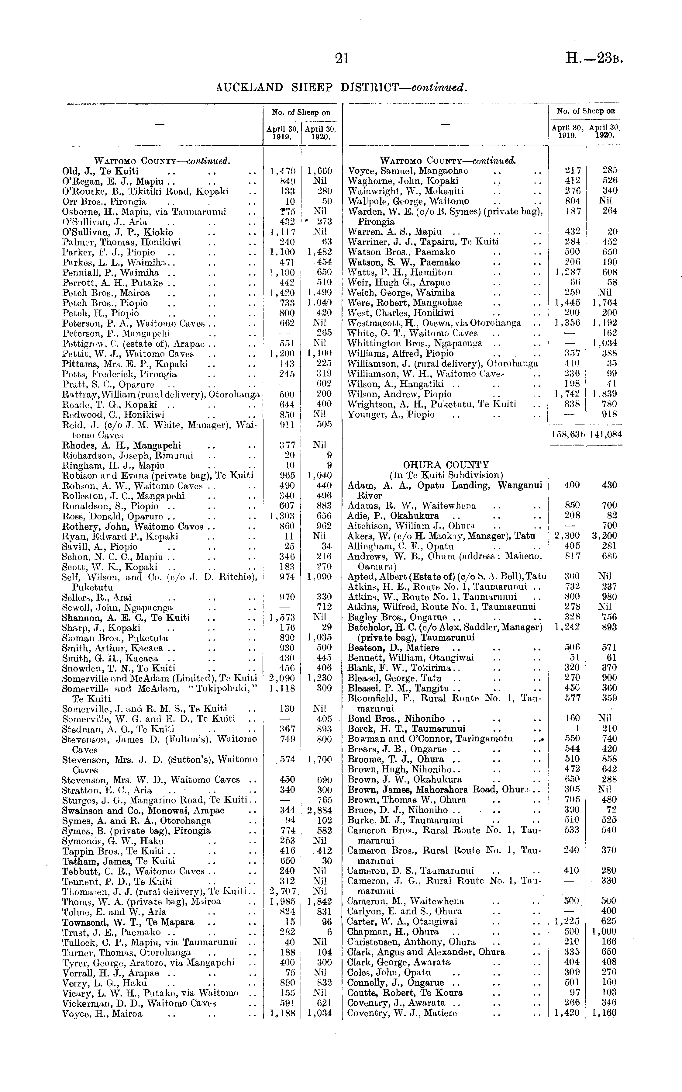 No. of Sheep on April 30, 1910. April 30, 1920. Waitomo County— continued. Old, J., Te Kuiti 0'Regan, E. J., Mapiu O'Rourke, B., Tikitiki Road, Kopaki Orr Bros., Pirongia, Osborne, H., Mapiu, via Taumarunui O'Sullivan, J., Aria O'SuUivan, J. P., Kiokio Palmer, Thomas, Honikiwi Parker, F. J., Piopio Parkes, L. L., Waimiha Penniall, P., Waimiha Perrott, A. H., Putake Fetch Bros., Mairoa Fetch Bros., Piopio Fetch, H., Piopio Poterson, P. A., Waitomo Caves Peterson, P., Mangapehi Pcttigrew, (!. (estate of), Arapae Pettit, W. J., Waitomo Caves Pittams, Mrs. E. P., Kopaki Potts, PYederick, Pirongia Pratt, S. 0., Oparure Rattray,William (rural delivery), Otorohanga Beade, T. G, Kopaki Redwood, C, Honikiwi Reid, J. (o/o J. M. White, Manager), Waitomo Caves Rhodes, A. H, Mangapehi Richardson, Joseph, Rimunui Ringham, H. J., Mapiu Robison and Evans (private bag), Te Kuiti Robson, A. W., Waitomo Caves Rolleston, J. C, Mangapehi Ronaldson, S., Piopio Ross, Donald, Oparure Rothery, John, Waitomo Caves Ryan, Edward P., Kopaki Savill, A., Piopio Schon, N. 0. C, Mapiu Scott, W. K, Kopaki Self, Wilson, and Co. (e/o J. D. Ritchie), Puketutu Sellers, R., Arai Sewell, John, Ngapaenga Shannon, A. E. C, Te Kuiti Sharp, J., Kopaki Sloman Bros., Puketutu Smith, Arthur, Kaoaea Smith, G. H., Kaeaea Snowden, T. N-, Te Kuiti Somerville and MeAdam (Limited), Te Kuiti Somerville and MeAdam, " Tokipohuki," Te Kuiti Somerville, J. and R. M. S., Te Kuiti Somerville, W. G. and E. D., Te Kuiti .. Stedman, A. 0., Te Kuiti Stevenson, James D. (Fulton's), Waitomo Caves Stevenson, Mrs. J. D. (Sutton's), Waitomo Caves Stovenson, Mrs. W. D., Waitomo Caves .. Stratton, E. ('., Aria Sturges, J. G., Mangarino Road, To Kuiti. . Swainson and Co., Monowai, Arapae Symes, A. and R. A., Otorohanga Symes, B. (private bag), Pirongia Symonds, G. W., Haku Tappin Bros., Te Kuiti Tatham, James, Te Kuiti Tebbutt, C. R., Waitomo Caves Tennent, P. D., Te Kuiti Thomasen, J. J. (rural delivery), Te Kuiti.. Thorns, W. A. (private bag), Mairoa Tolme, E. and W., Aria Townsend, W. T, Te Mapara Trust, J. E., Paemako Tullock, C. P., Mapiu, via Taumarunui .. Turner, Thomas, Otorohanga Tyrer, George, Aratoro, via Mangapehi Verrall, H. J., Arapae Verry, L. G., Haku Vicary, L. W. H., Putake, via Waitomo .. Vickerntan, D. D., Waitomo Caves Voyce, H., Mairoa 1,470 849 133 10 ?75 432 1,117 240 1,1.00 47! 1,100 442 1,420 733 800 662 551 1,200 143 245 500 644 850 911 3 77 20 10 965 490 340 607 1,303 860 11 25 340 183 974 970 1,660 Nil 280 50 Nil • 273 Nil 63 1,482 454 650 510 1,490 1,040 420 Nil 265 Nil 1,100 225 319 002 200 400 Nil 505 Nil 9 9 1,040 440 496 883 656 962 Nil 34 210 270 1,090 330 712 Nil 29 1,035 500 445 406 1,230 300 1,573 170 890 930 430 456 2,090 1,118 130 307 749 Nil 405 893 800 574 1,700 450 340 090 300 765 2,884 102 582 Nil 412 30 Nil Nil Nil 1,842 831 96 6 Nil 104 300 Nil 832 Nil 621 1,034 344 94 774 253 410 050 240 312 2,707 1,985 824 15 282 40 188 400 75 890 155 59.1 1,188