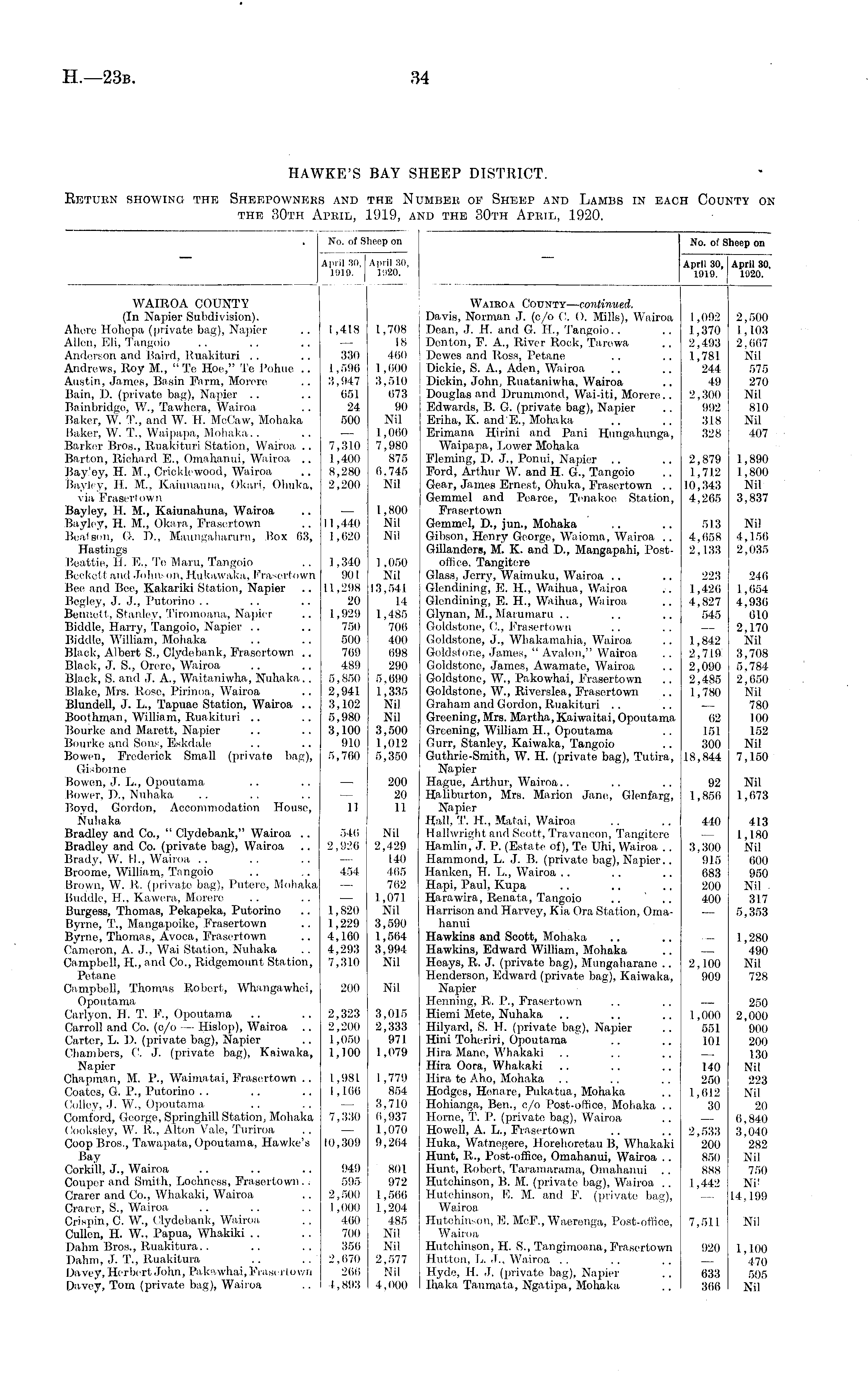 HAWKE'S BAY SHEEP DISTRICT. Return showing the Sheepowners and the Number of Sheep and Lambs in each County on the 30th April, 1919, and the 30th April, 1920.