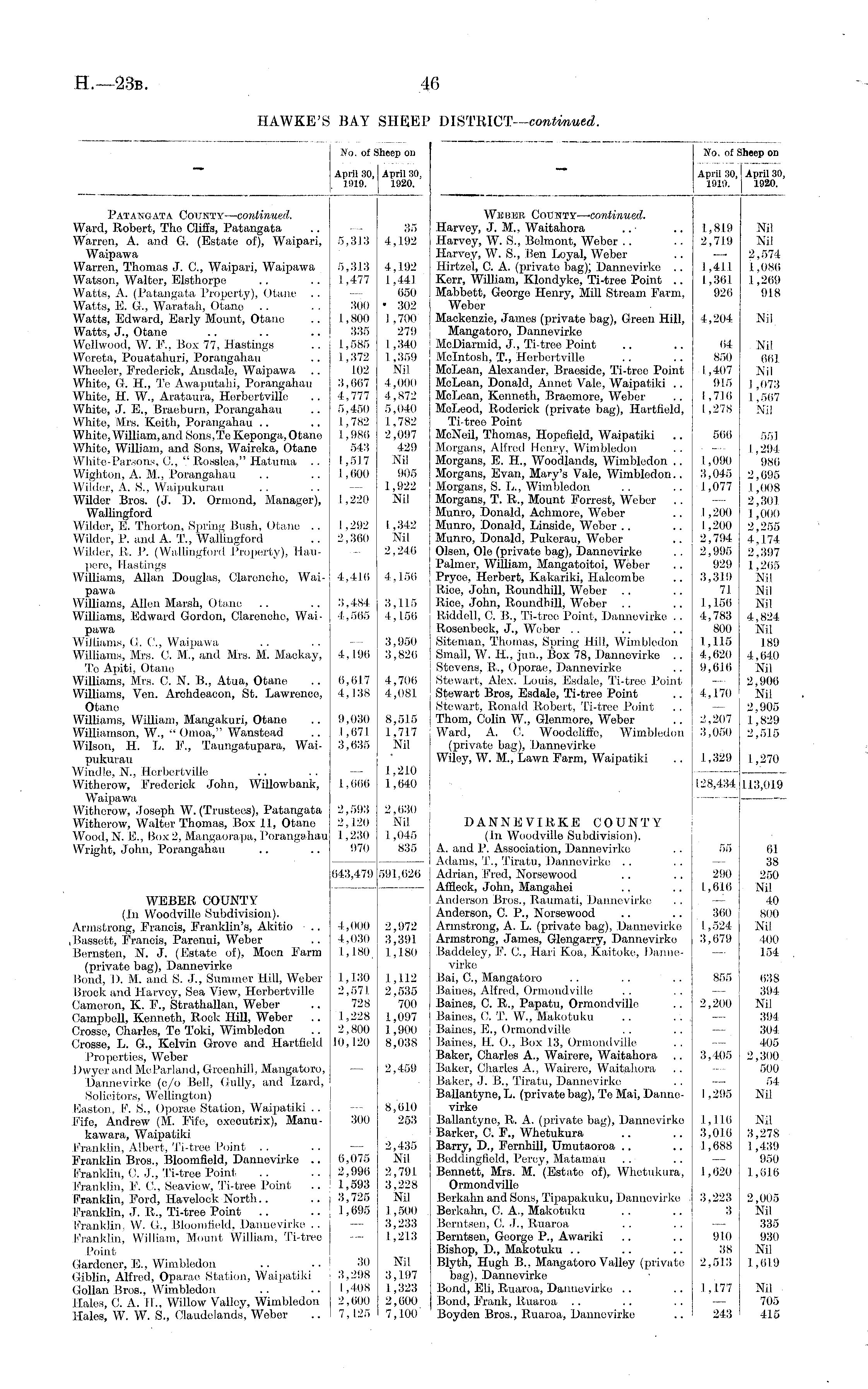 Hfo. of S Iheep on April 30, 1920. April 30, 1919. We bur County— -continued. Harvey, J. M., Waitahora Harvey, W. S., Belmont, Weber Harvey, W. S., Ben Loyal, Weber Hirtzel, C. A. (private bag); Dannevirke .. Kerr, William, Klondyke, Ti-tree Point .. Mabbett, George Henry, Mill Stream Farm, Weber Mackenzie, James (private bag), Green Hill, Mangatoro, Dannevirke McDiarmid, j., Ti-tree Point Mcintosh, T-, Herbertville McLean, Alexander, Braoside, Ti-tree Point McLean, Donald, Annet Vale, Waipatiki .. McLean, Kenneth, Braomore, Weber McLeod, Roderick (private bag), Hartfield, Ti-tree Point McNeil, Thomas, Hopofield, Waipatiki Morgans, Alfred Henry, Wimbledon Morgans, F. H., Woodlands, Wimbledon .. Morgans, Evan, Mary's Vale, Wimbledon.. Morgans, S. L., Wimbledon Morgans, T. R., Mount Forrest, Weber Munro, Donald, Achmore, Weber Munro, Donald, Linsidc, Weber Munro, Donald, Pukerau, Wober Olson, Ole (private bag), Dannevirke Palmer, William, Mangatoitoi, Weber Pryoe, Herbert, Kakariki, Halcombe Rice, John, Roundhill, Weber Rice, John, Roundhill, Wober Riddell, 0. B,, Ti-tree Point, Dannevirke .. Rosenbeok, J., Weber Siteman, Thomas, Spring Hill, Wimbledon Small, W. H., jun., Box 78, Dannevirke .. Stevens, 11., Oporae, Dannevirke Stewart, Alex. Louis, Esdale, Ti-tree Point Stewart Bros, Esdale, Ti-tree Point .. | Stewart, Ronald Robert, Ti-tree Point Thom, Colin W., Glenmore, Wober Ward, A. C. Woodcliffe, Wimbledon (private bag), Dannevirke Wiley, W. M., Lawn Farm, Waipatiki 1,819 2,719 1,411 1,36.1 926 4,204 04 850 1,407 915 1,71 (i 1 ,278 500 1,090 3,045 1,077 Nil Nil 2,574 1,086 1,269 918 Nil Nil 661 Nil I ,073 1,567 Nil 551 I , 294 980 2,695 J. ,008 2,30) I ,000 2,255 4,174 2,397 1,205 Nil Nil Nil 4,824 Nil 189 4,040 Nil 2,900 Nil 2,905 1,829 2,515 1,200 1,200 2,794 2,995 929 3,319 71 1,156 4,783 800 1,115 4,620 9,6.16 ! 4,170 2,207 3,050 1,329 I ,270 128,434 113,01.9 DANNEVIRKE COUNTY (In Woodville Subdivision). A. and P. Association, Dannevirke Adams, T-, Tiratu, Dannevirke Adrian, Fred, Norsowood Affleck, John, Mangahei Anderson Bros., Raumati, Dannevirke Anderson, C. P., Norsowood Armstrong, A. L. (private bag), Dannevirke Armstrong, James, Glengarry, Dannevirke Baddeley, F. 0., Hari Koa, Kaitoke, Dannevirke Bai, G, Mangatoro Baines, Alfred, Ormondville Baines, C. R., Papatu, Ormondville Baines, O. T. W., Maketukii Baines, E., Ormondville Baines, H. O., Box 13, Ormondville Baker, Charles A., Wairoro, Waitahora Baker, Charles A., Wairere, Waitahora Baker, J. B., Tiratu, Dannevirke Ballantyne, L. (private bag), To Mai, Dannevirke Ballantync, li. A. (private bag), Dannevirke Barker, C. F., Whetukura Barry, D., Fernhill, Umutaoroa Beddingfield, Percy, Matamau Bennett, Mrs. M. (Estate of), Whetukura, Ormondville Berkahn and Sons, Tipapakuku, Dannevirke Berkahn, C. A., Makotuku Berntsen, C. J., Ruaroa Bemtsen, George P., Awariki Bishop, D., Makotuku Blyth, Hugh B., Mangatoro Valley (private bag), Dannevirke Bond, Eli, Ruaroa, Dannevirke Bond, Frank, Ruaroa Boyden Bros., Ruaroa, Dannevirke r)i> 290 1,616 360 1,524 3,679 855 2,200 3,405 01 38 250 Nil 40 800 Nil 400 154 638 394 Nil 394 304 405 2,300 500 54 Nil 1,295 1,110 3,0.1.0 1,688 Nil 3,278 1 ,439 950 1 ,616 1,620 3,223 3 910 38 2,513 2,005 Nil 335 930 Nil 1,619 1,177 Nil 705 415 243