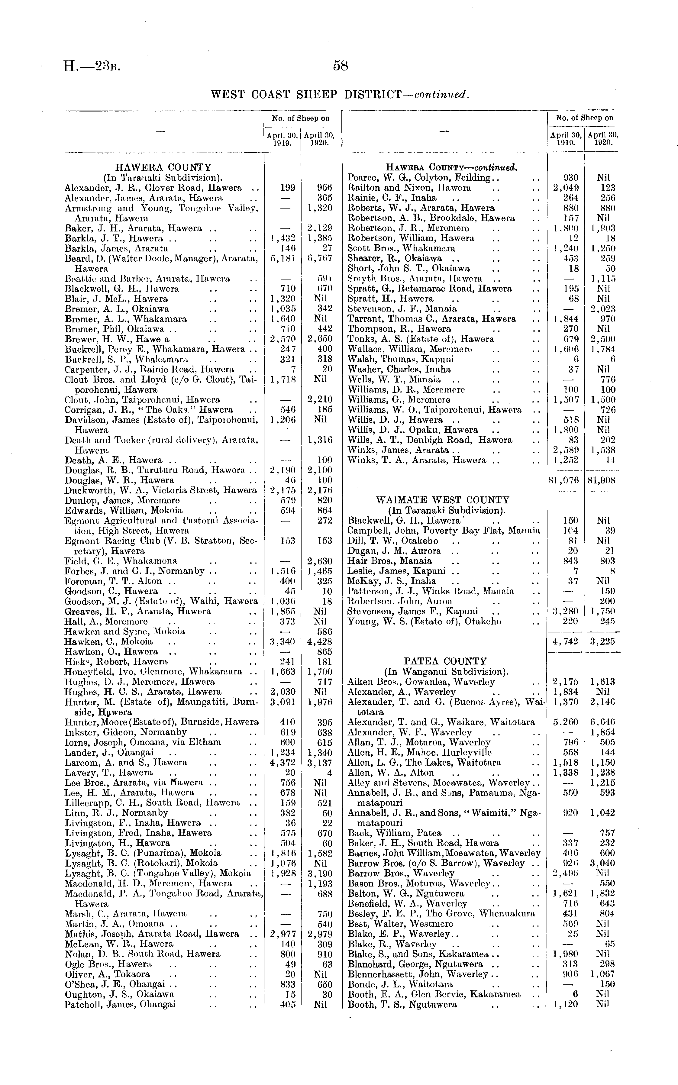 No. of Sheep on April 30, April 30. 1919. 1920. Hawera County— continued. Peareo, W. G., Colyton, Feilding.. Railton and Nixon, Hawera Rainie, C. P\, Inaha Roberts, W. J., Ararata, Hawera Robertson, A. B., Brookdale, Hawera Robertson, J. R., Meromero Robertson, William, Hawera Scott Bros., Whakamara Shearer, R., Okaiawa Short, John S. T., Okaiawa Smyth Bros., Ararata, Hawera Spratt, G., Retamarae Road, Hawera Spratt, H., Hawera Stevenson, J. F., Manaia Tarrant, Thomas G, Ararata, Hawera Thompson, R., Hawera Tonks, A. S. (Estate of), Hawera Wallace, William, Meremere Walsh, Thomas, Kapuni Washer, Charles, Inaha Wells, W. T., Manaia Williams, D. R., Meremere Williams, G., Meremere Williams, W. ()., Taiporohenui, Hawera Willis, D. J., Hawera Willis, D. J., Opaku, Hawera Wills, A. T., Denbigh Road, Hawera Winks, James, Ararata Winks, T. A., Ararata, Hawera 930 2,049 264 880 157 1., 800 12 1,240 453 1.8 I 95 08 1,844 270 679 1,006 0 37 Nil 123 256 880 Nil 1,903 18 1,250 259 50 1,115 Nil Nil 2,023 970 Nil 2,500 1,784 0 Nil 770 100 1,500 720 Nil Nil 202 1,538 14 100 1,507 518 1,800 83 2,589 1,252 81,076 81,908 WAIMATE WEST COUNTY (In Taranaki Subdivision). Biackwell, G. PL, Hawera' Campbell, John, Poverty Bay Flat, Manaia Dill, T. W., Otakoho .. Dugan, J. M., Aurora Hair Bros., Manaia Leslie, James, Kapuni McKay, J. S., Inaha Patterson, .1. J., Winks Road, Manaia Robertson. John, Auroa Stevenson, James F., Kapuni Young, W. S. (Estate of), Otakeho 150 104 81 20 843 7 37 Nil 39 Nil 21 803 8 Nil 159 200 1,750 245 3,280 220 4,742 3,225 PATEA COUNTY (In Wanganui Subdivision). Aiken Bros., Gowanlea, Waverley Alexander, A., Waverlcy Alexander, T. and G. (Buenos Ayros), Waitotara Alexander, T. and G., Waikare, Waitotara Alexander, W. F„ Waverley Allan, T. J., Moturoa, Waverley Allen, II. E., Mahoe, Hurleyville Allen, L. G., The Lakes, Waitotara Allen, W. A., Alton Alley and Stevens, Mocawatca, Waverley .. Annabel!, J. R., and S;ms, Pamauma, Ngamatapouri Annabell, J. R., and Sons, " Waimiti," Ngamatapouri Back, William, Patca Baker, J. H, South Road, Hawora Barnes, John William,Mocawatca, Waverley Barrow Bros, (o/o S. Barrow), Waverley .. Barrow Bros., Wavorley Bason Bros., Moturoa, Waverley.. Belton, W. G., Ngutuwera Benofield, W. A., Waverley Besley, I'. E. P., The Grove, Whcnuakura Best, Walter, Westmere Blake, E. P., Waverley.. Blake, R., Waverley Blake, S., and Sons, Kakaramea Blanchard, George, Ngutuwora Blennerhassett, John, Waverley Hondo, J. P., Waitotara Booth, E. A., Glen Borvie, Kakaramea, .. Booth, T. S., Ngutuwora 2,175 1,834 1,370 5,260 790 558 1,518 1,338 550 920 1,013 Nil 2,146 6,646 1,854 505 144 1,150 1,238 1,215 593 1,042 757 232 600 3,040 Nil 550 1,832 643 804 Nil Nil 65 Nil 298 1,007 150 Nil Nil 337 400 920 2,495 1,621 716 431 569 25 1,980 313 906 6 1,120