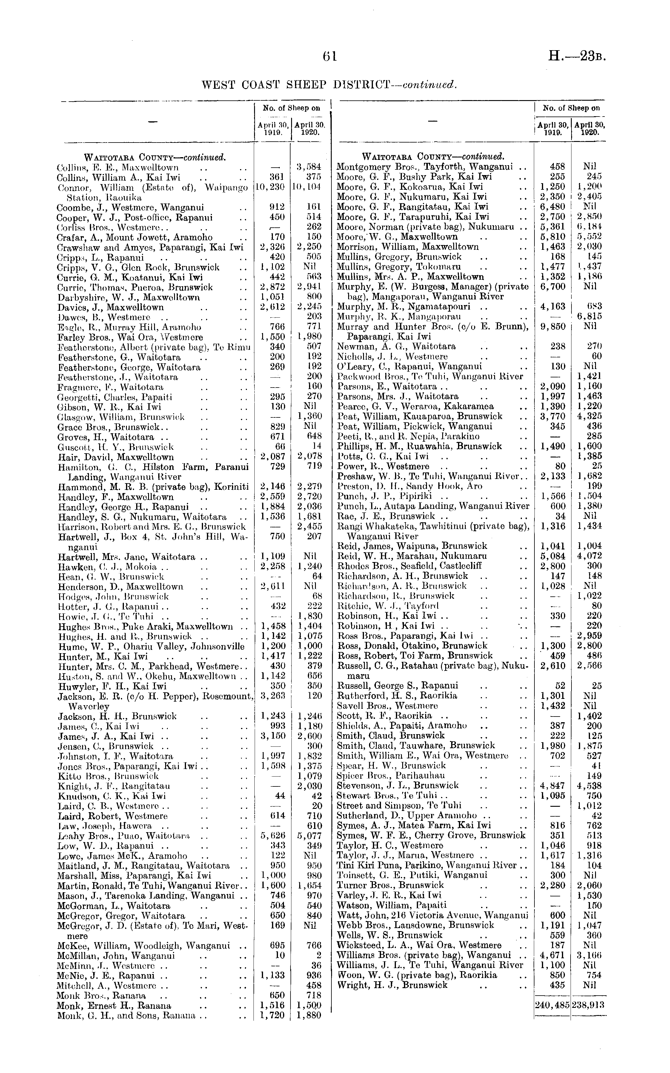 i No. of Sheep on April 30, April 80, 1919. 1920. Waitotaba County— continued. Montgomery Bros., Tayforth, Wanganui .. Moore, G. F., Bushy Park, Kai Iwi Moore, G. F., Kokoarua, Kai Iwi Moore, G. P., Nukumaru, Kai Iwi Moore, G P'., Rangitatau, Kai Iwi Moore, G. F., Tarapuruhi, Kai Iwi Moore, Norman (private bag), Nukumaru .. Moore, W. G., Maxwelltown Morrison, William, Maxwelltown Mullins, Gregory, Brunswick Mullins, Gregory, Tokomaru Mullins, Mrs. A. P., Maxwelltown Murphy, E. (W. Burgess, Manager) (private bag), Mangaporau, Wanganui River Murphy, M. R., Ngarnatapouri Murphy, R. K., Mangaporau Murray and Hunter Bros, (c/o E. Brunn), Paparangi, Kai Iwi Newman, A. G, Waitotara Nicholls, J. P., Westmere O'Leary, 0., Rapanui, Wanganui Packwood Bros., Te Tuhi, Wanganui River Parsons, E., Waitotara Parsons, Mrs. J., Waitotara Pearce, O. V., Woraroa, Kakaramea Peat, William, Kauaparoa, Brunswick Peat, William, Pickwick, Wanganui Peeti, It., and B. Nepia, Parakino Phillips, H. M., Ruawahia, Brunswick Potts, G. G, Kai [wi Power, R., Westmere Preshaw, W. B., Te Tuhi, Wanganui River. . Preston, I). IP, Sandy Hook, Aro Punch, ,1. P., Pipiriki Punch, L., Autapa Landing, Wanganui River Rae, J. E., Brunswick Rangi Whakateka, Tawhitinui (private bag), Wanganui River Reid, James, Waipuna, Brunswick Reid, W. H., Marahau, Nukumaru Rhodes Bros., Seafield, Castleoliff Richardson, A. H., Brunswick Richardson, A. R., Brunswick Richardson, R., Brunswick Ritobie, W. •!., Tayford Robinson, H., Kai Iwi Robinson, IP, Kai Iwi Boss Bros.. Paparangi, Kai lui .. Ross, Donald, Otakino, Brunswick Ross, Robert, Toi P'arm, Brunswick Russell, C. G, Ratahau (private bag), Nukumaru Russell, George S., Rapanui Rutherford, it. S., Raorikia Savell Bros., Westmere Scott, R. P\, Raorikia Shields. A.. Papaiti, Aramoho Smith, Claud, Brunswick Smith, Claud, Tauwhare, Brunswick Smith, William E., Wai Ora, Westmere .. Spear, It. W., Brunswick Spicer Bros., Parihauhau Stevenson, J. L., Brunswick Stewart Bros., Te Tuhi Street and Simpson, Te Tuhi Sutherland, D., Upper Aramoho .. Symes, A. J., Matea Farm, Kai Iwi Symes, W. F. E., Cherry Grove, Brunswick Taylor, H. G, Westmere Taylor, ,1. J., Mania, Westmere Tini Kiri Puna, Parikino, Wanganui River .. Toinsett, G. E., Putiki, Wanganui Turner Bros., Brunswick Varley, .1. E. R., Kai fwi Watson, William, Papaiti Watt, John, 216 Victoria Avenue, Wanganui Webb Bros., Lansdowne, Brunswick Wells, W. S., Brunswick Wicksteod, L. A., Wai Ora, Westmere Williams Bros, (private bag), Wanganui .. Williams, J. L., To Tuhi, Wanganui River Woon, W. G. (private bag), Raorikia Wright, II. J., Brunswick 458 255 1,250 2,350 6,480 2,750 5,361 5,810 1,463 168 1,477 1,352 6,700 4,163 9,850 238 130 2,090 1,997 1,390 3,770 345 1,490 80 2,133 1,500 600 34 1,316 1,041 5,084 2,800 147 1,028 Nil 245 I ,200 2,405 Nil 2,850 6.184 5,552 2,030 145 1,437 1,186 Nil 683 6,815 Nil 270 60 Nil 1,421 1,160 I ,403 1,220 1,325 436 285 1,600 1,385 25 1,082 199 1,504 1,380 Nil 1,434 1,004 4,072 300 148 Nil 1,022 80 220 220 2,959 2,800 480 2,506 330 1,300 459 2,610 52 1,301 1,432 387 222 1,980 702 4,847 1,095 816 351 1,046 1,017 184 300 2,280 25 Nil Nil 1,402 200 125 1.875 527 41 149 4,538 750 1,012 42 762 518 918 1,316 104 Nil 2,060 1,530 150 Nil 1,017 360 Nil 8,166 Nil 754 Nil 600 1,191 559 187 4,671 1,100 850 435 240,4851 1238,913