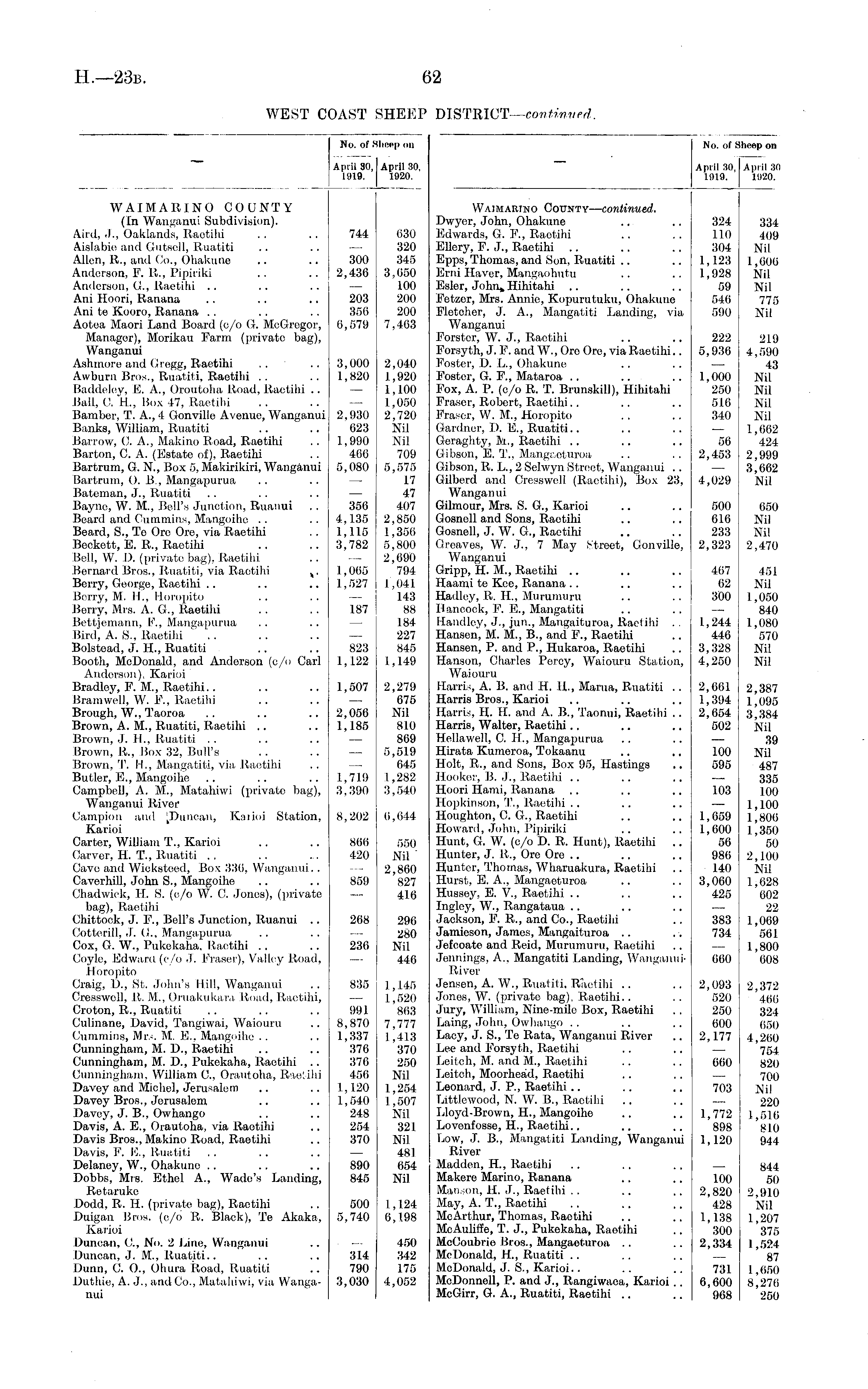 No. of S llieep on April 80, 1919. April 30, 1920. WAIMARINO COUNTY (In Wanganui Subdivision). Aird, J., Oaklands, Raotihi Aislabie and Outsell, Ruatiti Allen, R., and Co., Ohakune Anderson, F. R., Pipiriki Anderson, G, Raetihi Ani Hoori, Ranana Ani te Kooro, Ranana Aotea Maori Land Board (c/o G. McGregor, Manager), Morikau Farm (private bag), Wanganui Ashmore and Gregg, Raetihi Avvburn Bros., Ruatiti, Raetihi Boddeley, E. A., Qroutoha Road, Raetihi .. Ball, C. H., Box 47, Raetihi Bamber, T. A., 4 Gonville Avenue, Wanganui Banks, William, Ruatiti Barrow, 0. A., Makino Road, Raetihi Barton, G A. (Estate of), Raetihi Bartrum, G. N., Box 5, Makirikiri, Wanganui Bartrum, 0. B., Mangapurua Bateman, J., Ruatiti Bayne, W. M., Bell's Junction, Ruanui Beard and Cummins, Mangoihe Beard, S., To Ore Ore, via Raetihi Beckett, E. R., Raotihi Bell, W. D. (private bag), Raetihi Bernard Bros., Ruatiti, via Raetihi „. Berry, George, Raetihi Berry, M. IP, lloropito Berry, Mrs. A. G., Raetihi Bettjemann, P., Mangapurua Bird', A. S., Raetihi Bolstead, J. II., Ruatiti Booth, McDonald, and Anderson (c/o Carl Anderson), Karioi Bradley, F. M., Raetihi.. Bramwell, W. P\, Raetihi Brough, W., Taoroa Brown, A. M., Ruatiti, Raetihi Brown, J. IP, Ruatiti .. Brown, R., Box 32, Bull's Brown, T. H., Mangatiti, via Raetihi Butler, E., Mangoihe Campbell, A. M., Matahiwi (private bag), Wanganui River Campion and -Duncan, Karioi Station, Karioi Carter, William T., Karioi Carver, H. T., Ruatiti .. Cave and Wicksteed, Box 330, Wanganui.. Caverhill, John S., Mangoiho Chadwick, II. S. (c/o W. C. Jones), (private bag), Raetihi Chittock, J. F., Bell's Junction, Ruanui .. Cotterill, J. G., Mangapurua Cox, G W., Pukekaha, Raetihi Coyle, Edwarit (c/o J. Fraser), Valley Road, Horopito Craig, D., St. John's Hill, Wanganui Cresswell, R. M.., Oruakukara Road, Raetihi, Croton, R., Ruatiti Culinane, David, Tangiwai, Waiouru Cummins, Mrs. M. E., Mangoihe Cunningham, M. D., Raetihi Cunningham, M. D., Pukekaha, Raotihi .. Cunningham, William C, Orautoha, Raetihi Davey and Michel, Jerusalem Davey Bros., Jerusalem Davey, J. B., Owhango Davis, A. E., Orautoha, via Raetihi Davis Bros., Makino Road, Raetihi Davis, F. E., Ruatiti Delaney, W., Ohakune Dobbs, Mrs. Ethel A., Wade's Landing, Retaruke Dodd, R. 11. (private bag), Raetihi Duigan Bros, (c/o R. Black), Te Akaka, Karioi Duncan, C, No. 2 Line, Wanganui Duncan, J. M., Ruatiti.. Dunn, G ()., Ohura Road, Ruatiti Duthie, A. J., and Co., Matahiwi, via Wanganui 744 300 2,436 203 356 6,579 3,000 1,820 2,930 623 1,990 406 5,080 356 4,135 1,115 3,782 1,065 1,527 187 823 1,122 1,507 2,056 1,185 030 320 345 3,050 100 200 200 7,403 2,040 1,920 1,100 1,050 2,720 Nil Nil 709 5,575 17 47 407 2,850 1,350 5,800 2,690 794 1,041 143 88 184 227 845 1,149 2,279 675 Nil 810 809 5,519 645 1,282 3,540 1,719 3,390 8,202 6,644 800 420 550 Nil ' 2,860 827 416 859 268 296 280 Nil 446 236 835 1,145 1,520 863 7,777 1,413 370 250 Nil 1,254 1,507 Nil 321 Nil 481 654 Nil 991 8,870 1,337 376 370 456 1,120 1,540 248 254 370 890 845 500 5,740 1,124 6,198 314 790 3,030 450 342 175 4,052