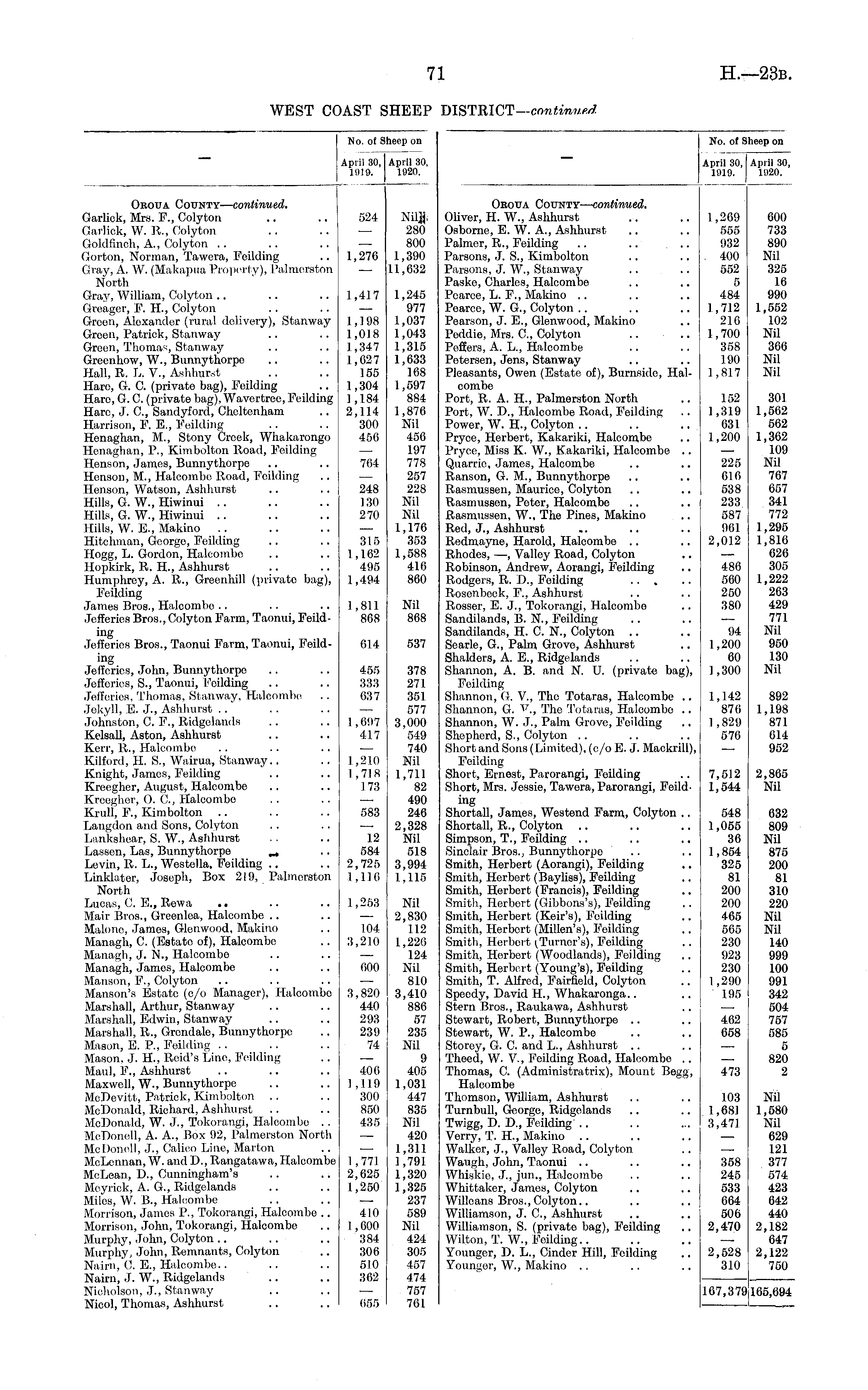 No. of 5 April 30, 1919. Iheep on April 30, 1920. Oeoua County— continued. Garlick, Mrs. F., Colyton Garlick, W. R., Colyton Goldfinch, A., Colyton Gorton, Norman, Tawera, Feilding Gray, A. W. (Makapua Property), Palmerston North Gray, William, Colyton Greager, F. IL, Colyton Green, Alexander (rural delivery), Stanway Green, Patrick, Stanway Green, Thomas, Stanway Grecnhow, W., Bunnythorpo Hall, R. L. V., Ashhurst Hare, G. G (private bag), Feilding Hare, G. C. (private bag), Wavertree, Feilding Hare, J. C, Sandyford, Cheltenham Harrison, F. E., Feilding Henaghan, M., Stony Crook, Whakarongo Hcnaghan, P., Kimbolton Road, Plodding Henson, James, Bunnythorpo Henson, M., Halcombe Road, Feilding Henson, Watson, Ashhurst Hills, G. W., Hiwinui Hills, G. W., Hiwinui Kills, W. E., Makino .. Hitehman, George, Feilding Hogg, L. Gordon, Halcombe Hopkirk, R. H., Ashhurst Humphrey, A. R., Greenhill (private bag), Feilding James Bros., Halcombe Jcfferies Bros.,Colyton P'arm, Taonui, Feilding Jefferies Bros., Taonui Farm, Taonui, Feilding Jefferies, John, Bunnythorpo Jefferies, S., Taonui, Podding Jefferies, Thomas, Stanway, Halcombe Jekyll, E. J., Ashhurst Johnston, C. P., Ridgolands Kelsall, Aston, Ashhurst Kerr, R., Halcombe Kilford, H. S., Wairua, Stanway.. Knight, James, I'eilding Kreegher, August, Halcombe Kroegher, O. 0., Halcombo Krull, F., Kimbolton Langdon and Sons, Colyton Lankshear, S. W., Ashhurst Lassen, Las, Bunnythorpe _ Levin, R. L., Westella, Feilding Linklator, Joseph, Box 219, Palmorston North Lucas, C. E., Rcwa .. Mair Bros., Greenlea, Halcombe Malono, James, Glenwood, Makino Managh, G (Estate of), Halcombe Managh, J. N., Halcombe Managh, James, Halcombe Manson, P., Colyton Manson's Estate (c/o Manager), Halcombe Marshall, Arthur, Stanway Marshall, Edwin, Stanway Marshall, R., Grendale, Bunnythorpo Mason, E. P., Feilding Mason, J. H., Reid's Line, Feilding Maul, P., Ashhurst Maxwell, W., Bunnythorpe McDevitt, Patrick, Kimbolton McDonald, Richard, Ashhurst McDonald, W. J., Tokorangi, Halcombe . . McDonell, A. A., Box 92, Palmerston North McDonell, J., Calico Line, Marton McLcnnan, W. and D., Rangatawa, Halcombe McLean, D., Cunningham's Meyrick, A. G., Ridgelands Miles, W. B., Halcombe Morrison, James P., Tokorangi, Halcombo .. Morrison, John, Tokorangi, Halcombe Murphy, John, Colyton Murphy, John, Remnants, Colyton Nairn, C. E., Halcombe.. Nairn, J. W., Ridgelands Nicholson, J., Stanway Nicol, Thomas, Ashhurst 524 1,276 1,417 1,198 1,018 1,347 1,627 155 1,304 1,1.84 2,114 300 456 764 248 130 270 315 1,162 495 1,494 1,811 868 614 455 333 637 1,697 417 1,210 1,718 173 Niljj. 280 800 1,390 11,632 1,245 977 1,037 1,043 1,315 1,633 168 1,597 884 1,876 Nil 456 197 778 257 228 Nil Nil 1,176 353 1,588 416 860 Nil 868 537 378 271 351 577 3,000 549 740 Nil 1,711 82 490 246 2,328 Nil 518 3,994 1,115 583 12 584 2,725 1,116 1,253 Nil 2,830 112 1,220 124 Nil 810 3,410 886 57 235 Nil 9 405 1,031 447 835 Nil 420 1,311 1,791. 1,320 1,325 237 589 Nil 424 305 457 474 757 761 104 3,210 600 3,820 440 293 239 74 406 1,119 300 850 435 1,771 2,625 1,250 410 1,000 384 306 510 362 055